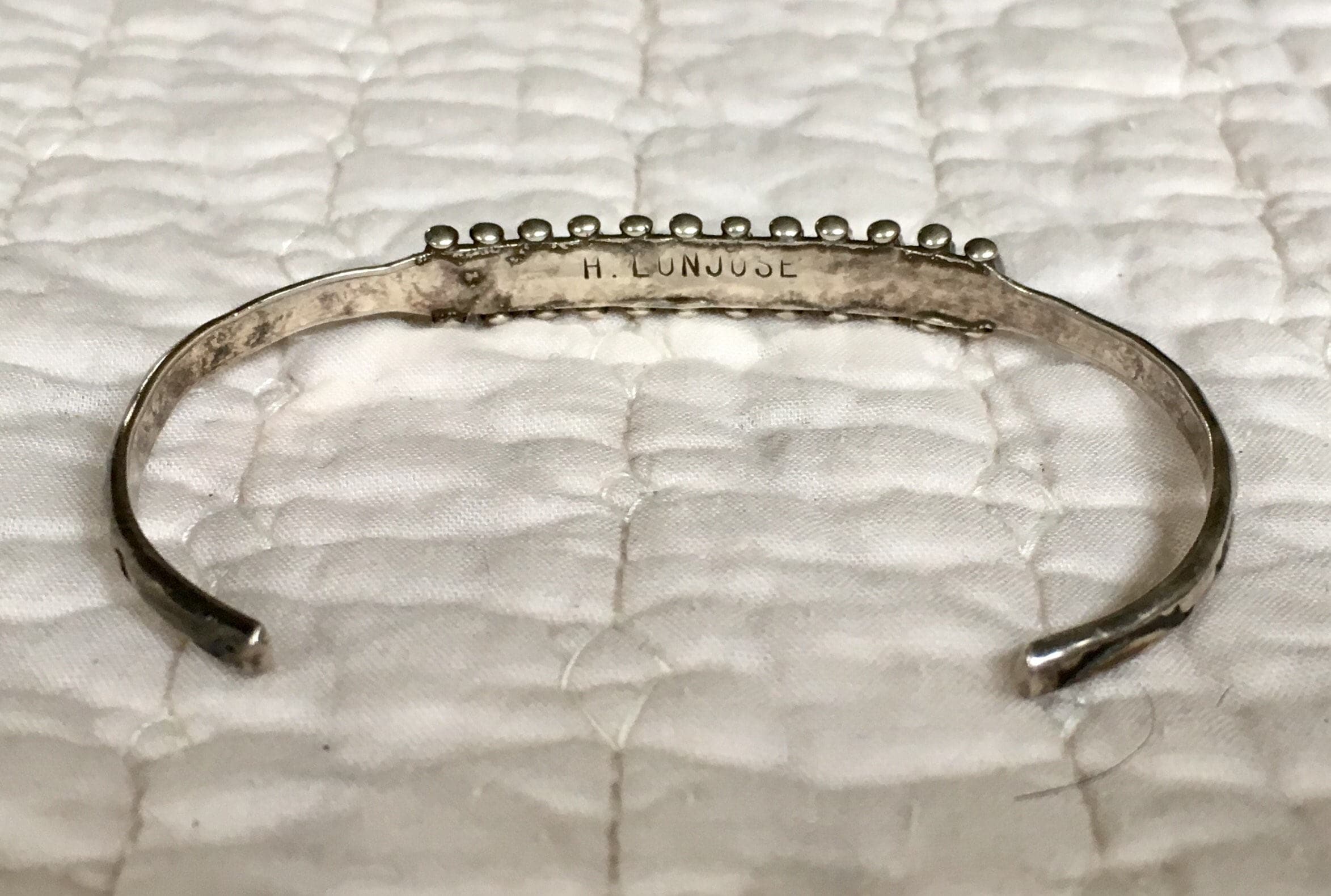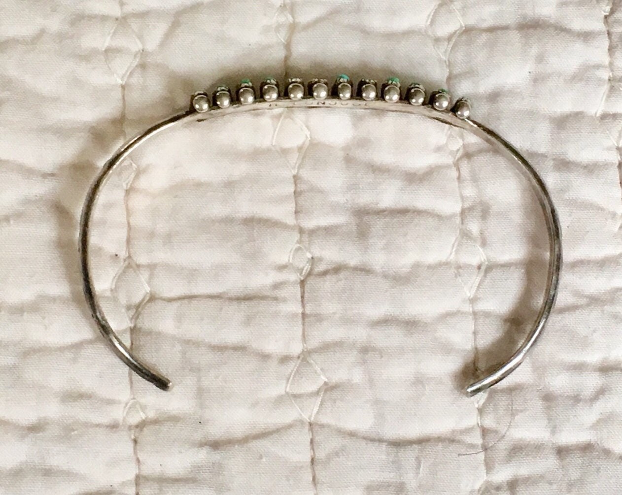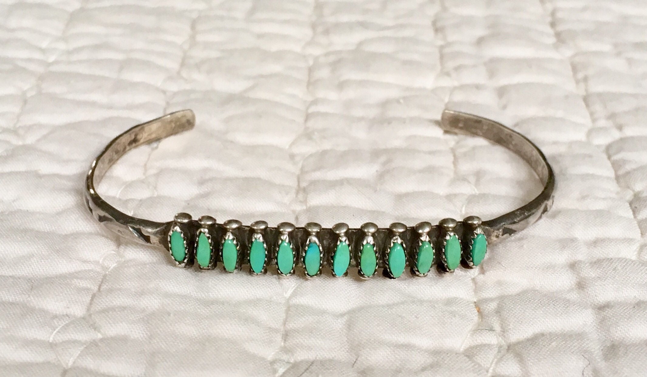 This sterling silver Zuni Needlepoint cuff bracelet is delicate and pretty with engraving on the sides of the band and 12 meticulously inset turquoise stones.
