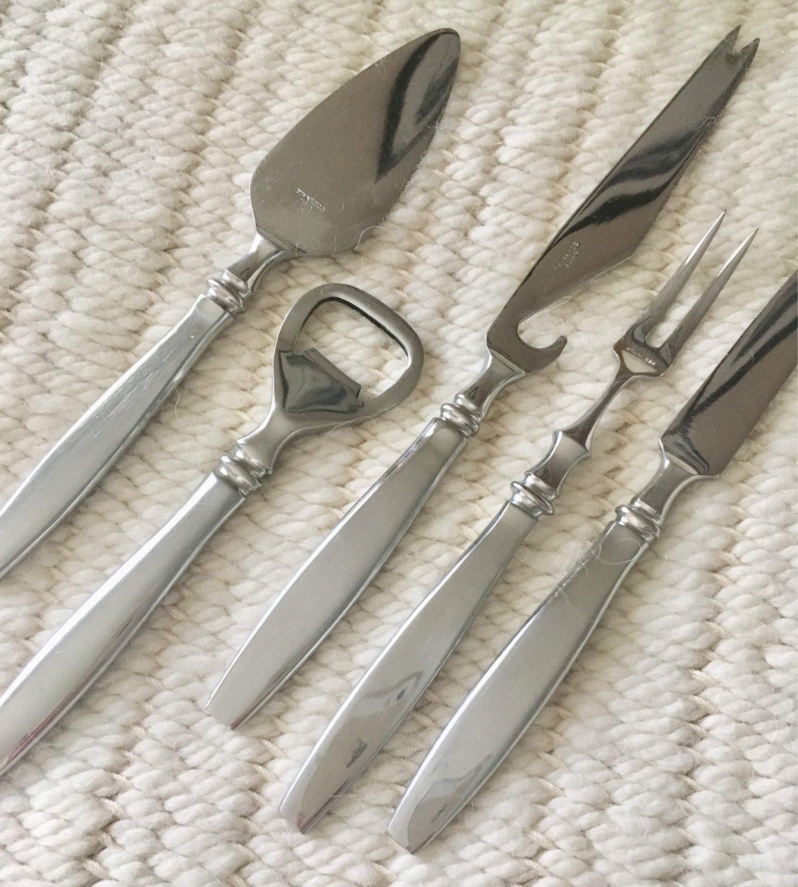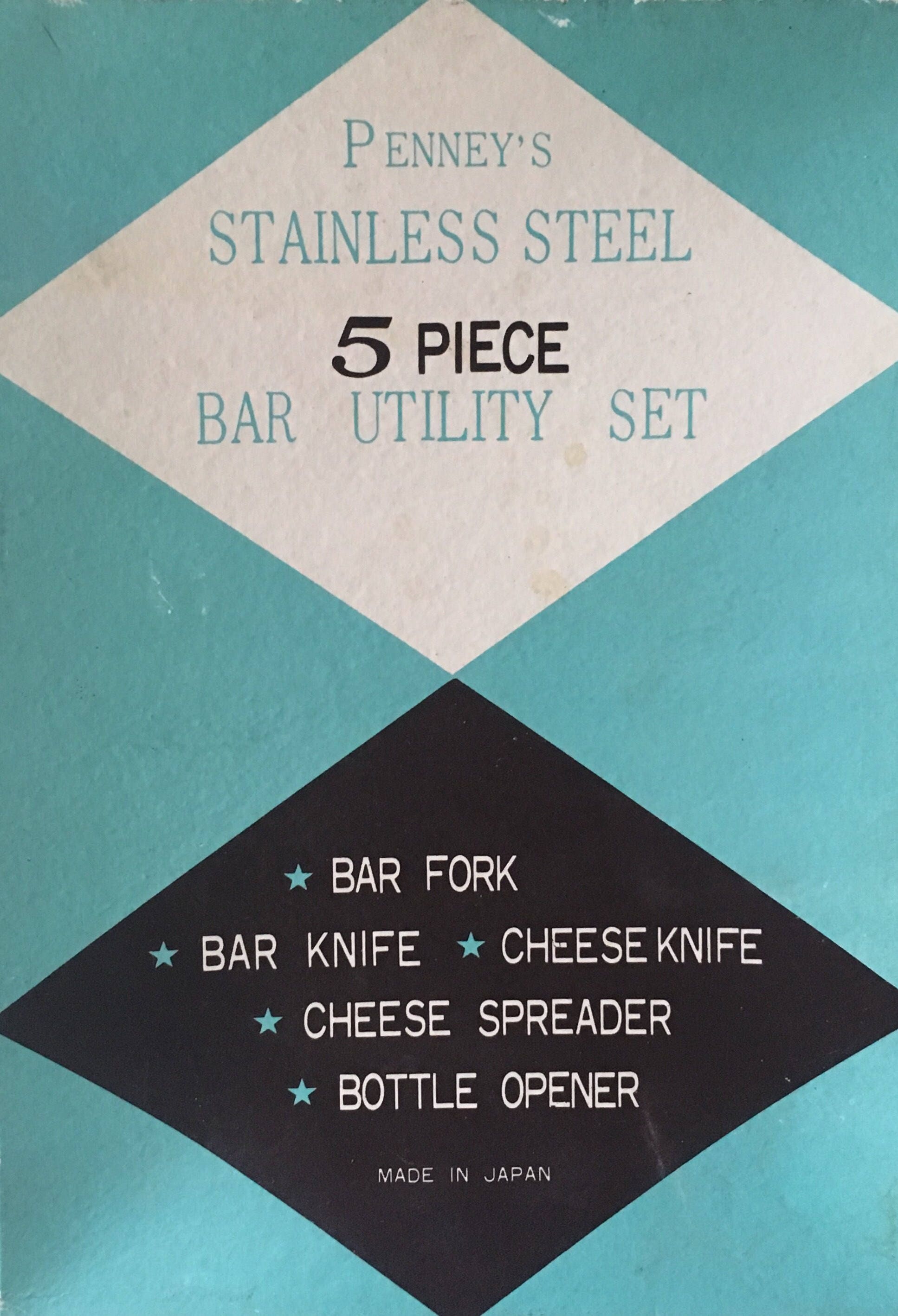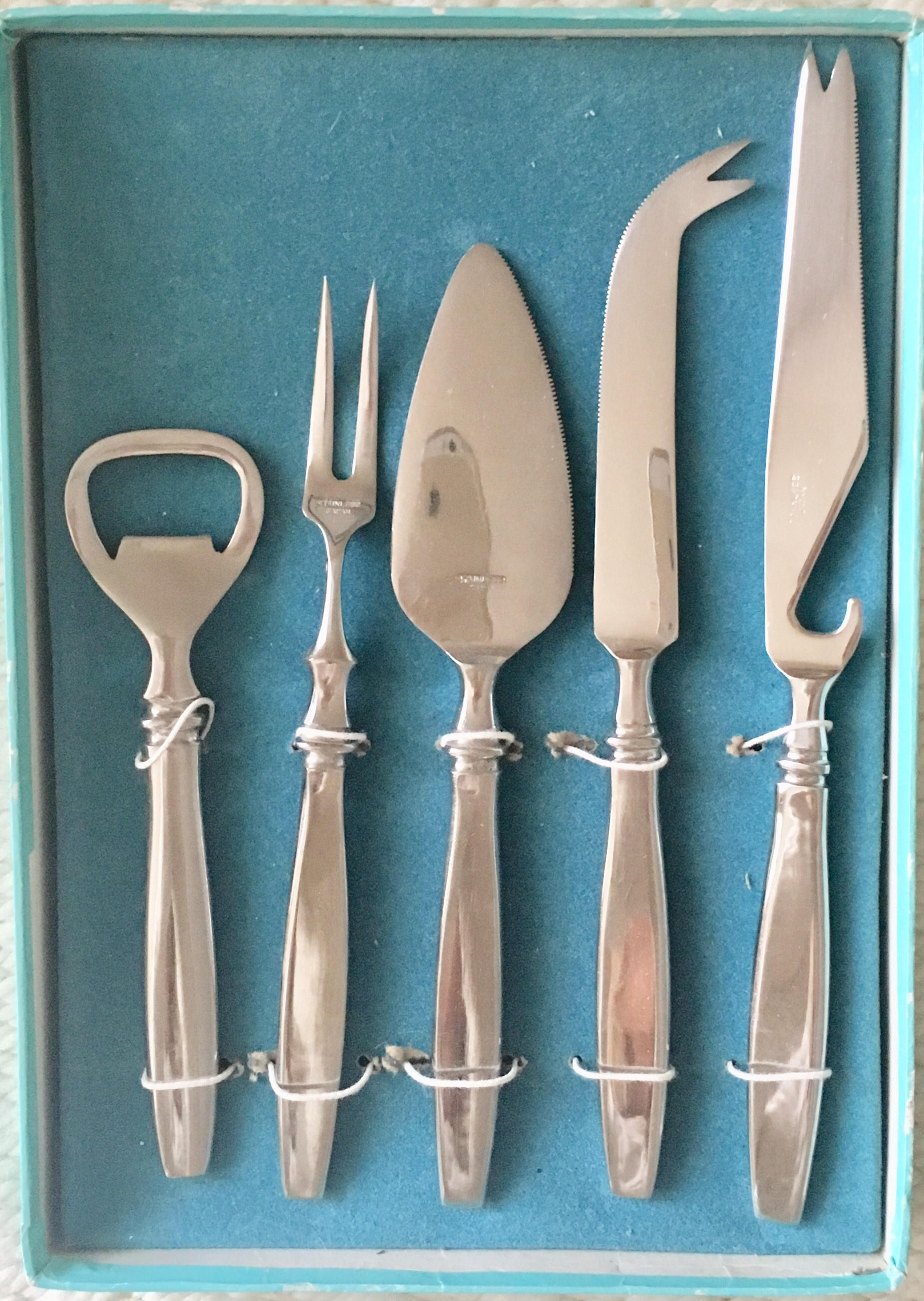 This vintage mid century barware set is stunning with it classic 1950s lines. Set includes bar fork, bar knife, cheese knife, cheese spreader and bottle opener.