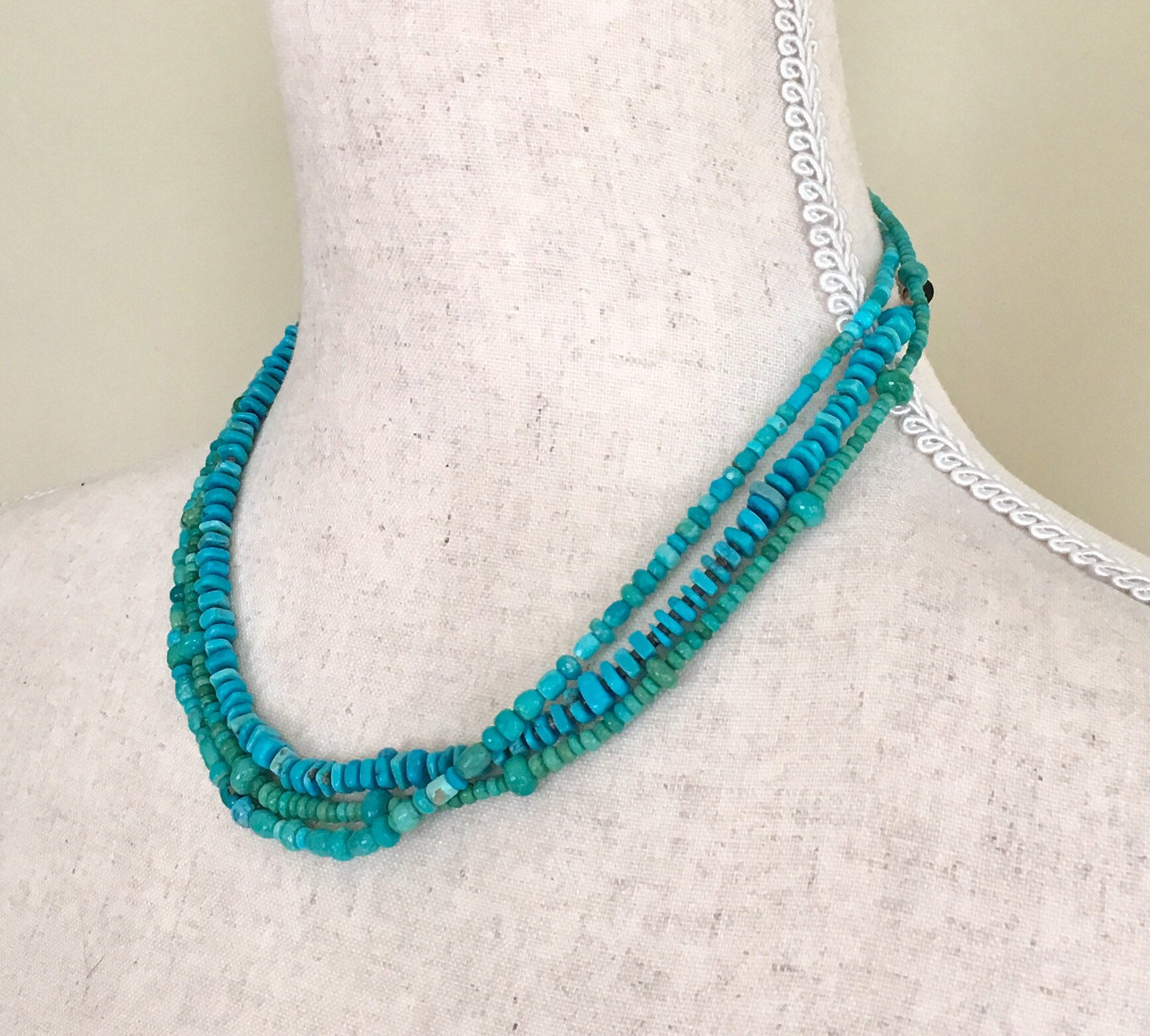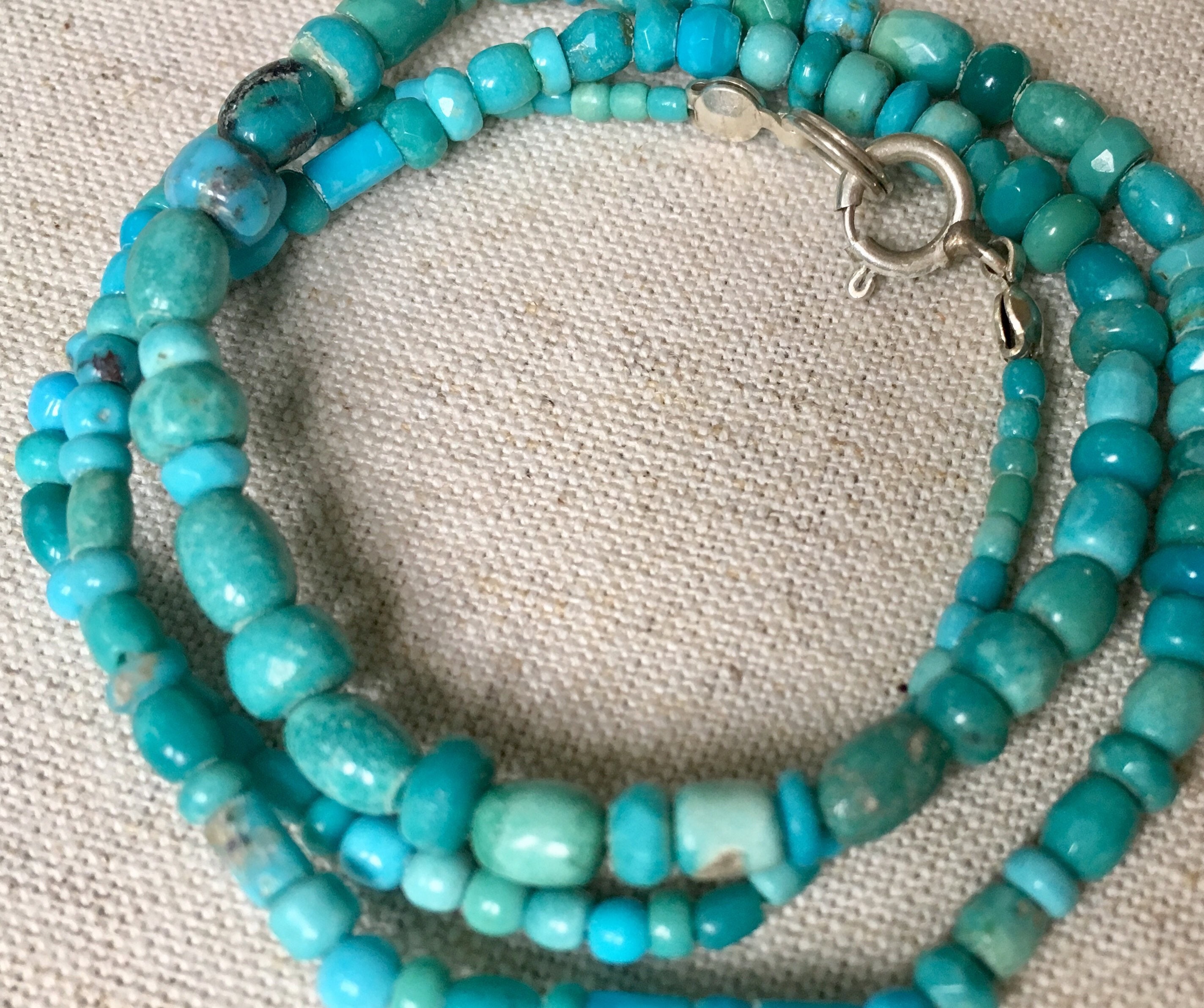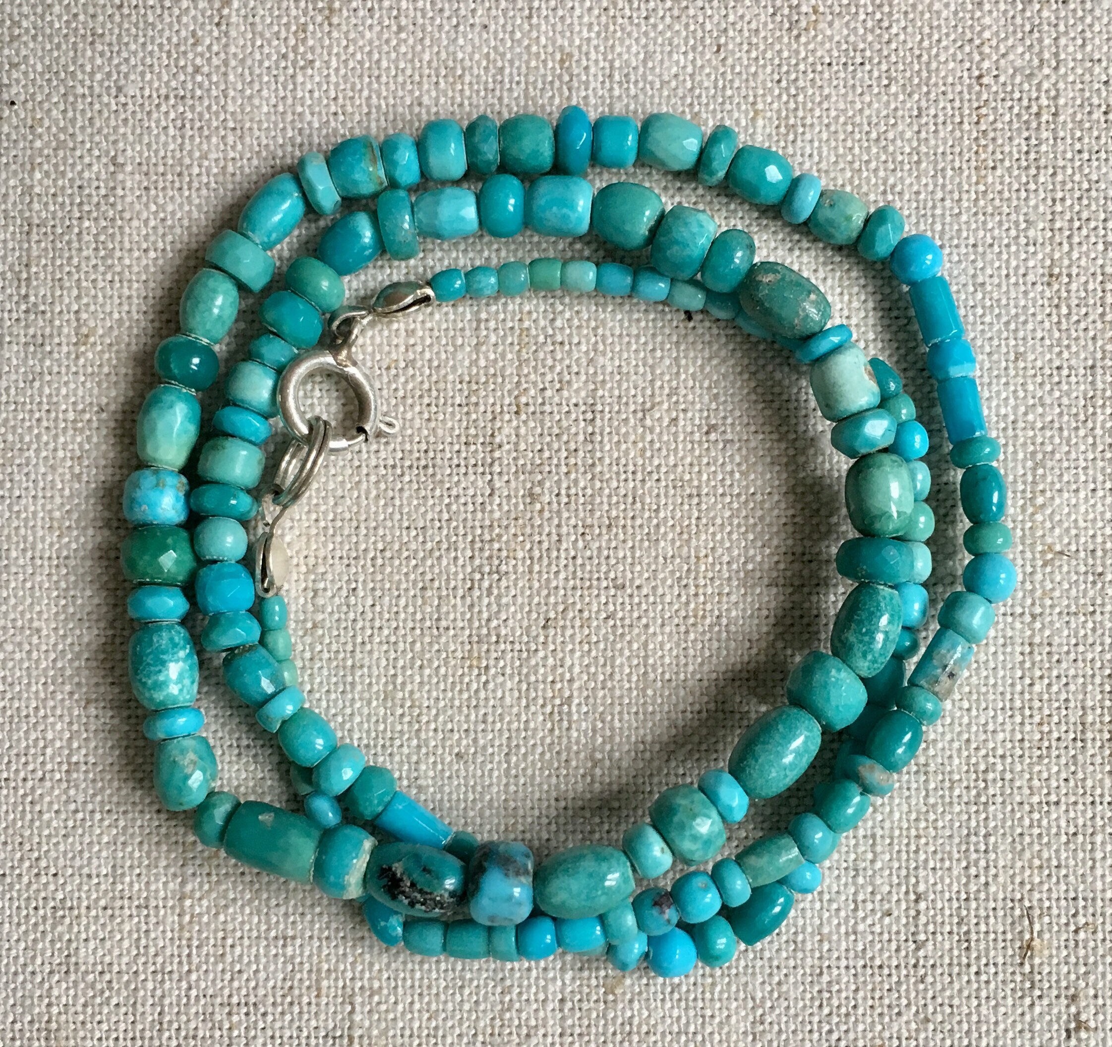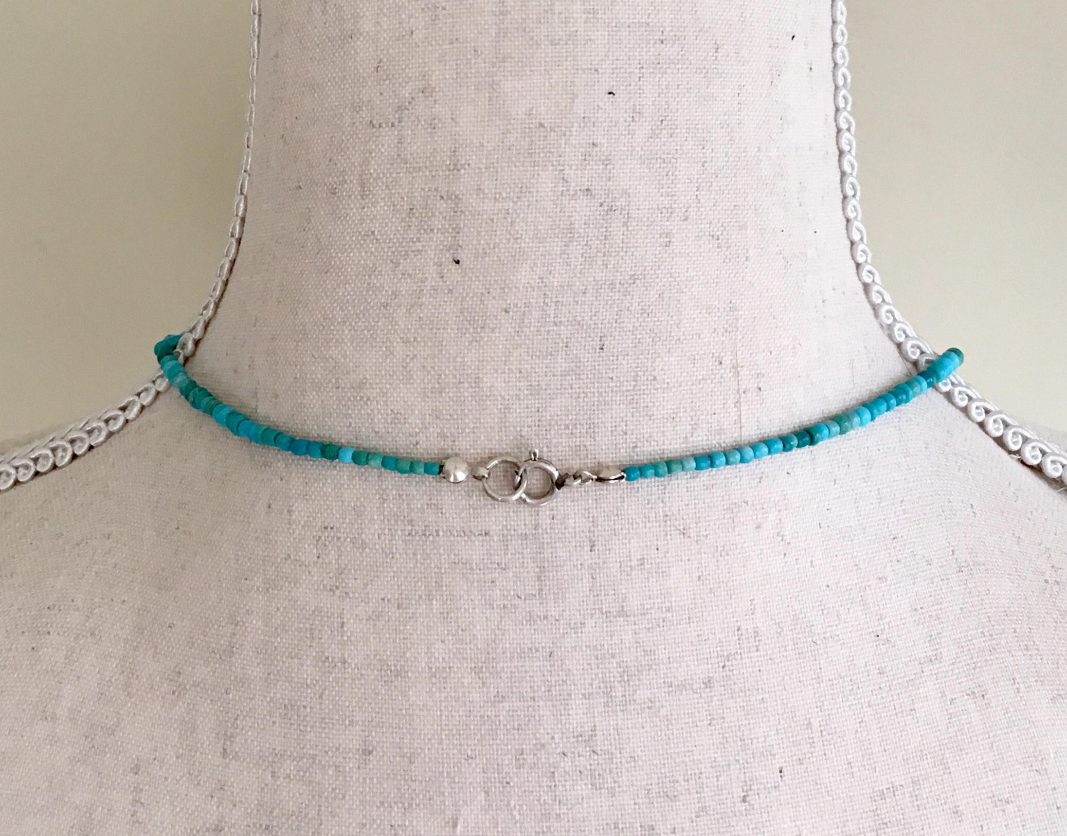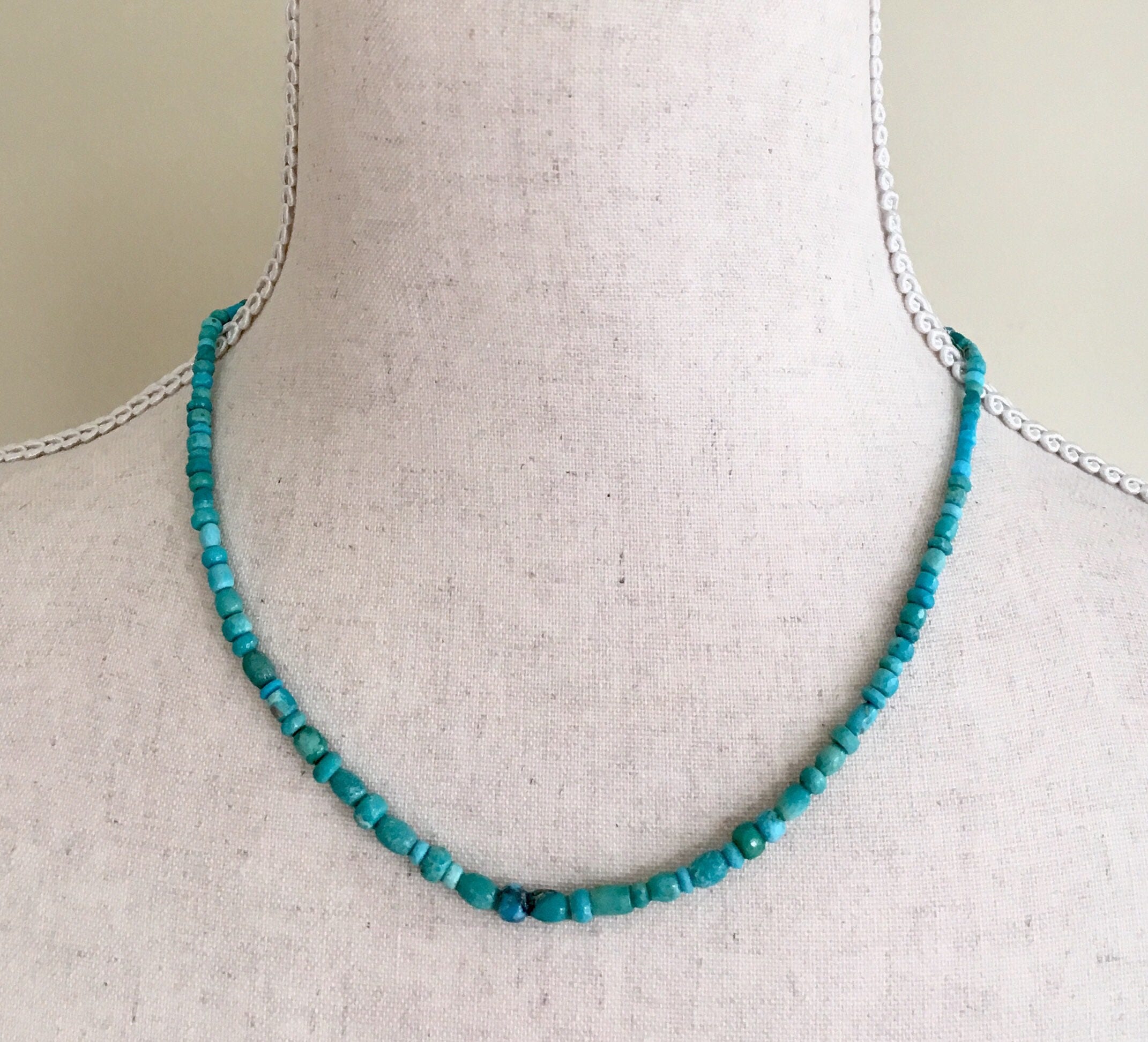 Beautifully crafted Southwest Native American turquoise bead heishi necklace with sterling silver clasp. Looks pretty on its own but we're partial to layering it up (see last photo) with other necklaces!