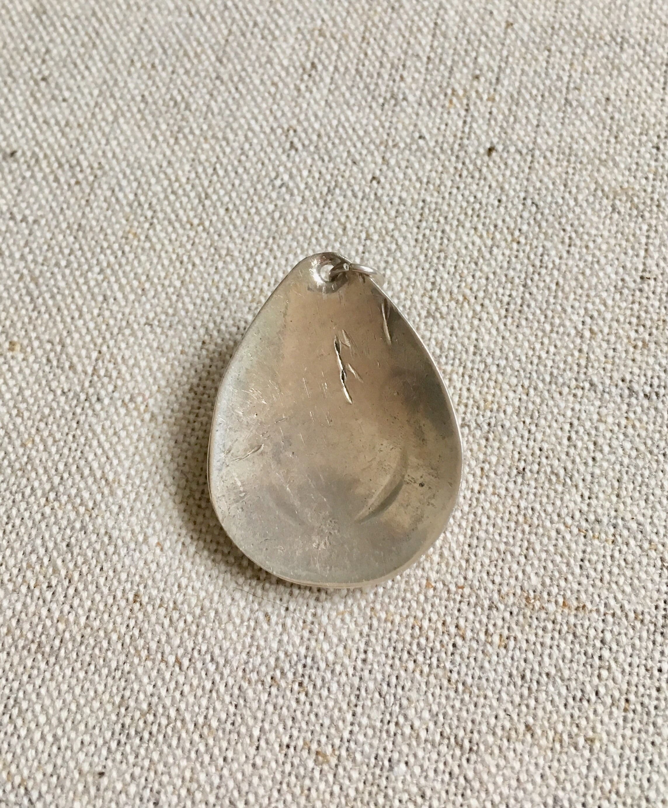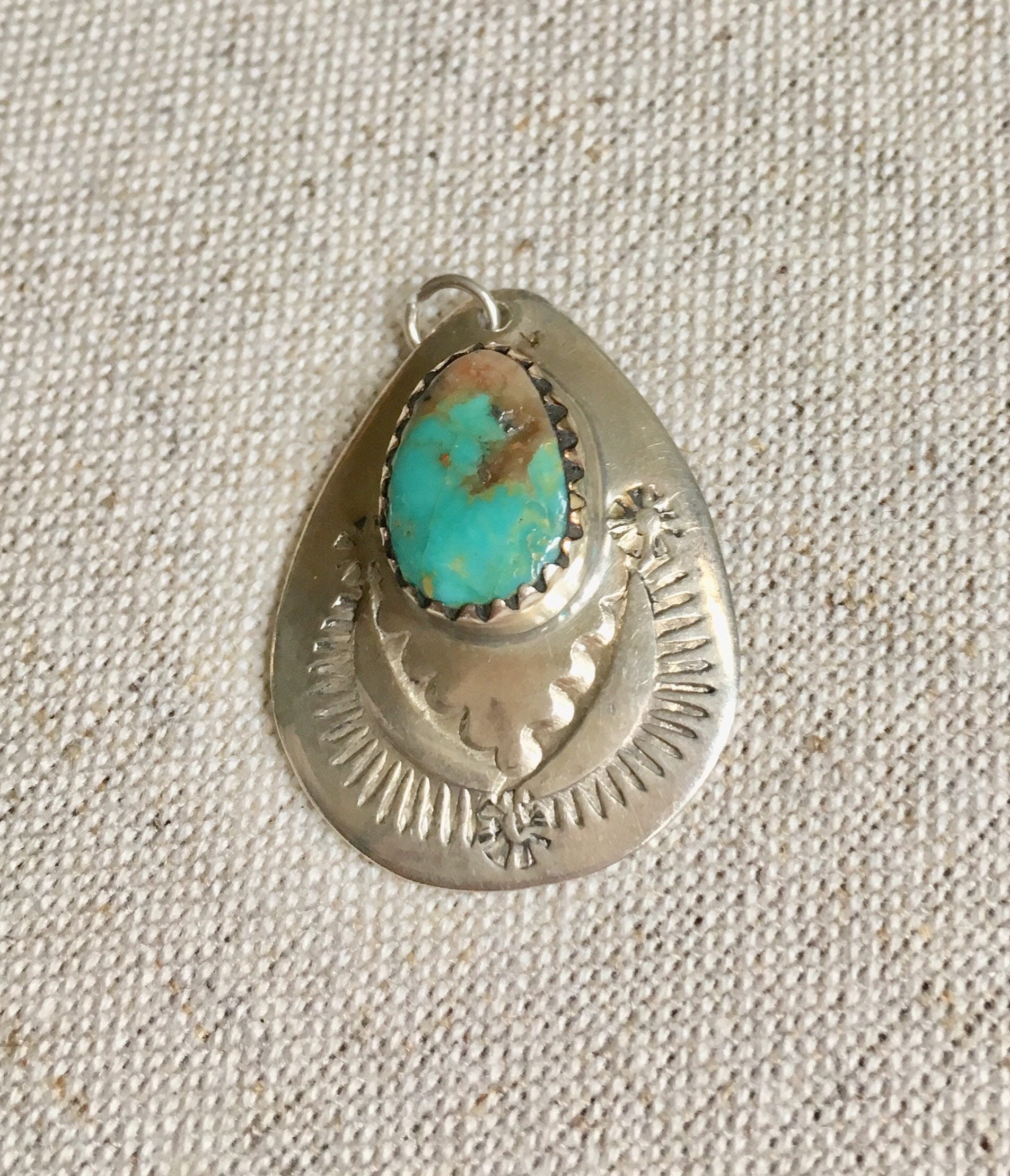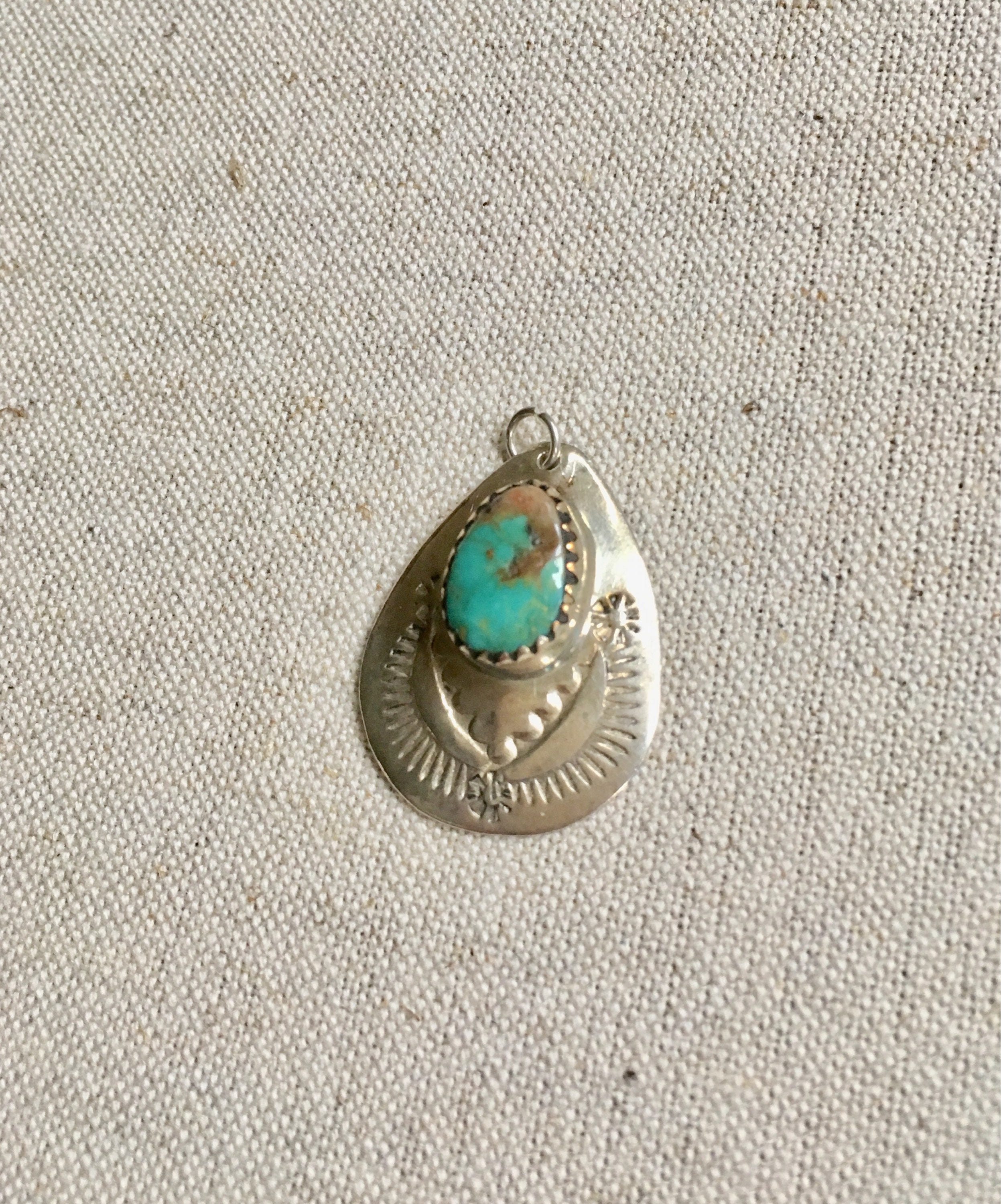 Navajo teardrop shaped sterling silver pendant with a beautiful turquoise center stone. Traditional Native American stampwork in the silverware.