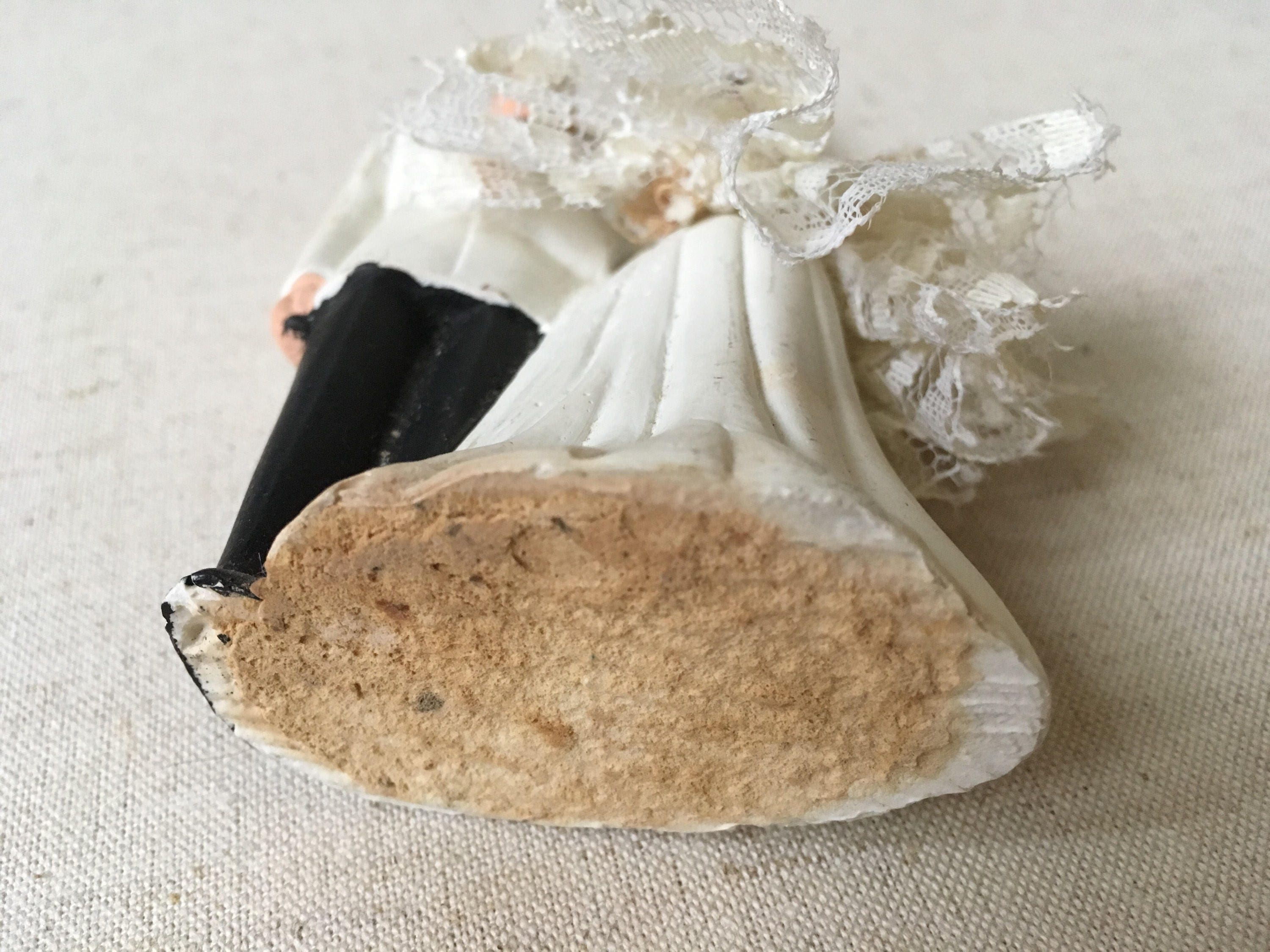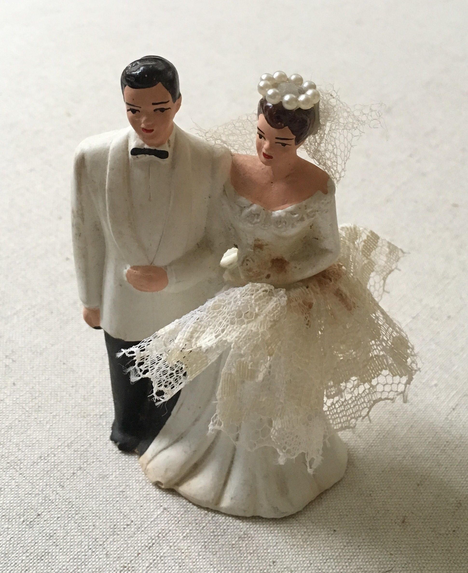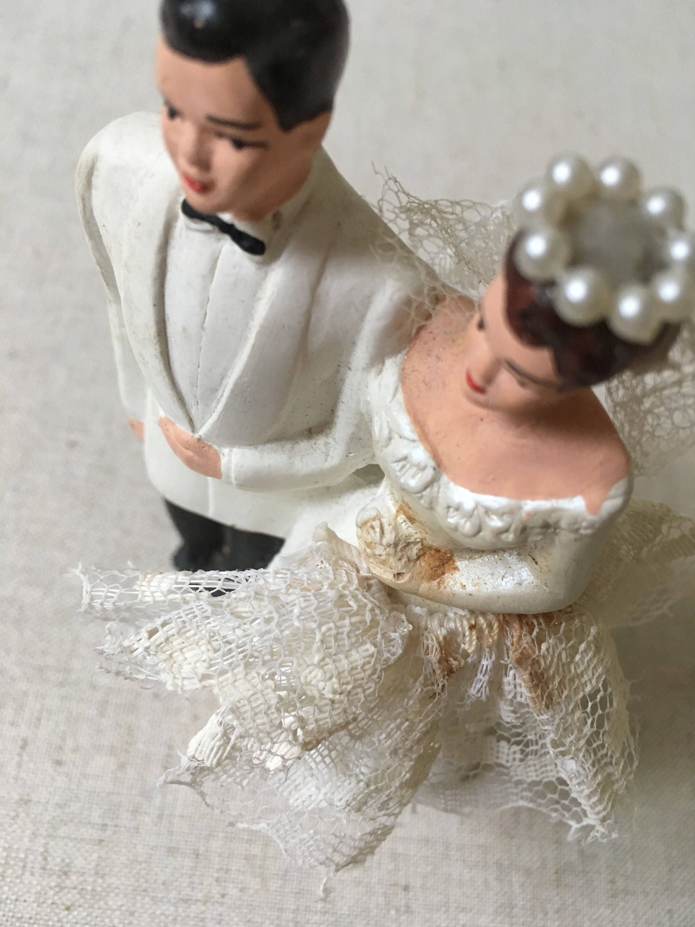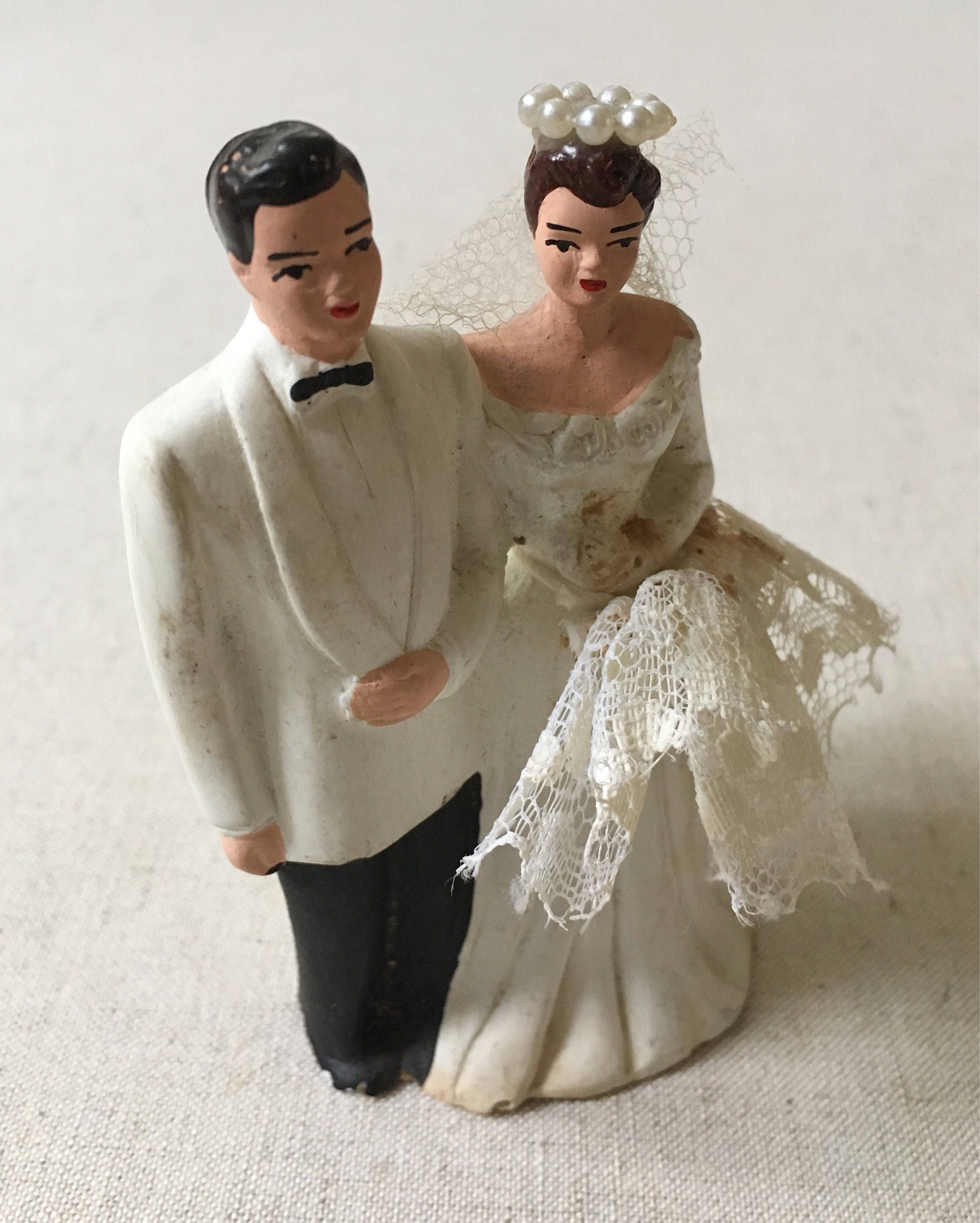 This adorable vintage 1950's chalkware wedding cake topper would be the perfect accessory for a retro wedding! The handsome bride and groom are still in good vintage condition with minor wear including loose wedding dress lace. This could be easily glued back in place where you want it.