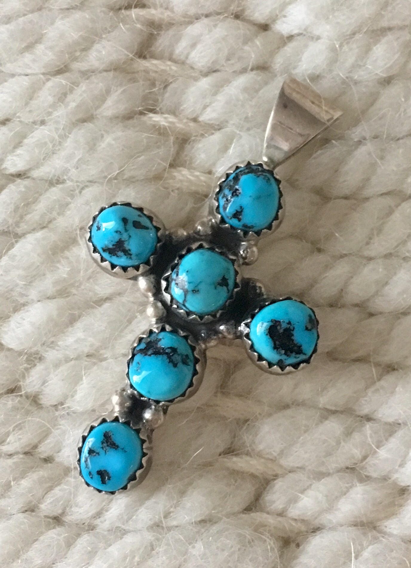 Vintage Native American Zuni sterling silver cross pendant with 6 bright blue inset turquoise stones. Lovely and solidly crafted.