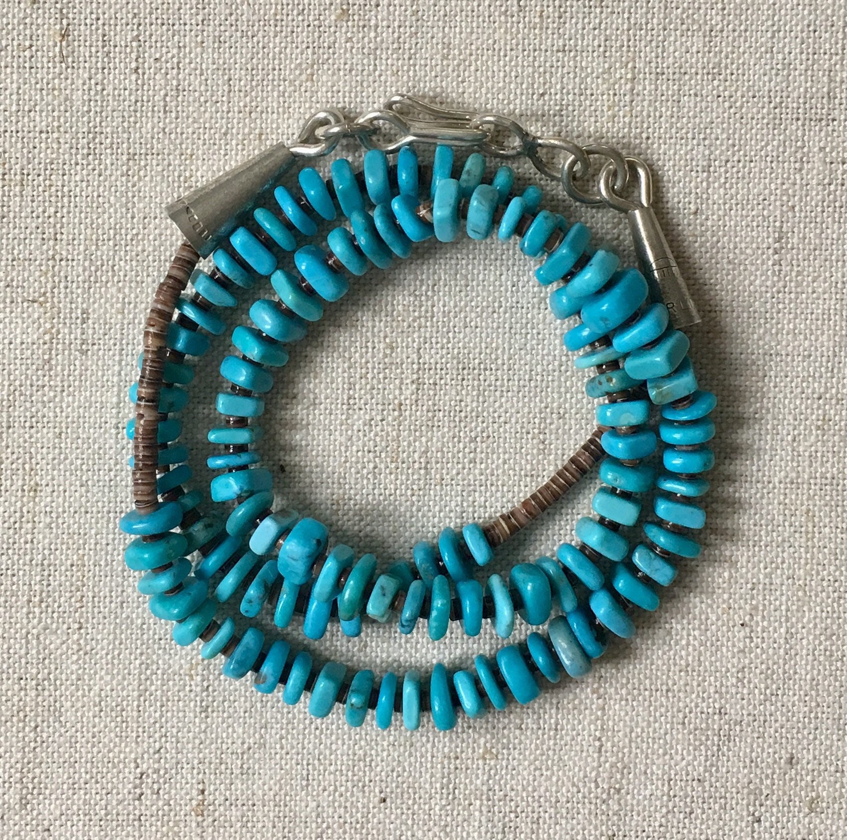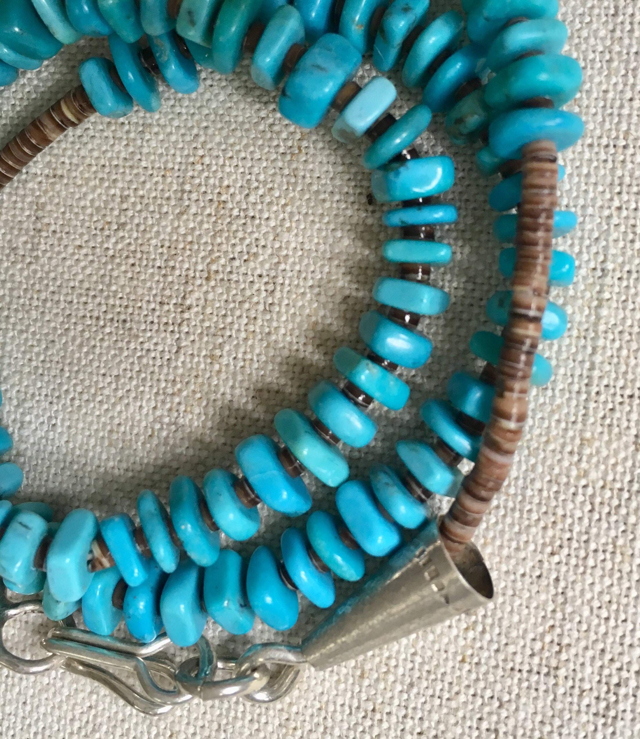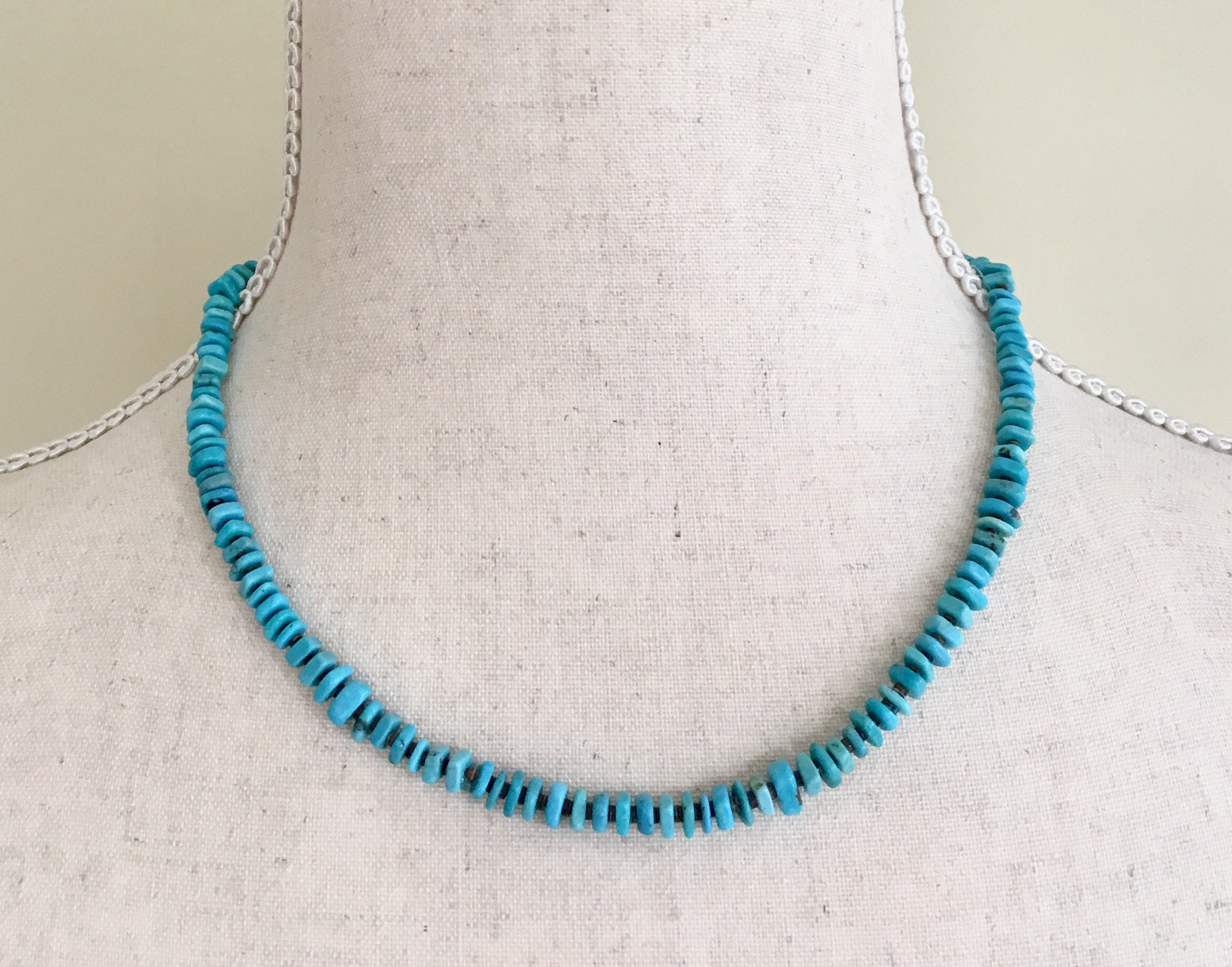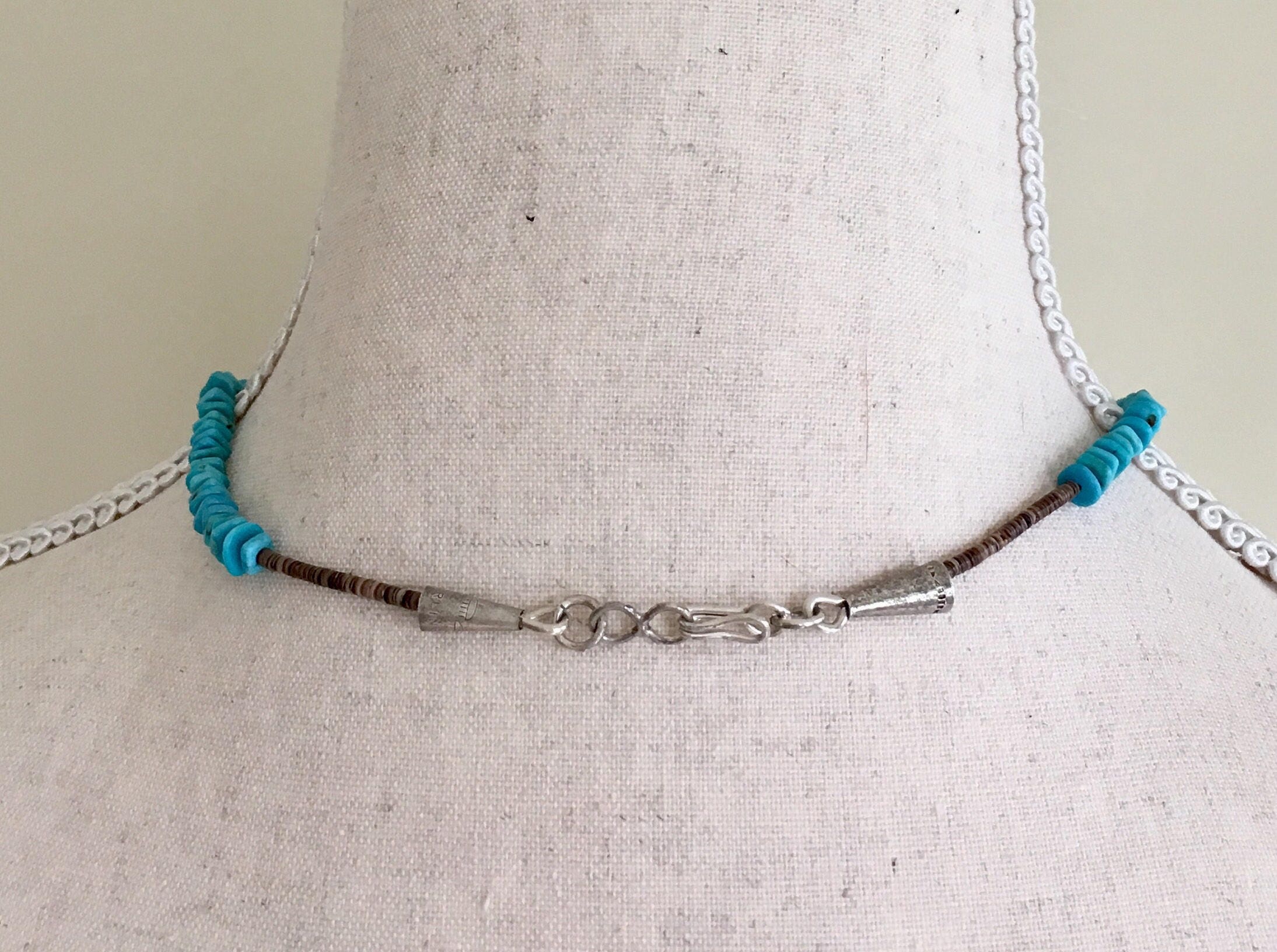 Beautifully crafted Southwest Native American turquoise bead and tiny shell heishi necklace with sterling silver clasp. Looks pretty on its own but we're partial to layering it up (see last photo) with other necklaces!