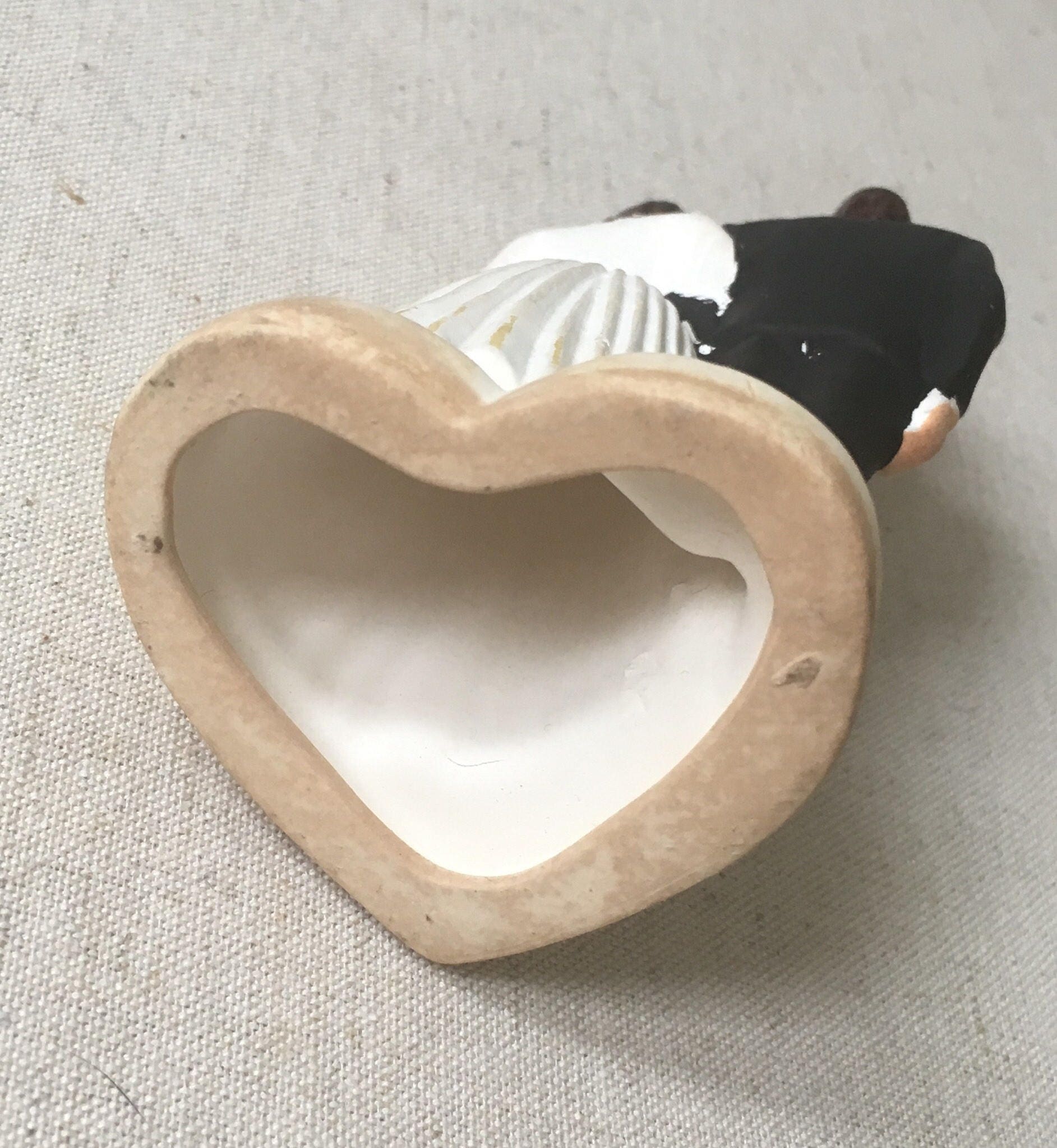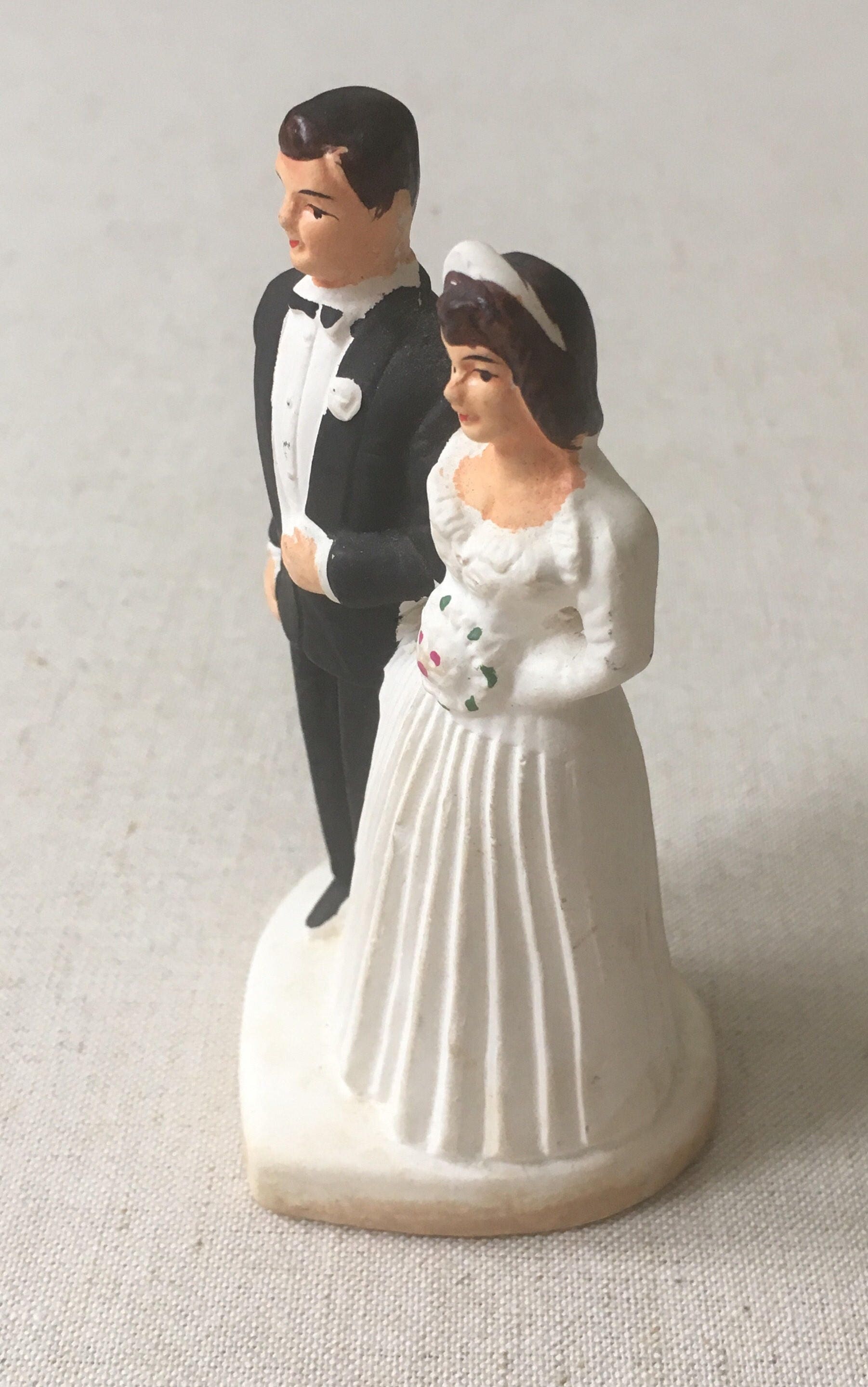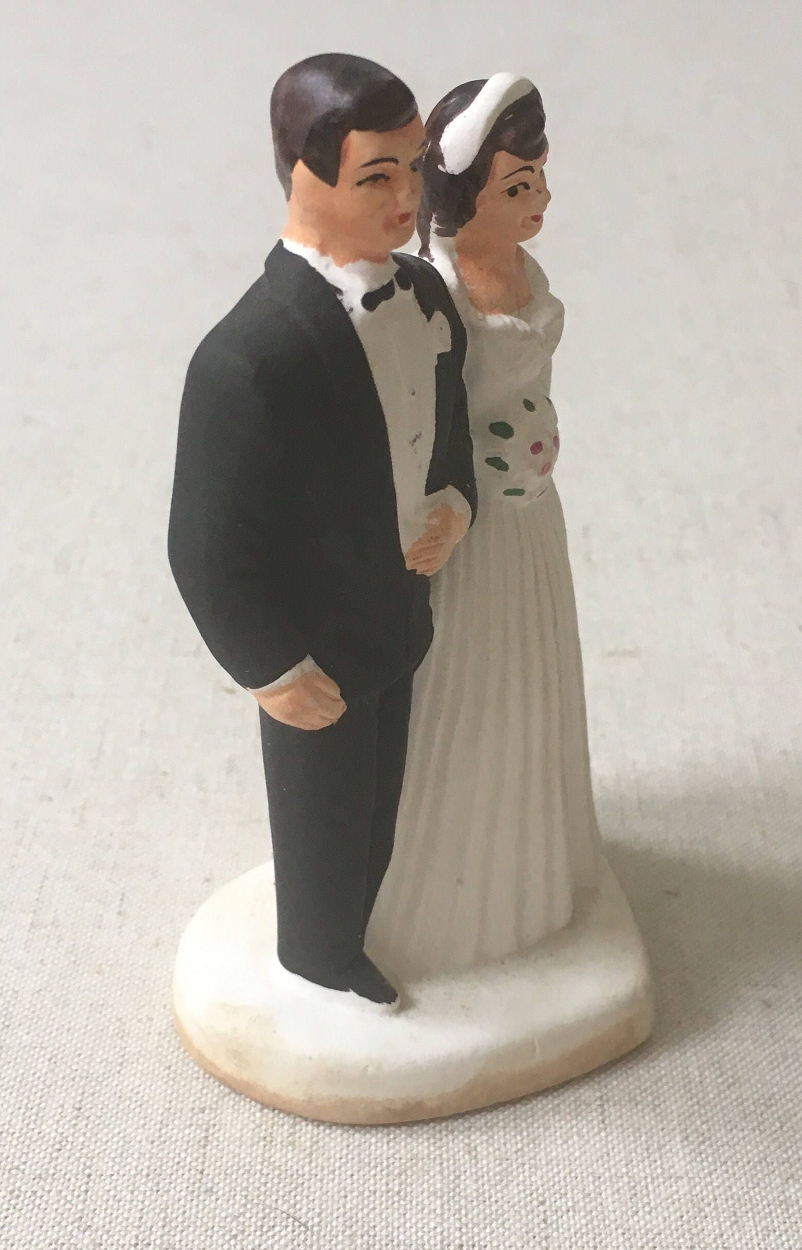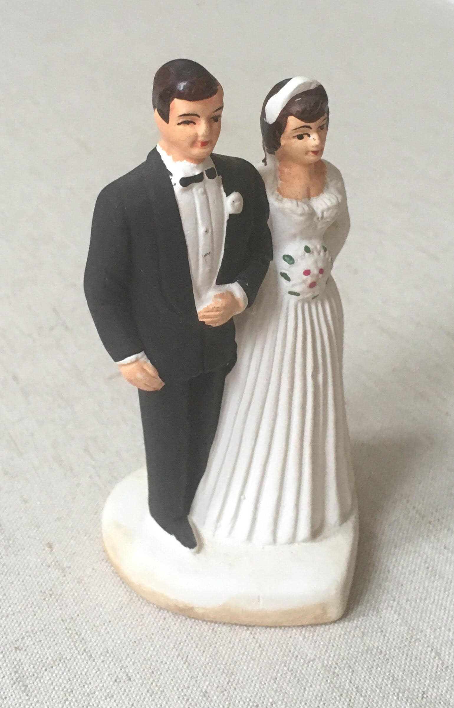 This whimsical vintage 1950's porcelain wedding cake topper would be the perfect accessory for a retro wedding! The handsome bride and groom are still in good vintage condition and stand on a cute, heart-shaped base.