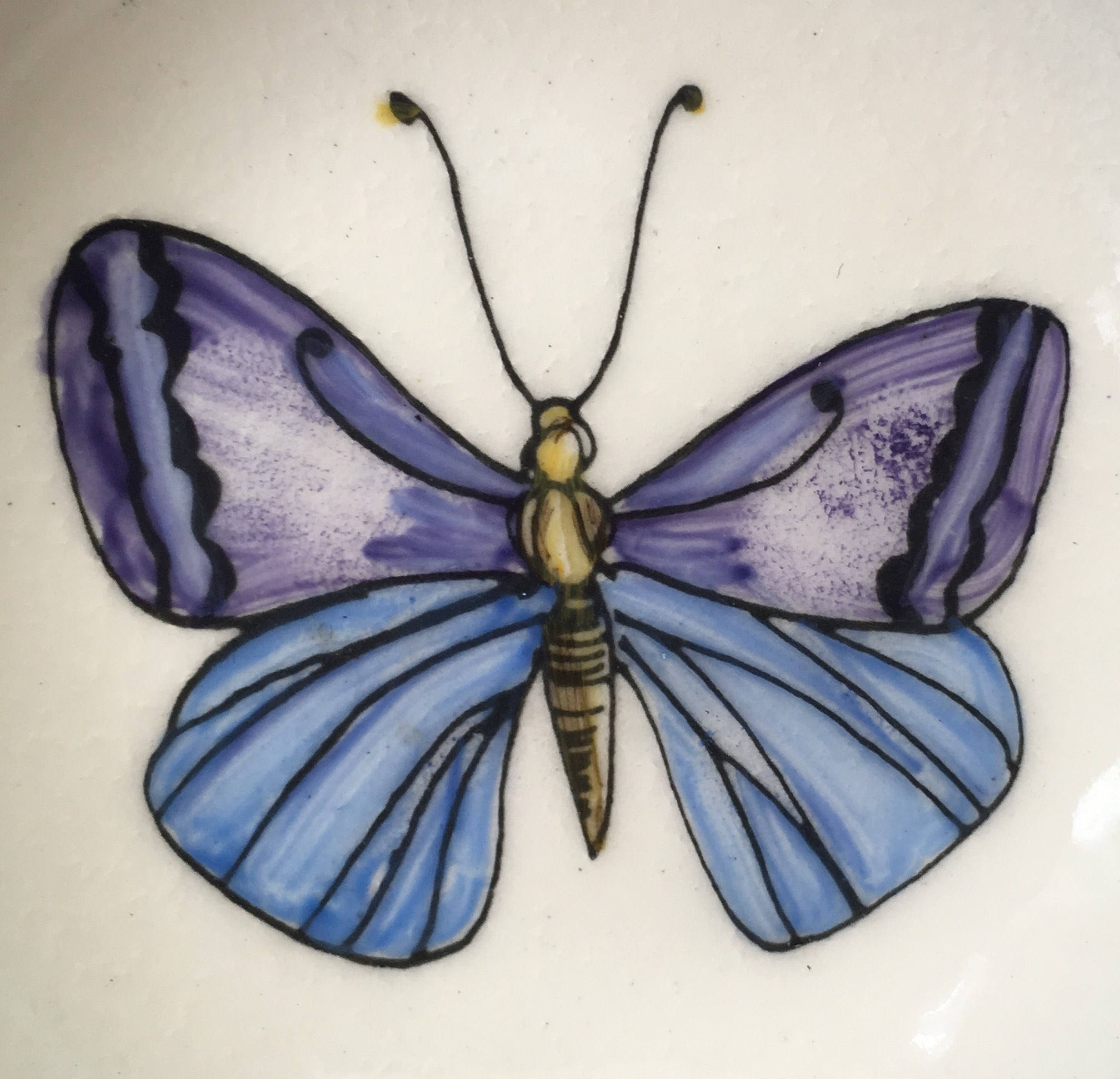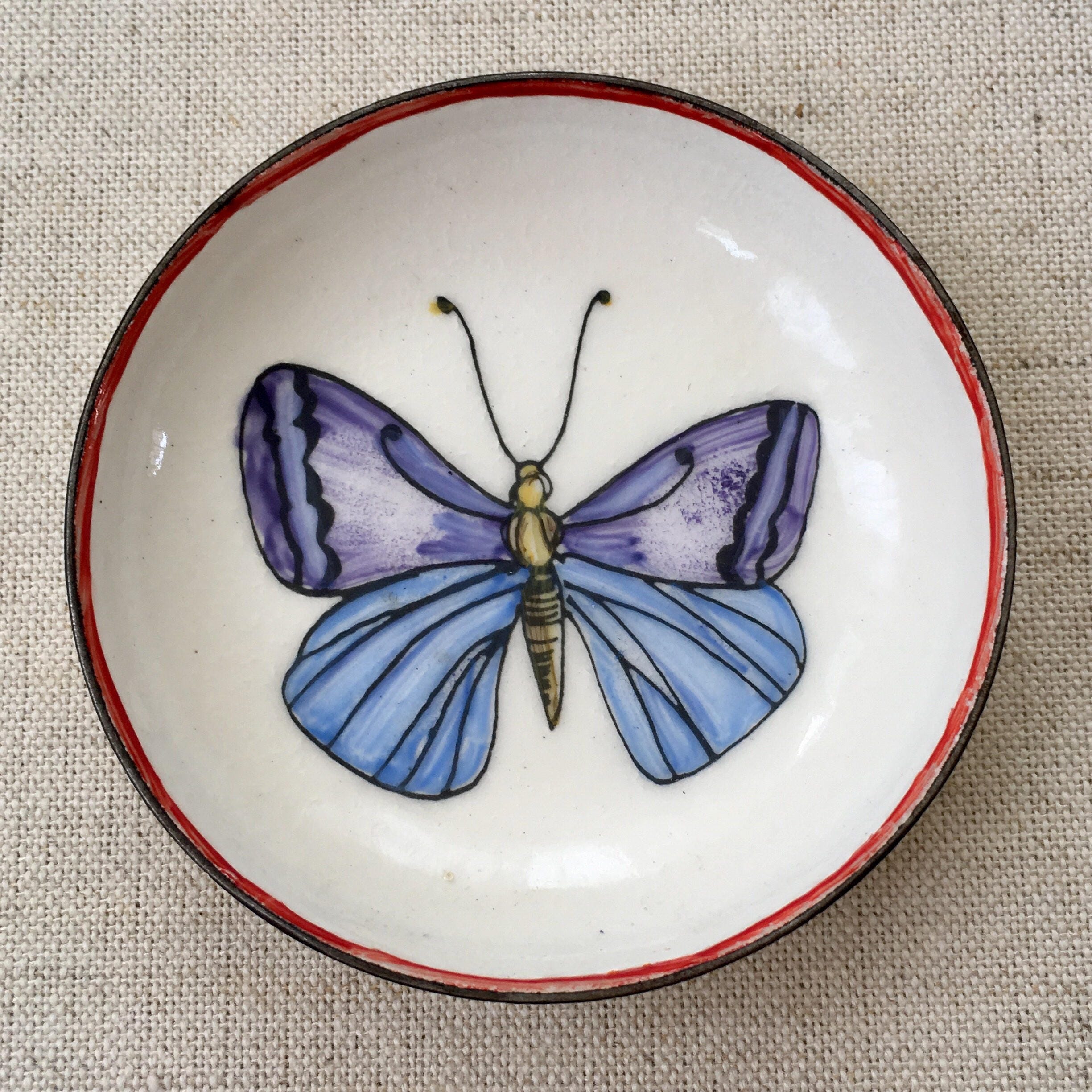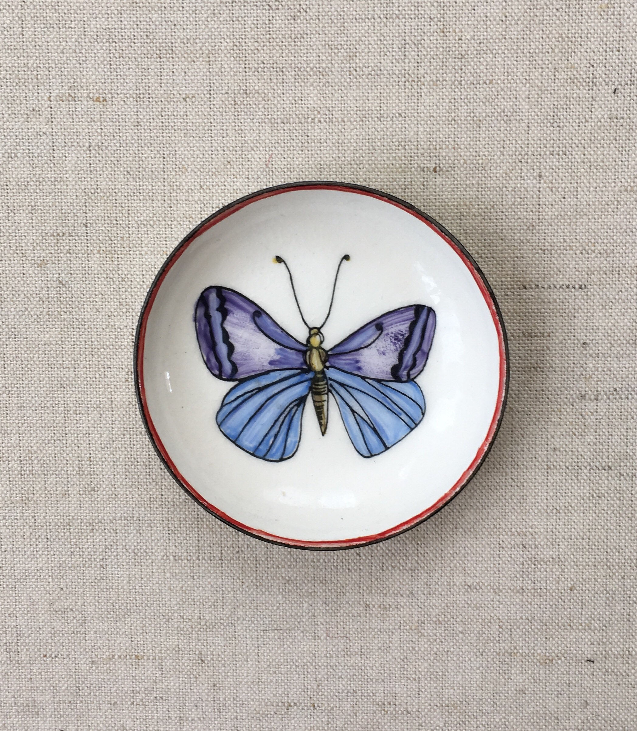 Cute vintage enamel ring dish with hand painted butterfly and red border.
