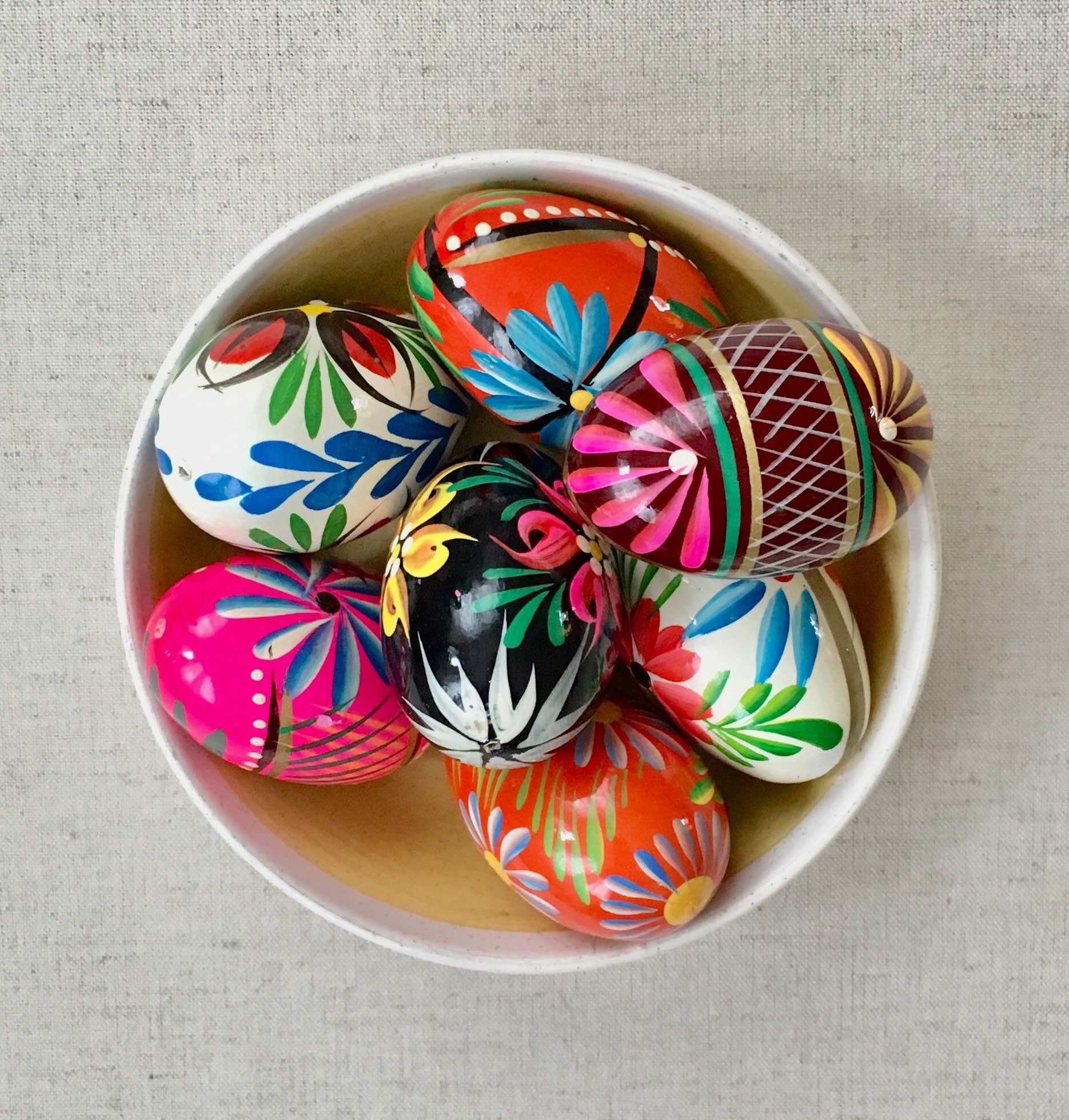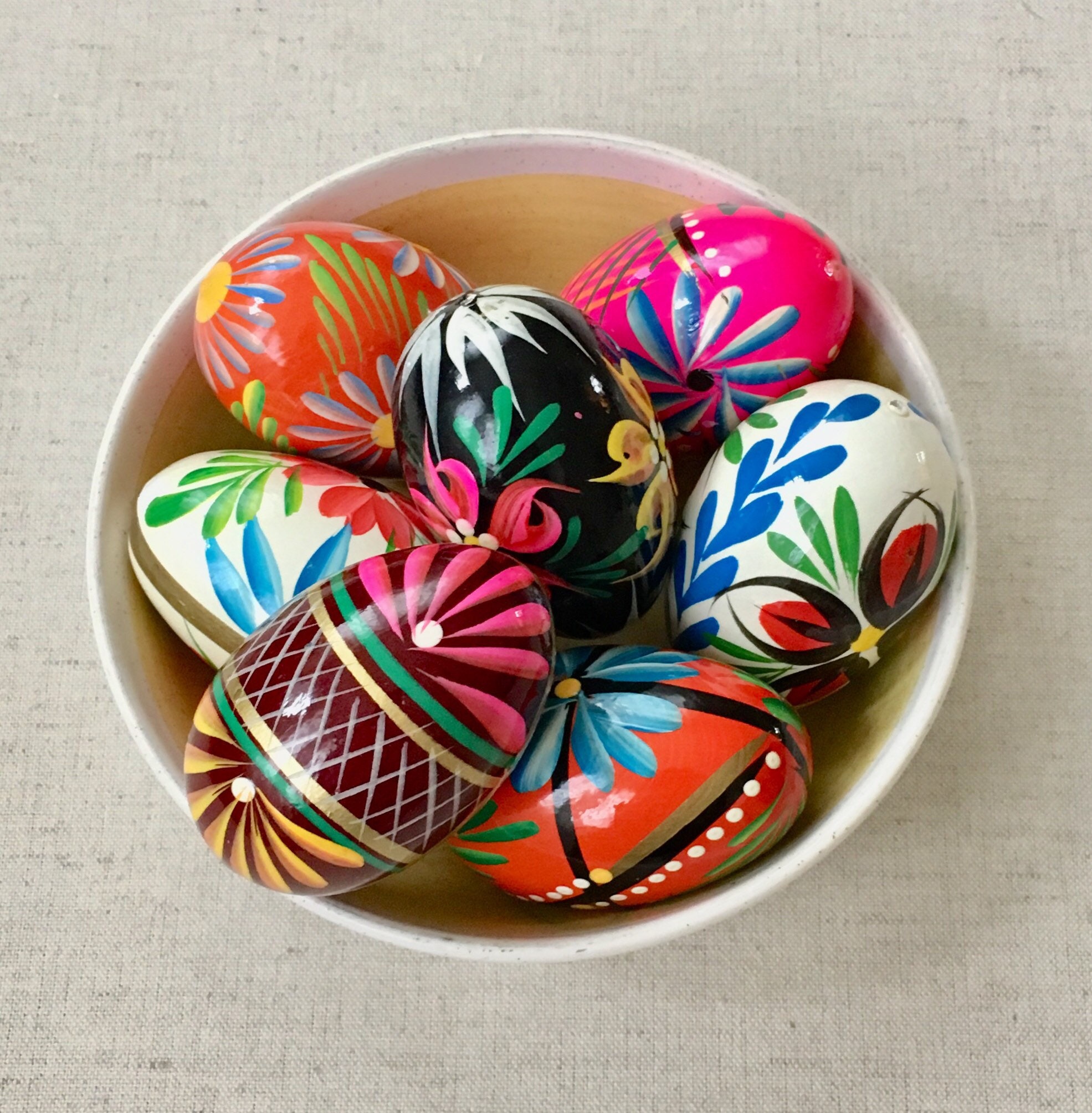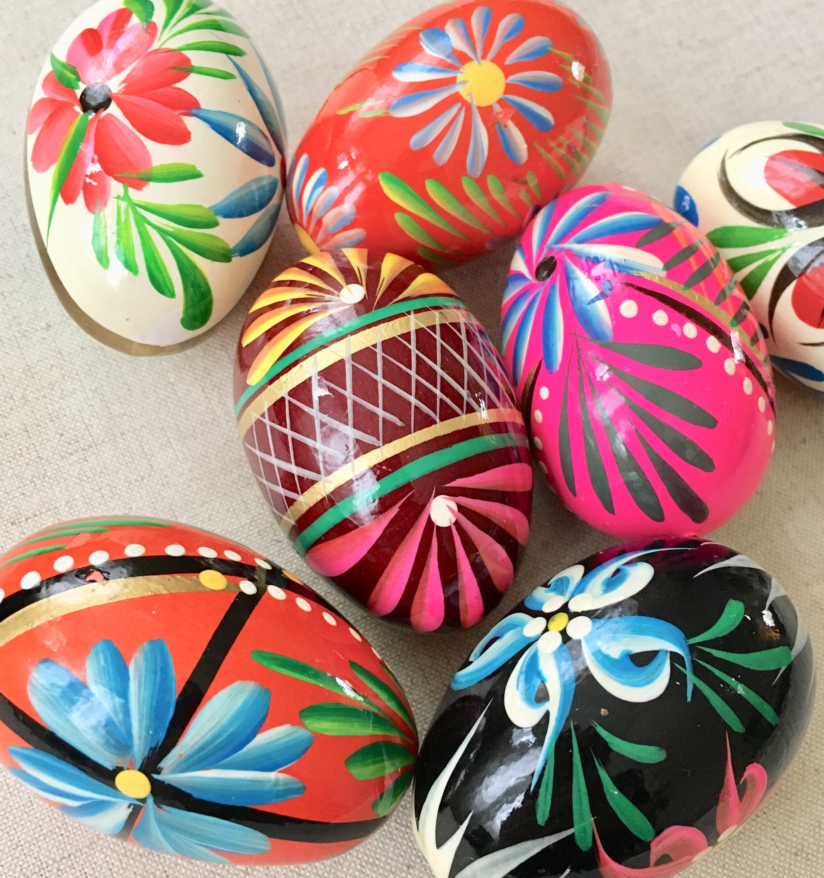 Adorable lot of 7 vintage wooden Easter eggs lovingly hand-painted in bright & vibrant colors.
