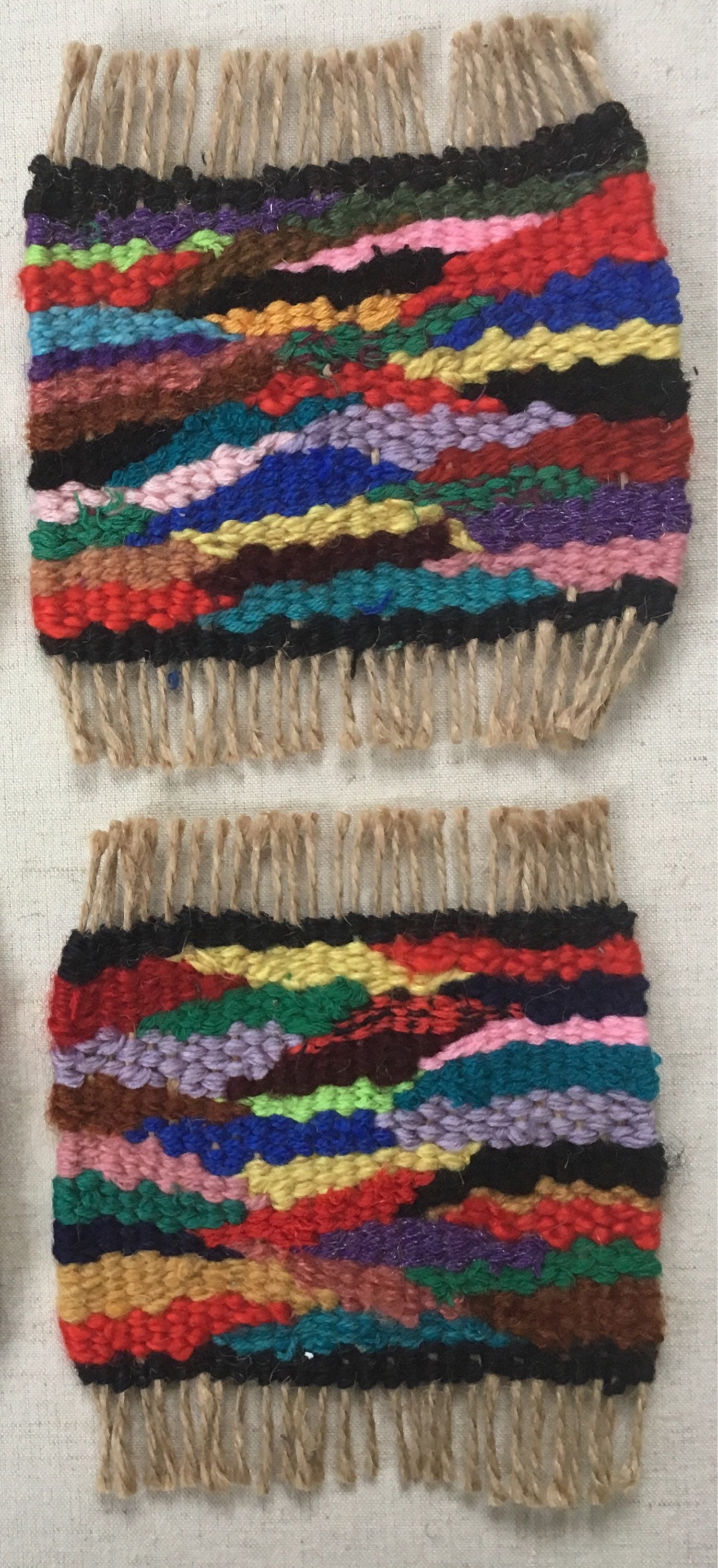 Great set of 6 bright & colorful vintage hand woven coasters with hemp fringe.