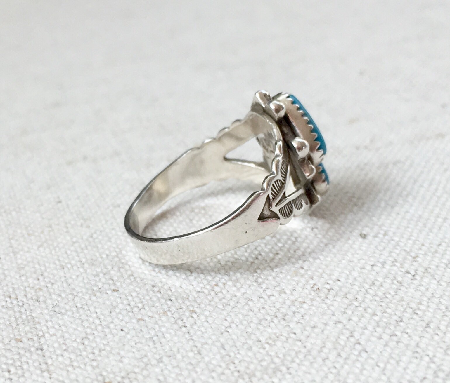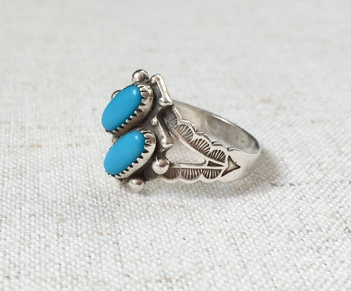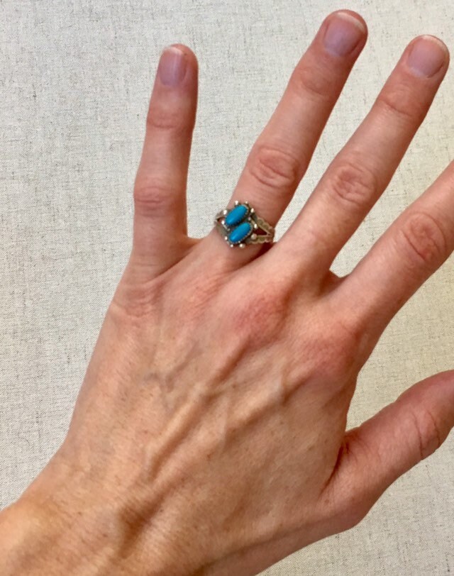 Vintage Bell Trading-style Native American ring with two turquoise stones and hand stamped sterling silver band.