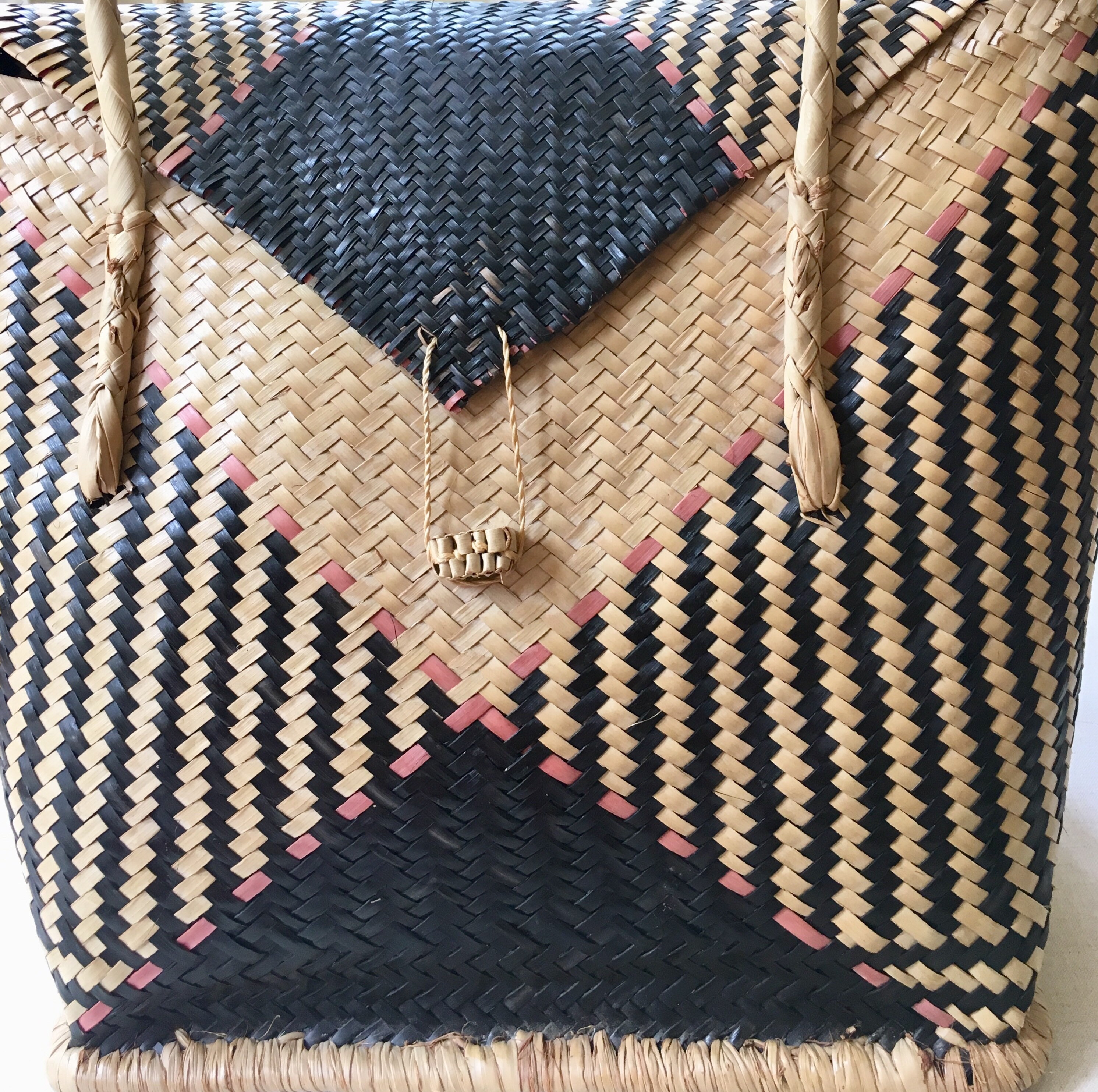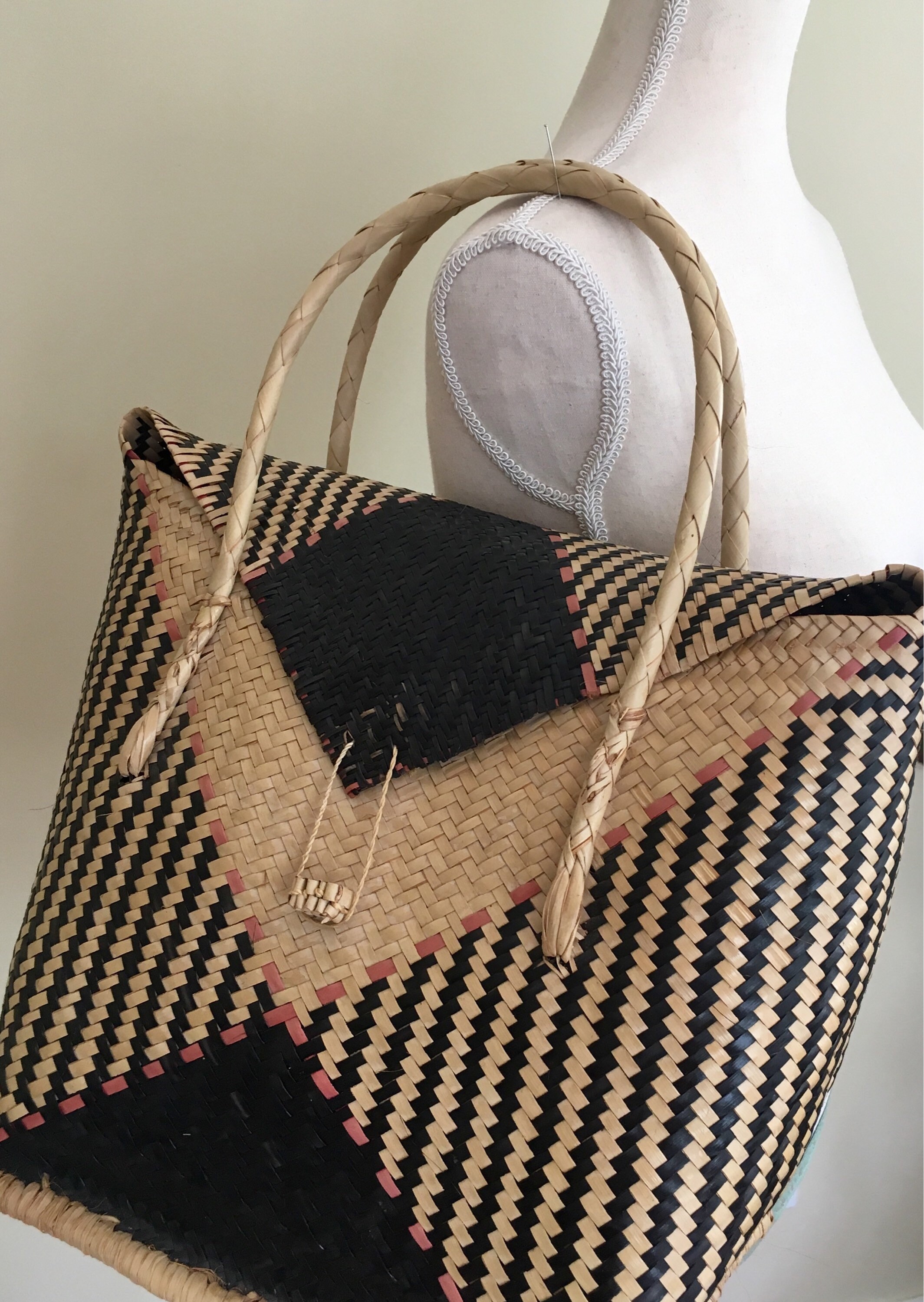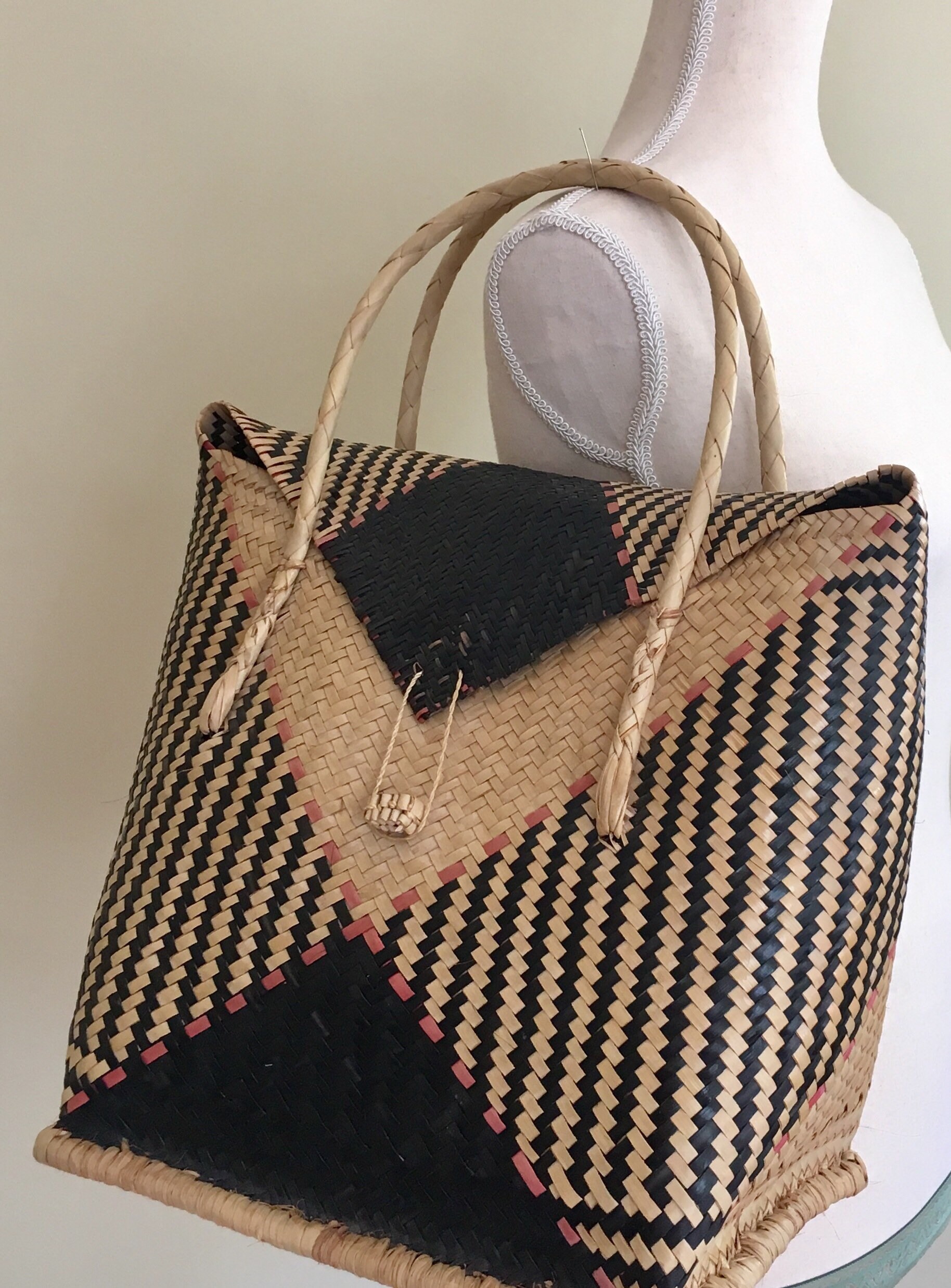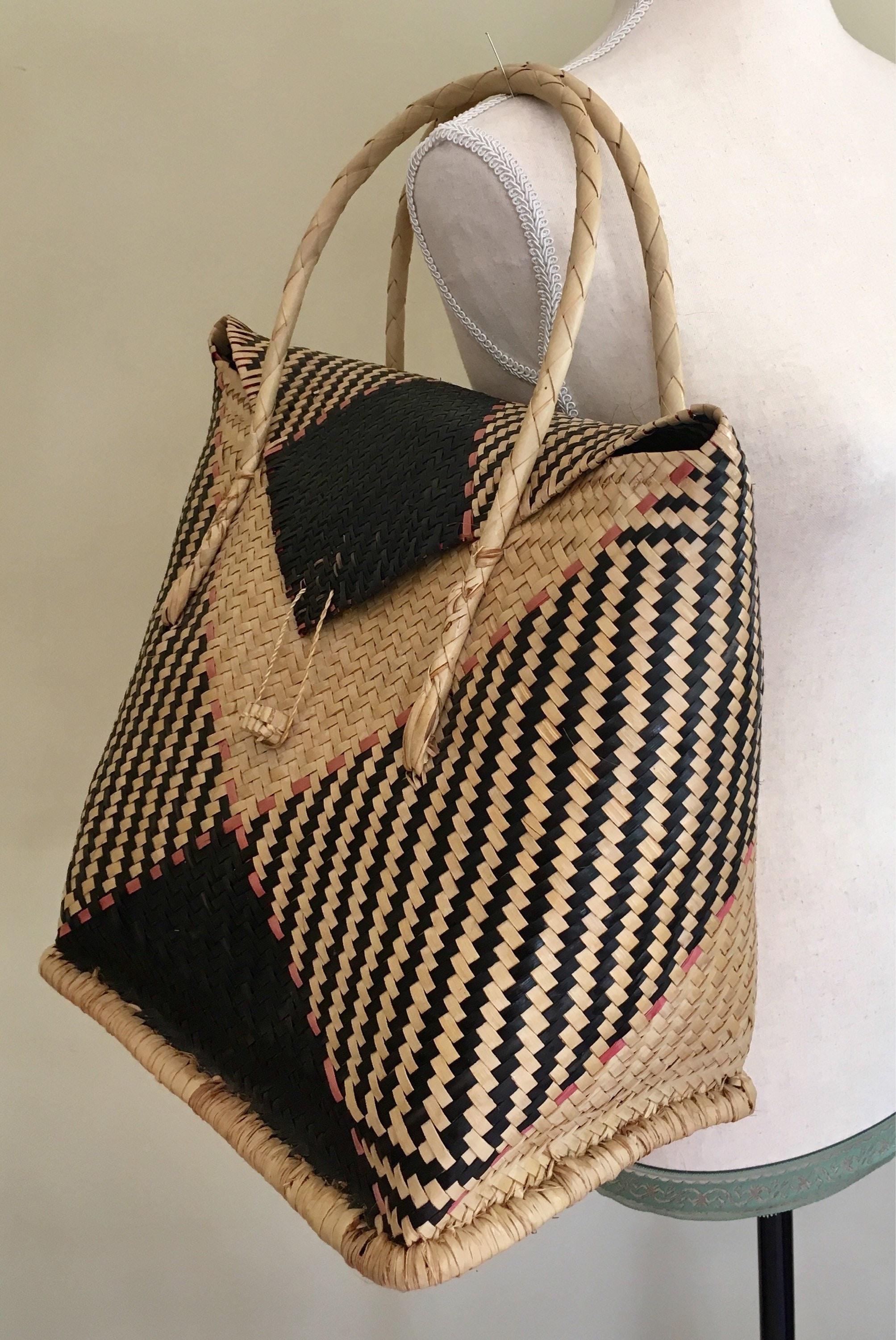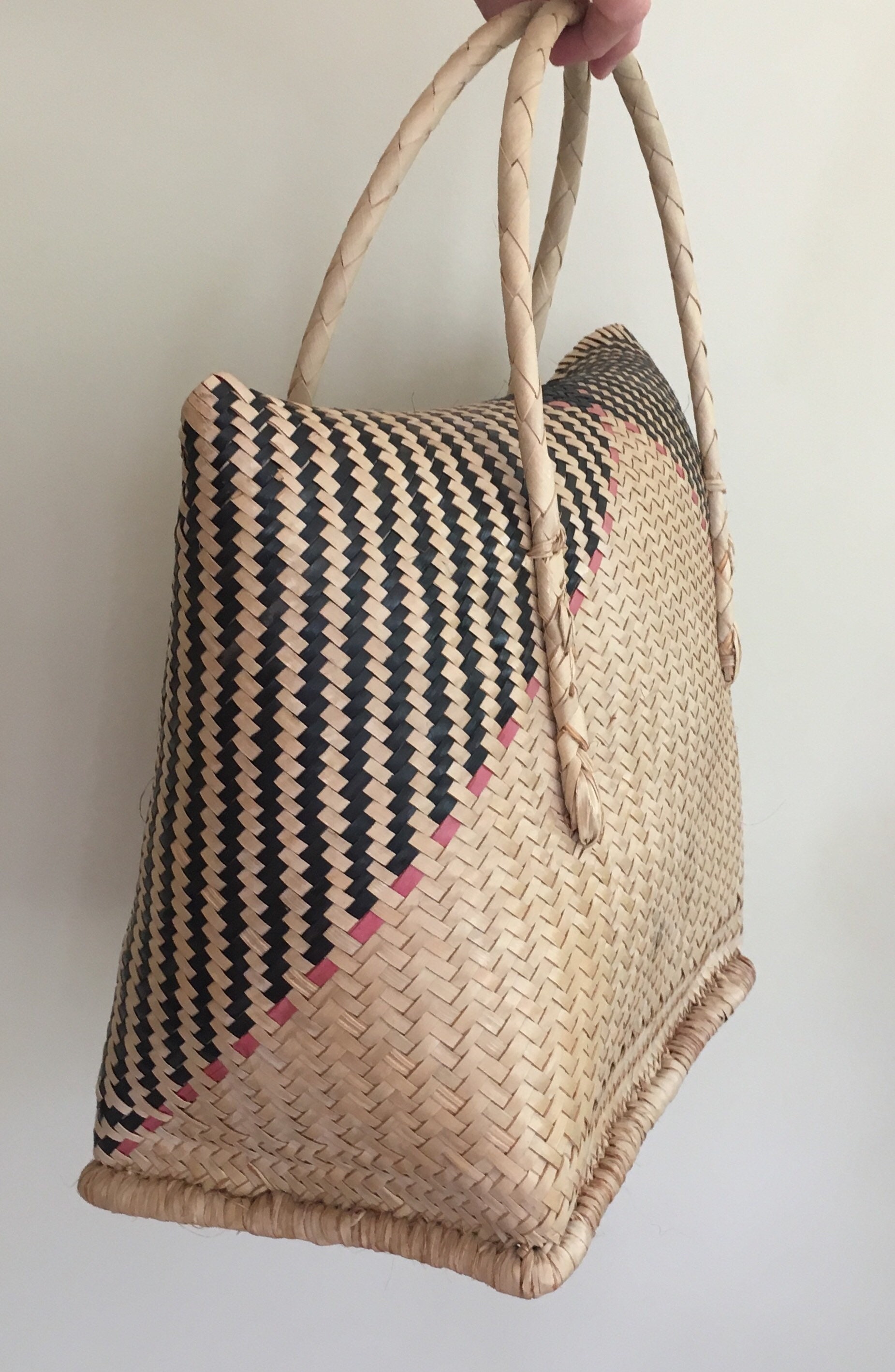 Vintage 70's woven straw tote bag in a unique shape. It's roomy interior is large enough to stash your summer beach essentials but lightweight so it won't weigh you down.