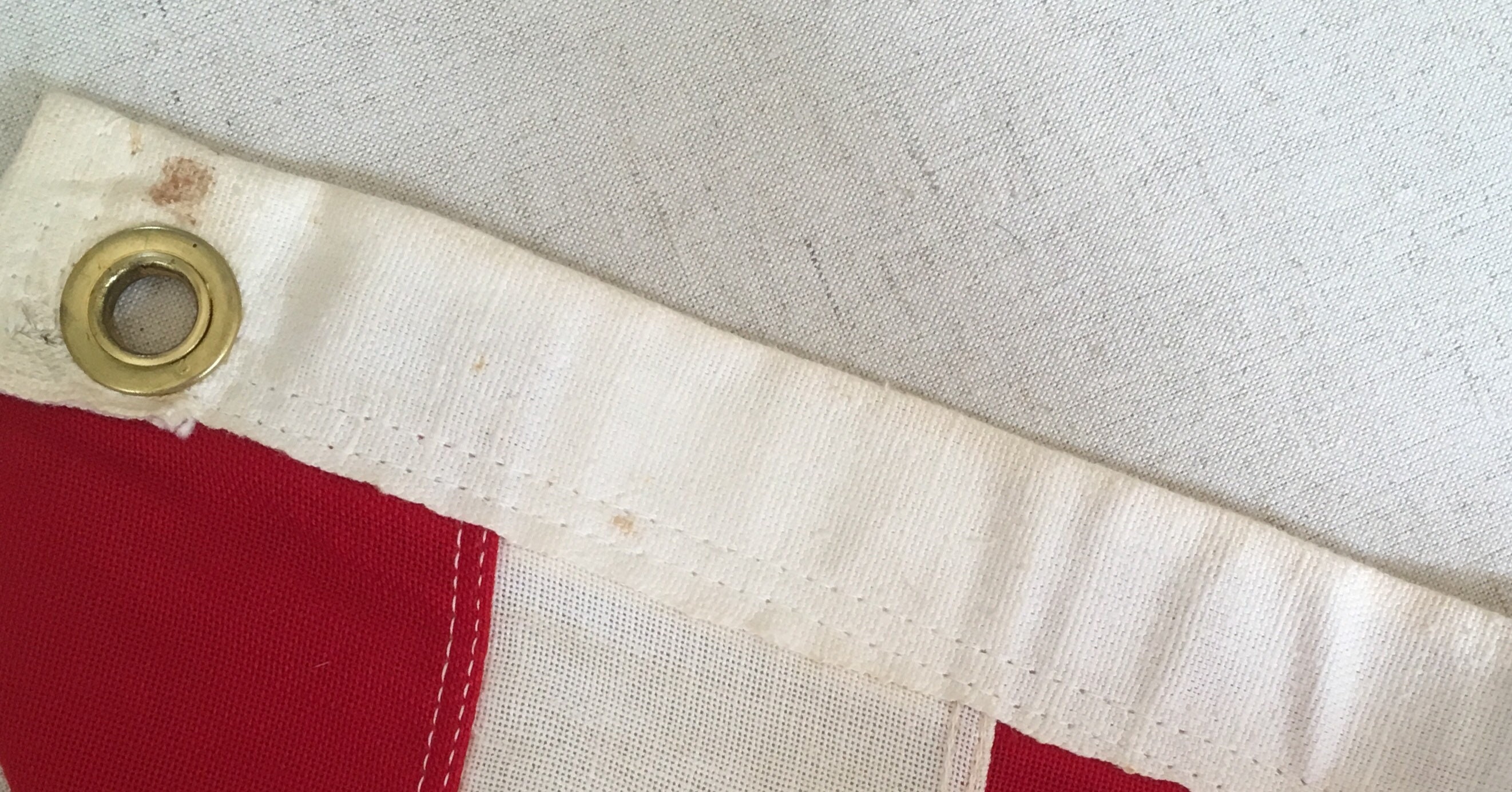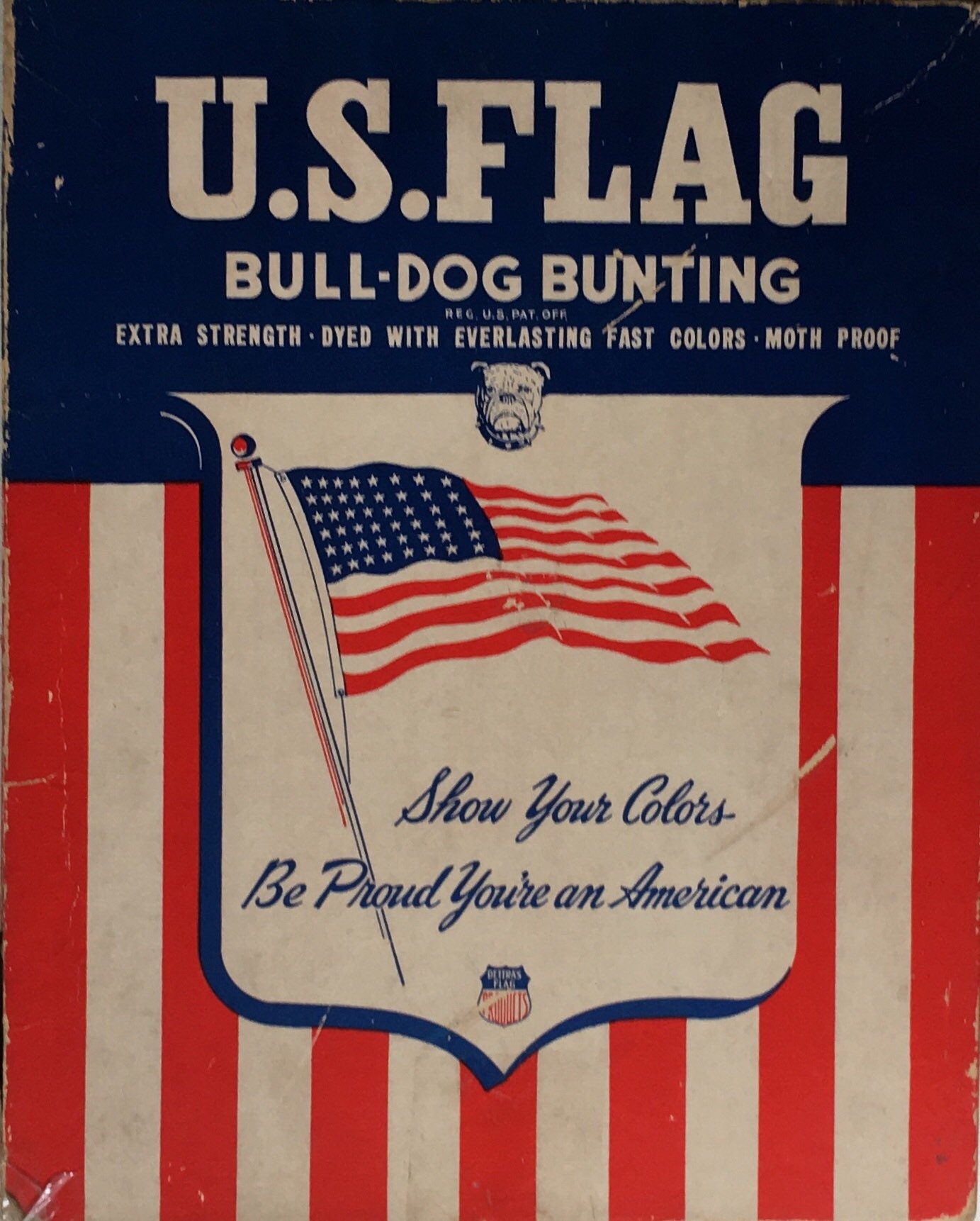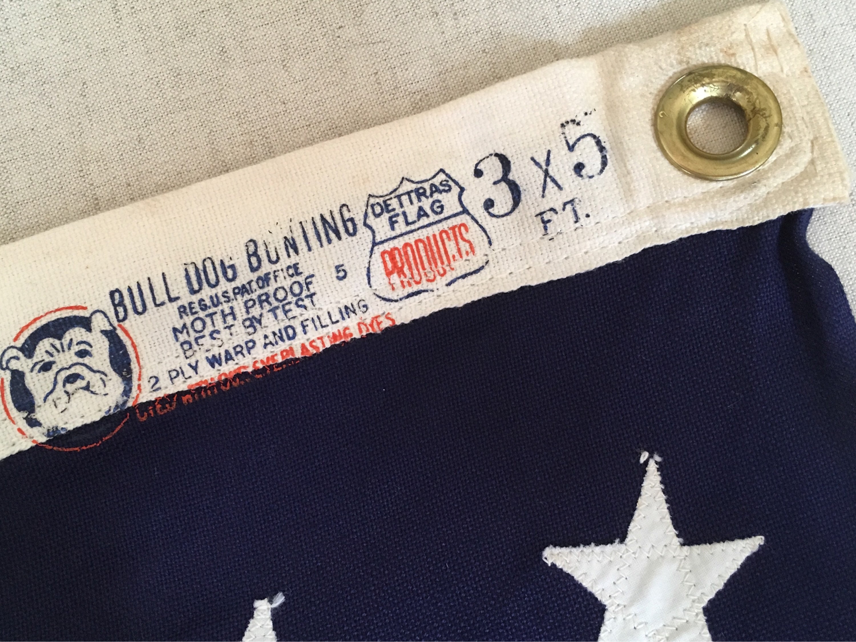 Sought-after and collectible 48 star cotton weave American flag with sewn / stitched stars and original box. Stamped "Bull Dog Bunting / Detra Flag" along canvas edge and guessing this is from the 1950's era.