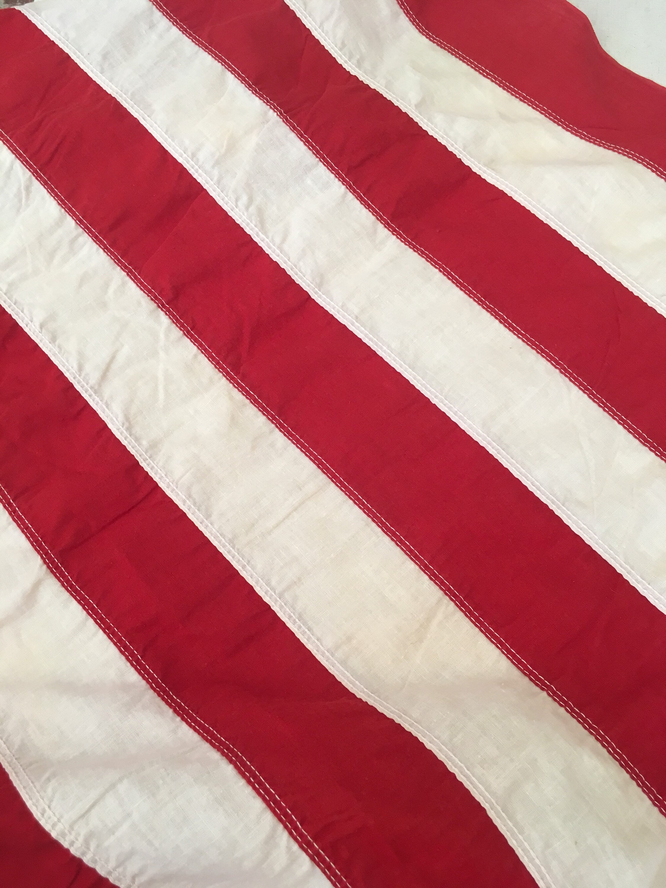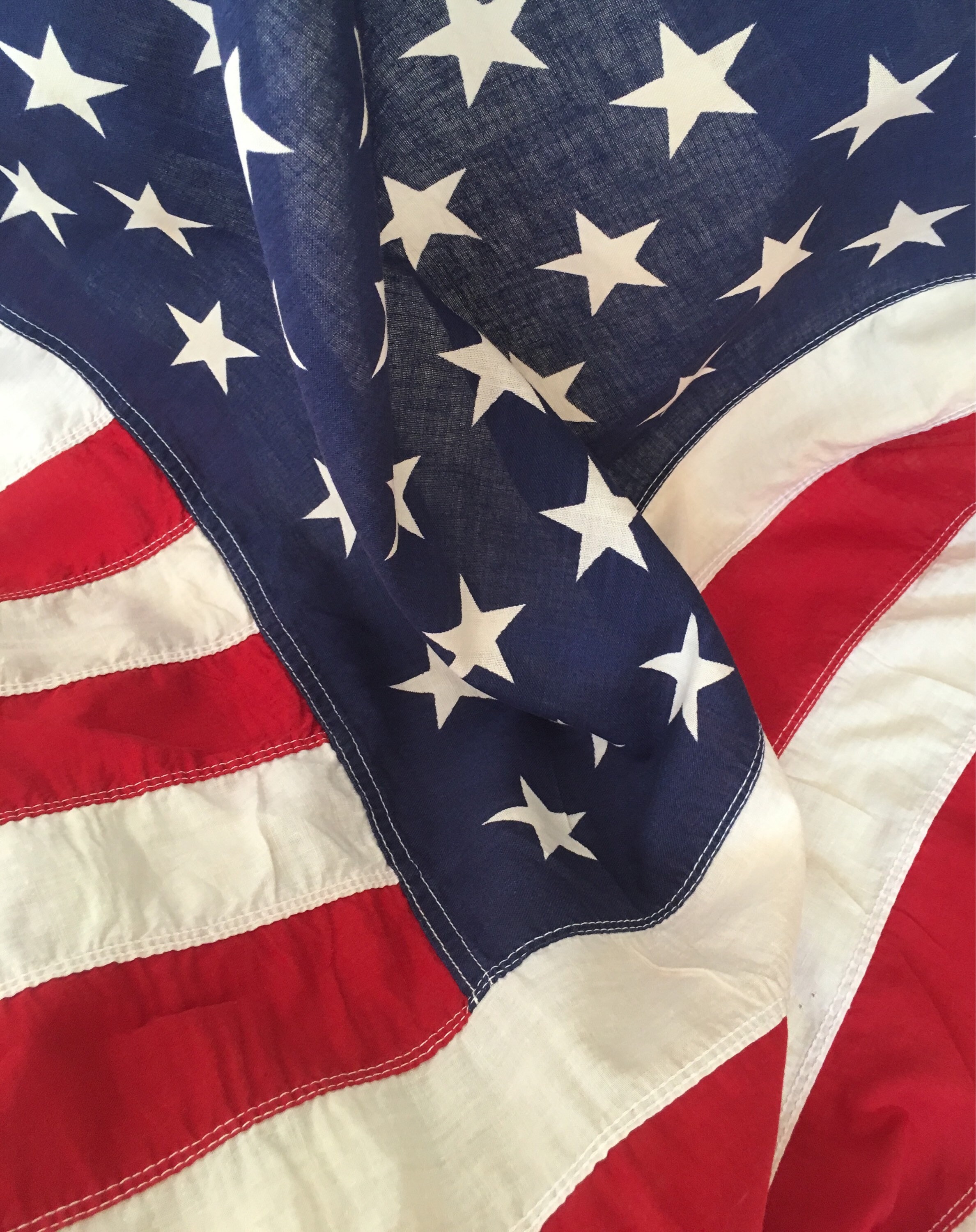 Vintage 100% cotton 50-star American flag with cotton edge and two brass grommets for easy hanging.