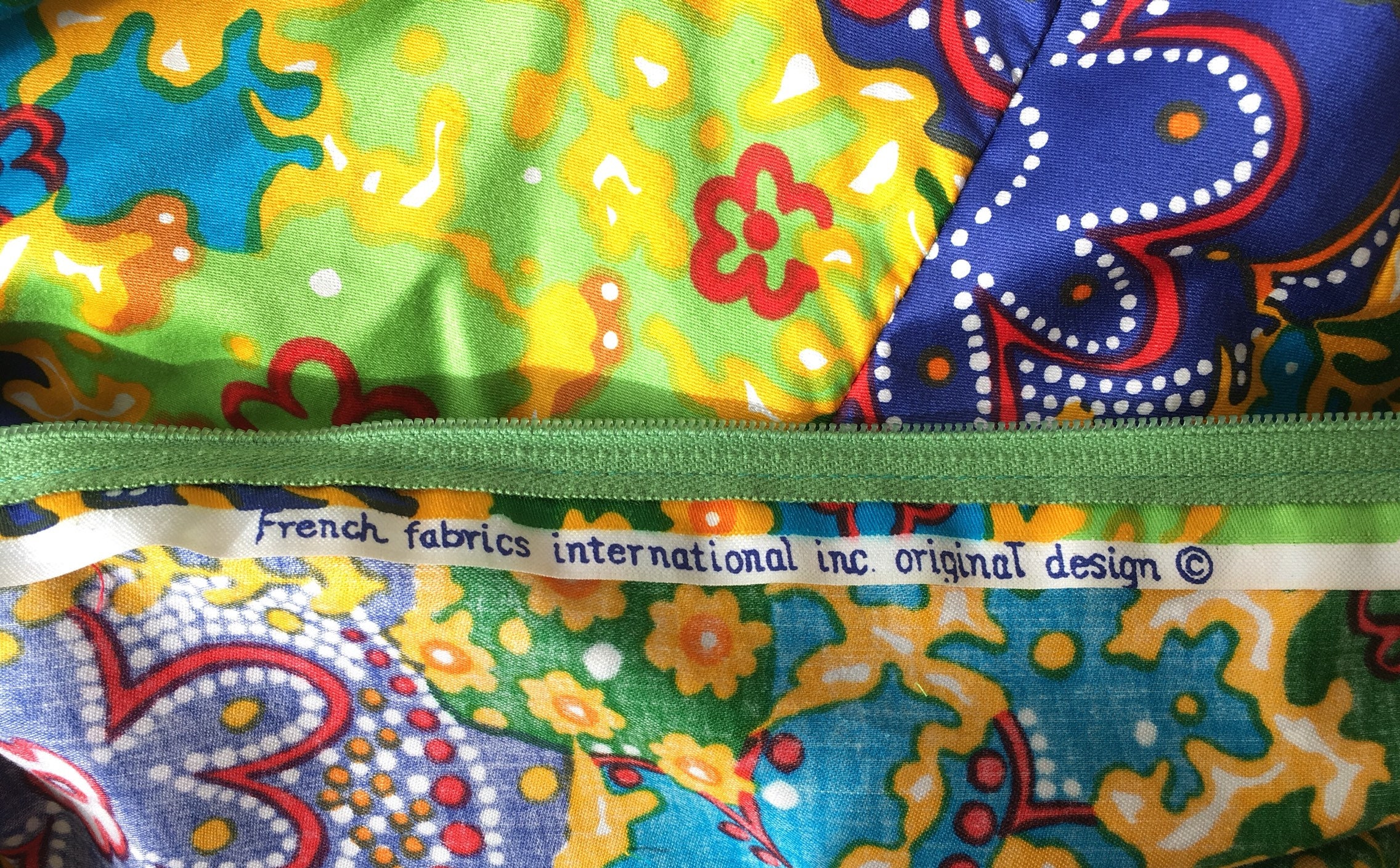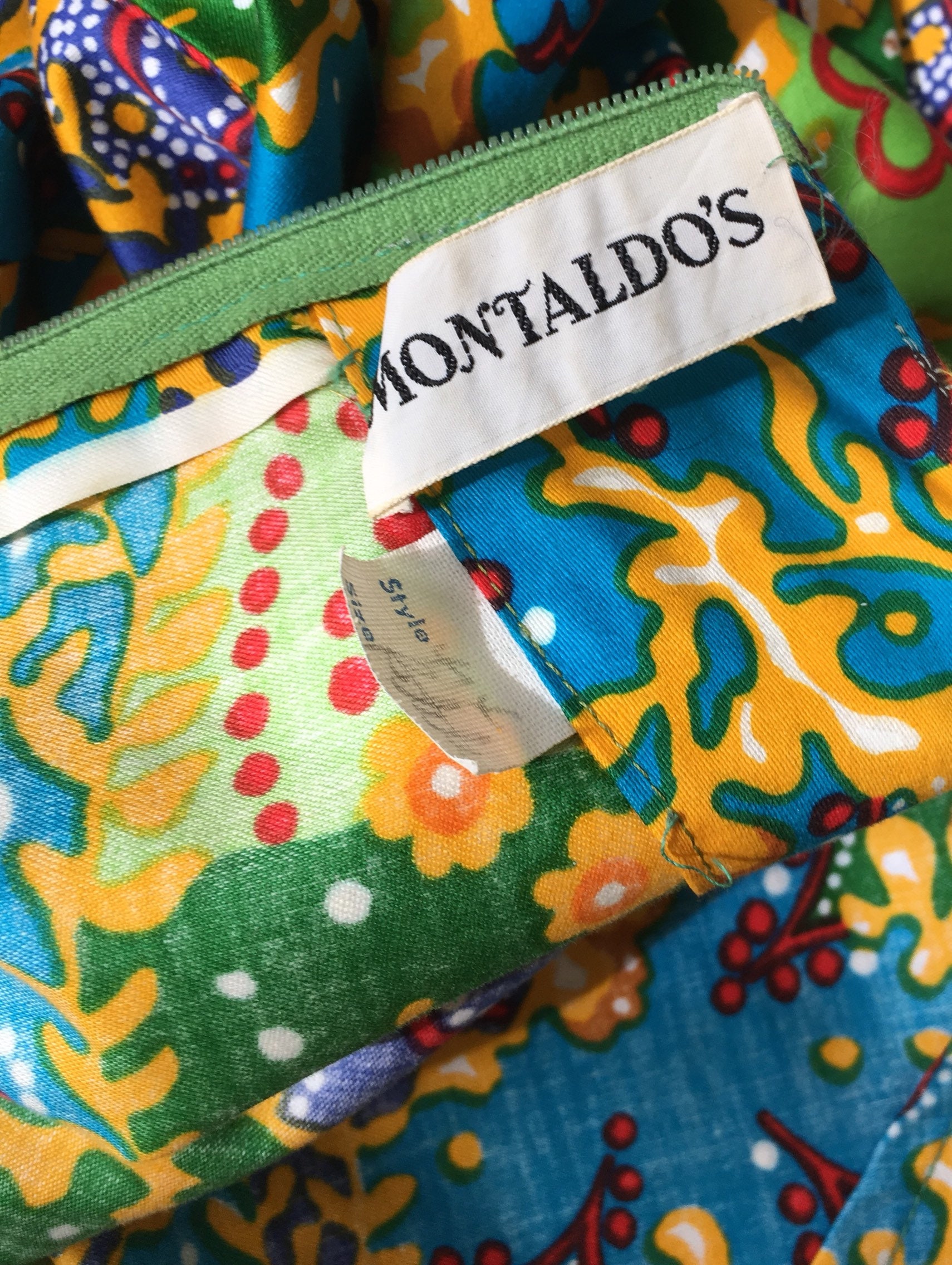 "French Fabric International Inc. Original Design" printed on the interior seam. Stitched label reads "Montaldos" which was a high end department store in Columbus, Ohio back in the day.