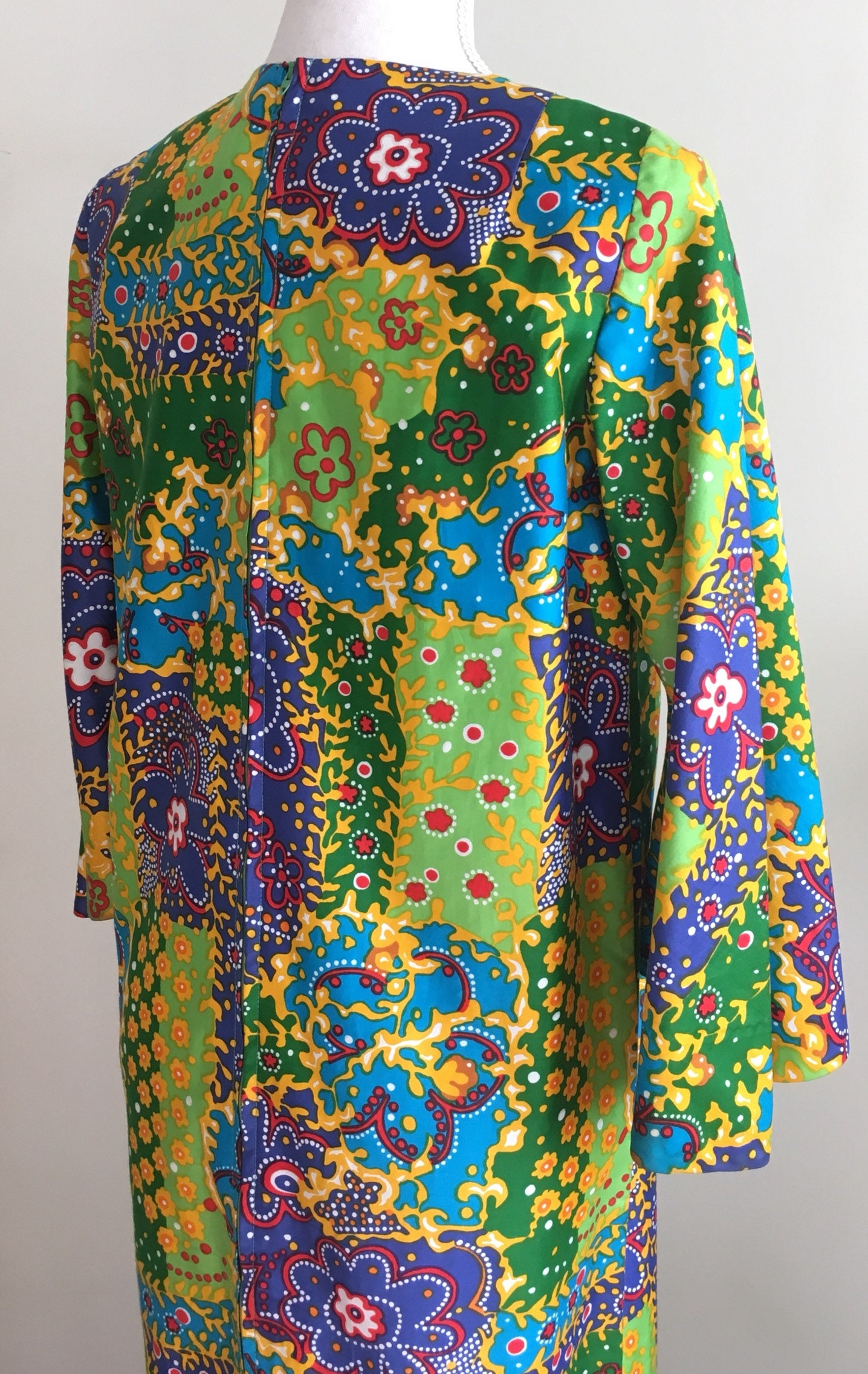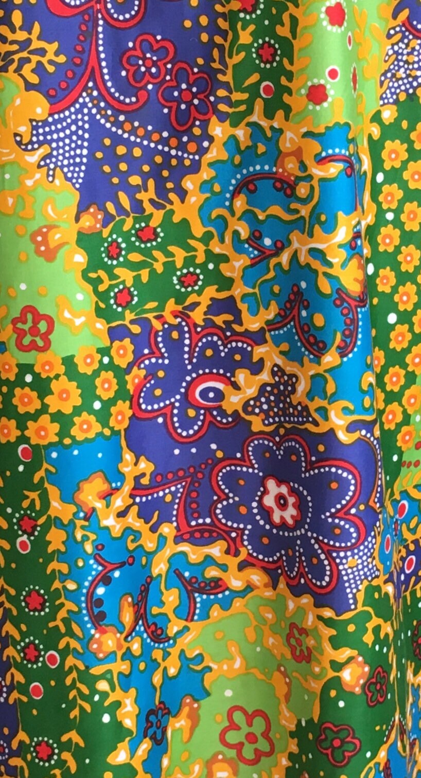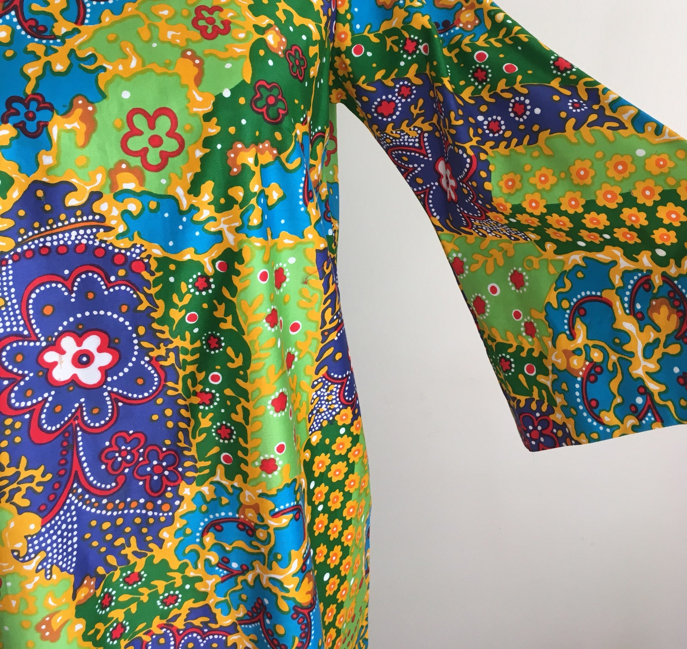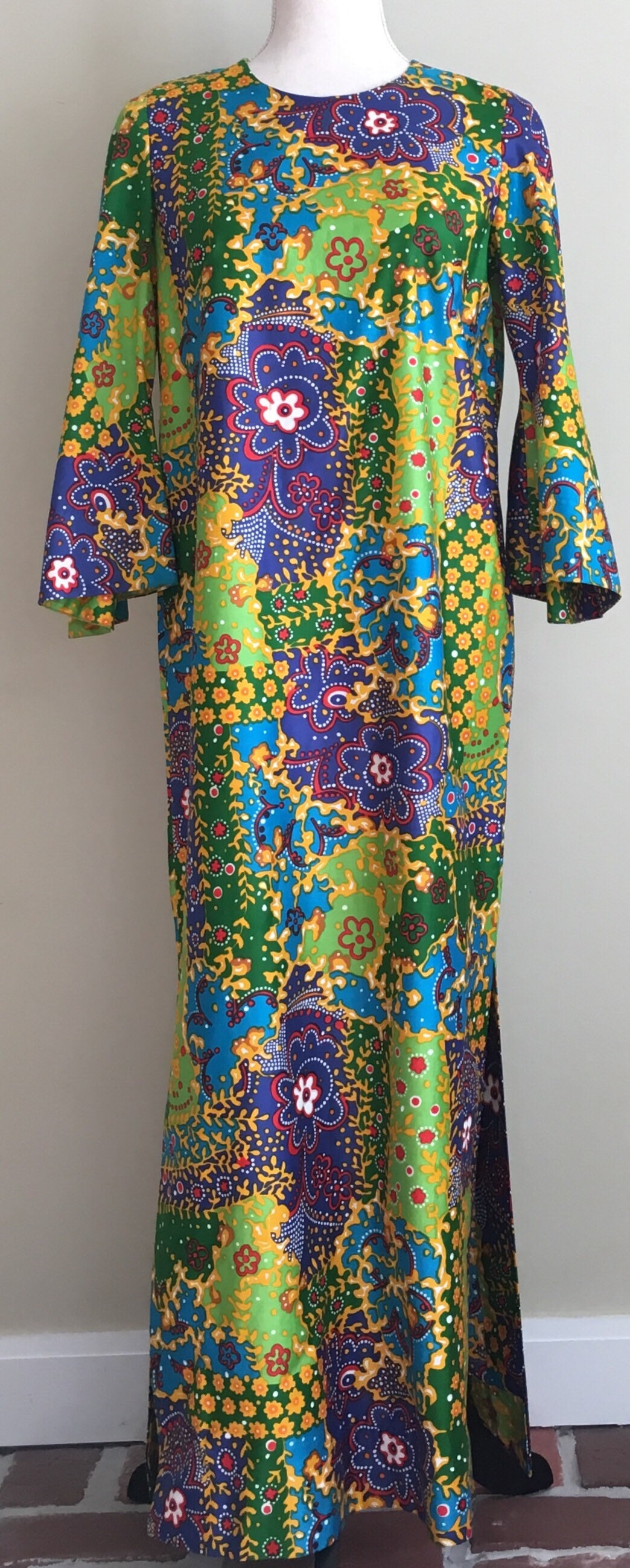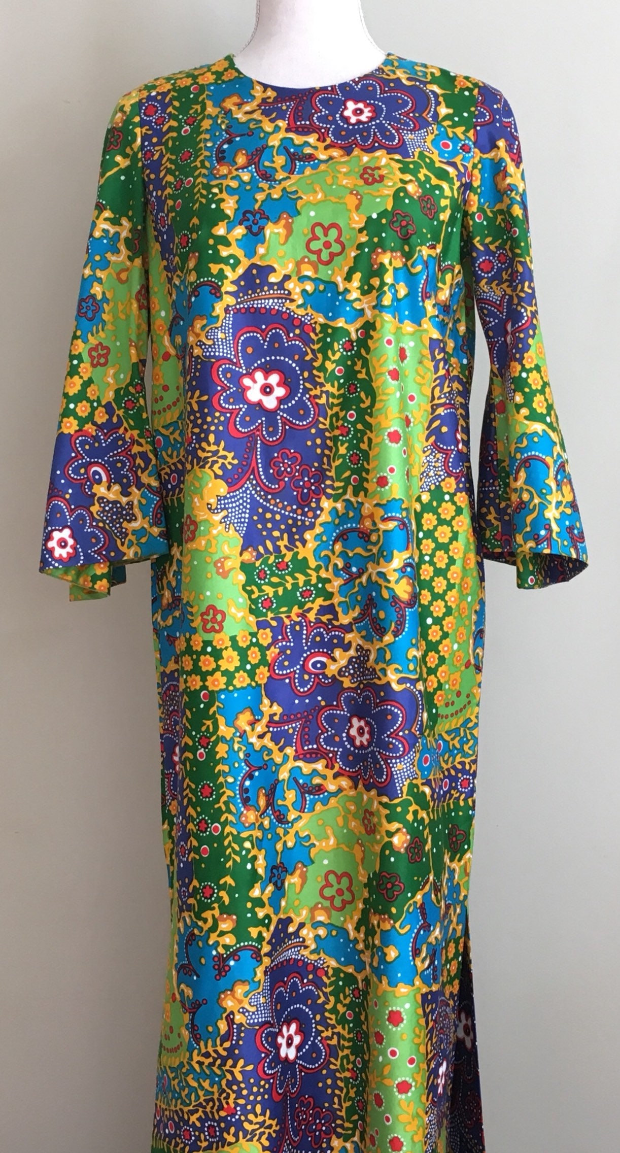 Fabulous vintage 60's floral cotton weave floor length caftan / maxi dress with glamorous batwing sleeves.