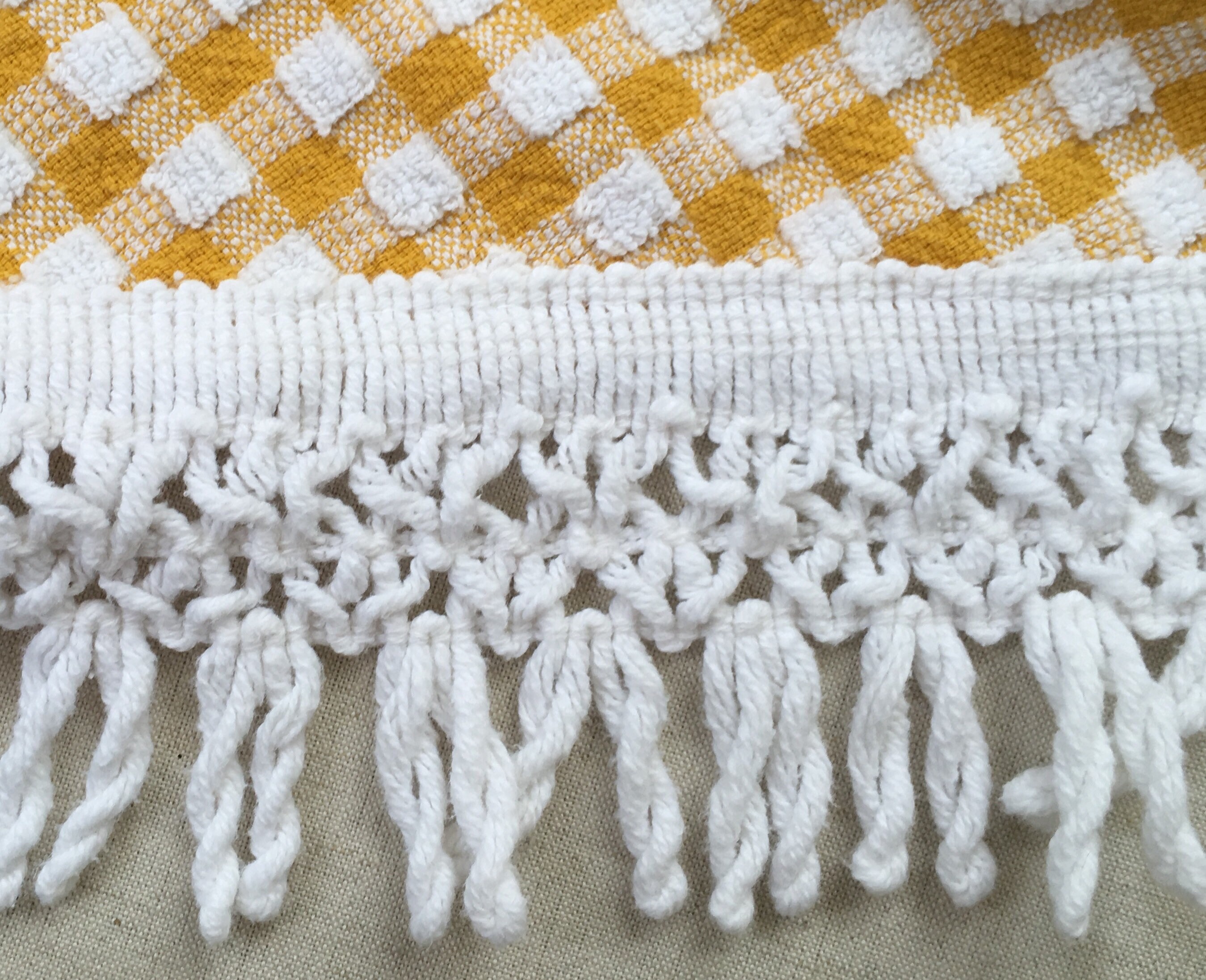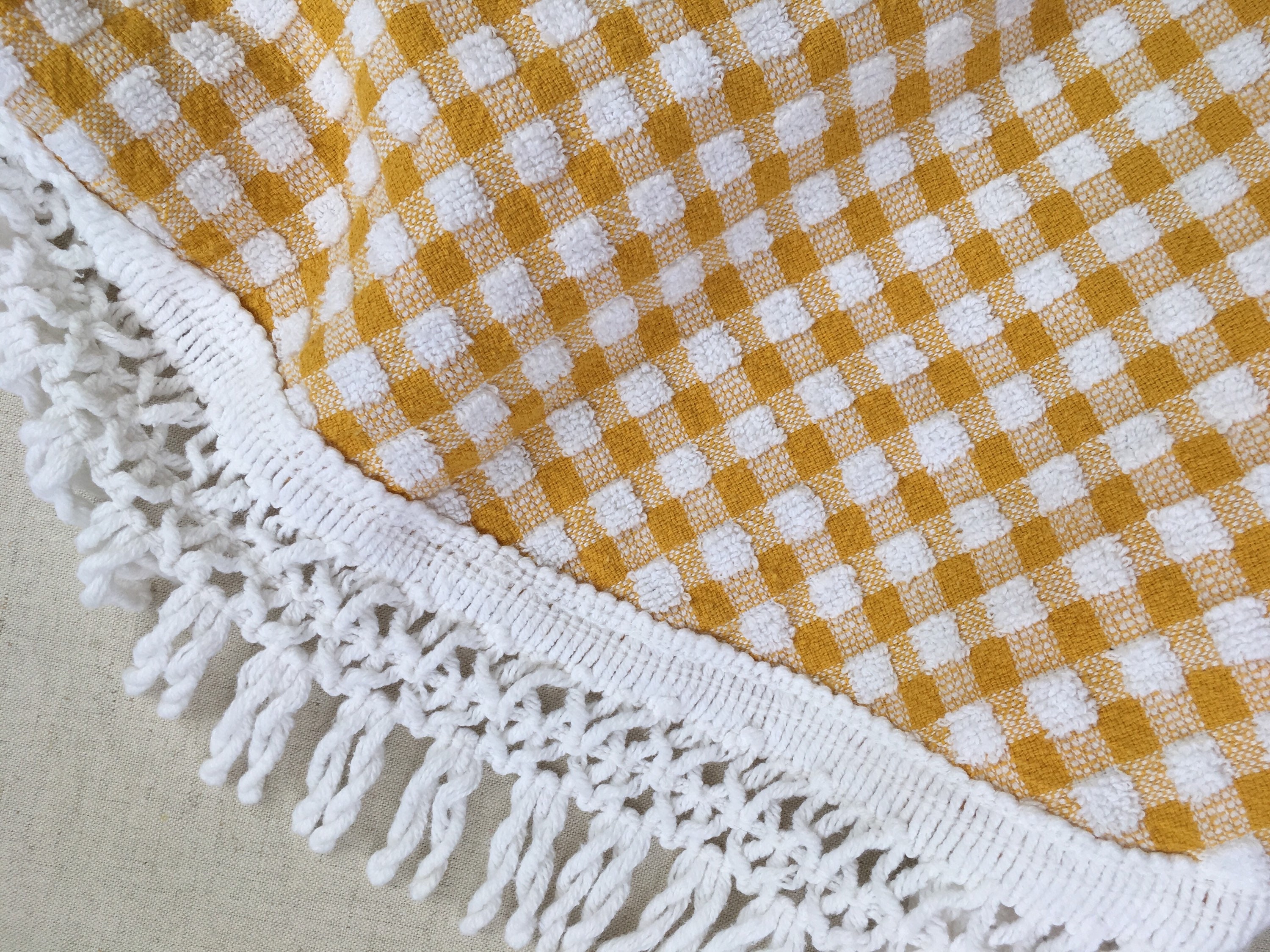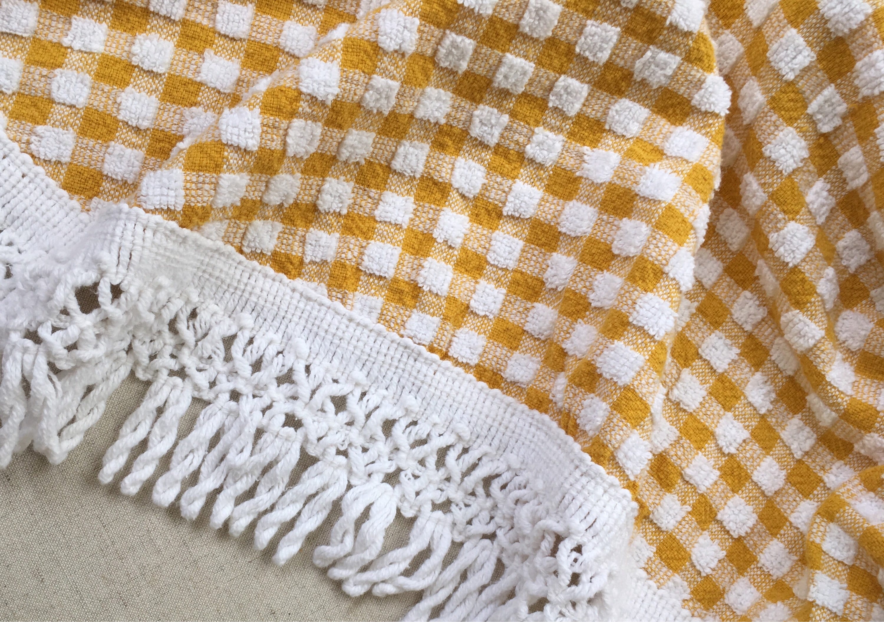 Vintage picnic blanket / textile / table cloth in a small, portable size. Mustard yellow and white gingham terry fabric with knotted white cotton fringe.