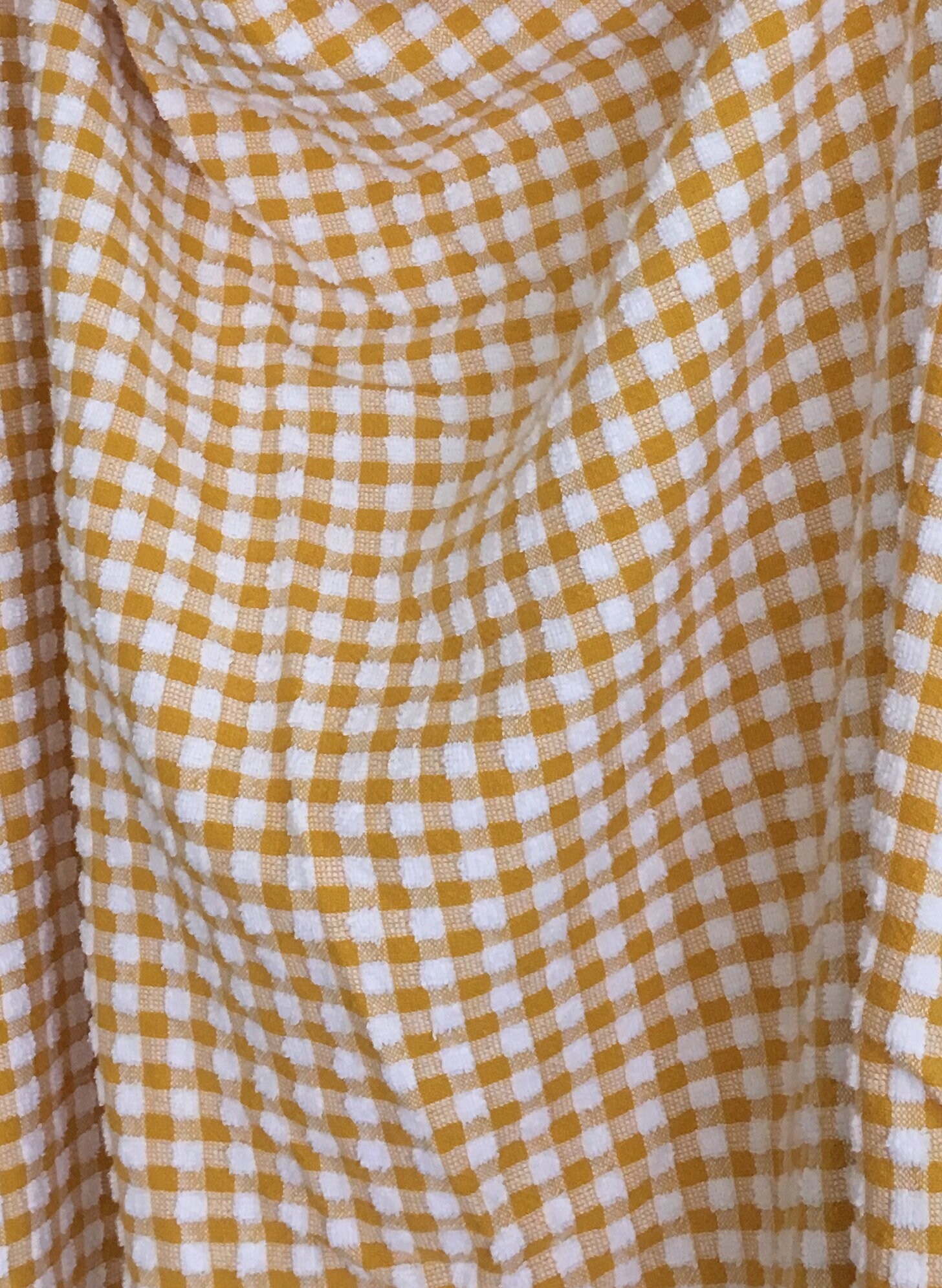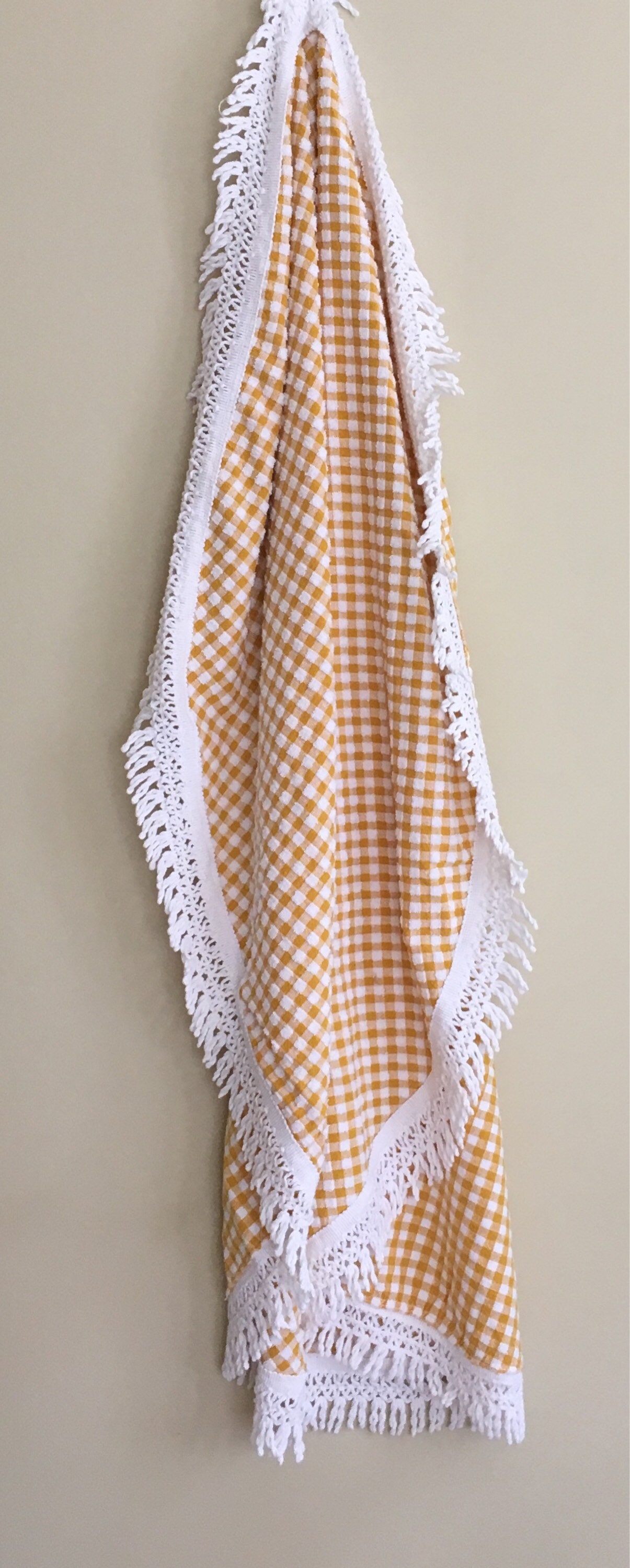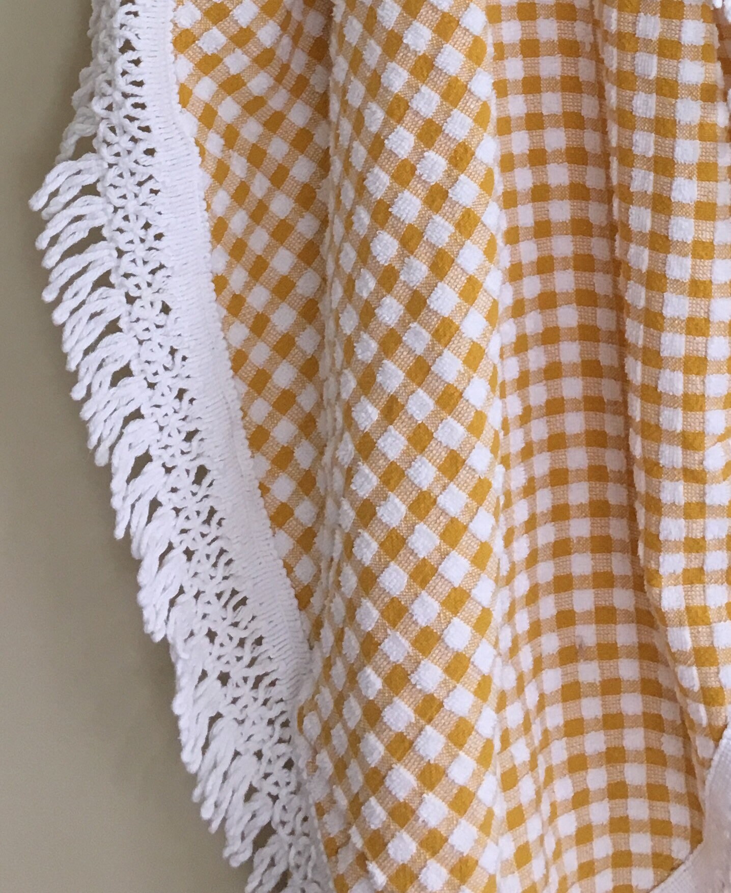 Vintage picnic blanket / textile / table cloth in a small, portable size. Mustard yellow and white gingham terry fabric with knotted white cotton fringe.
