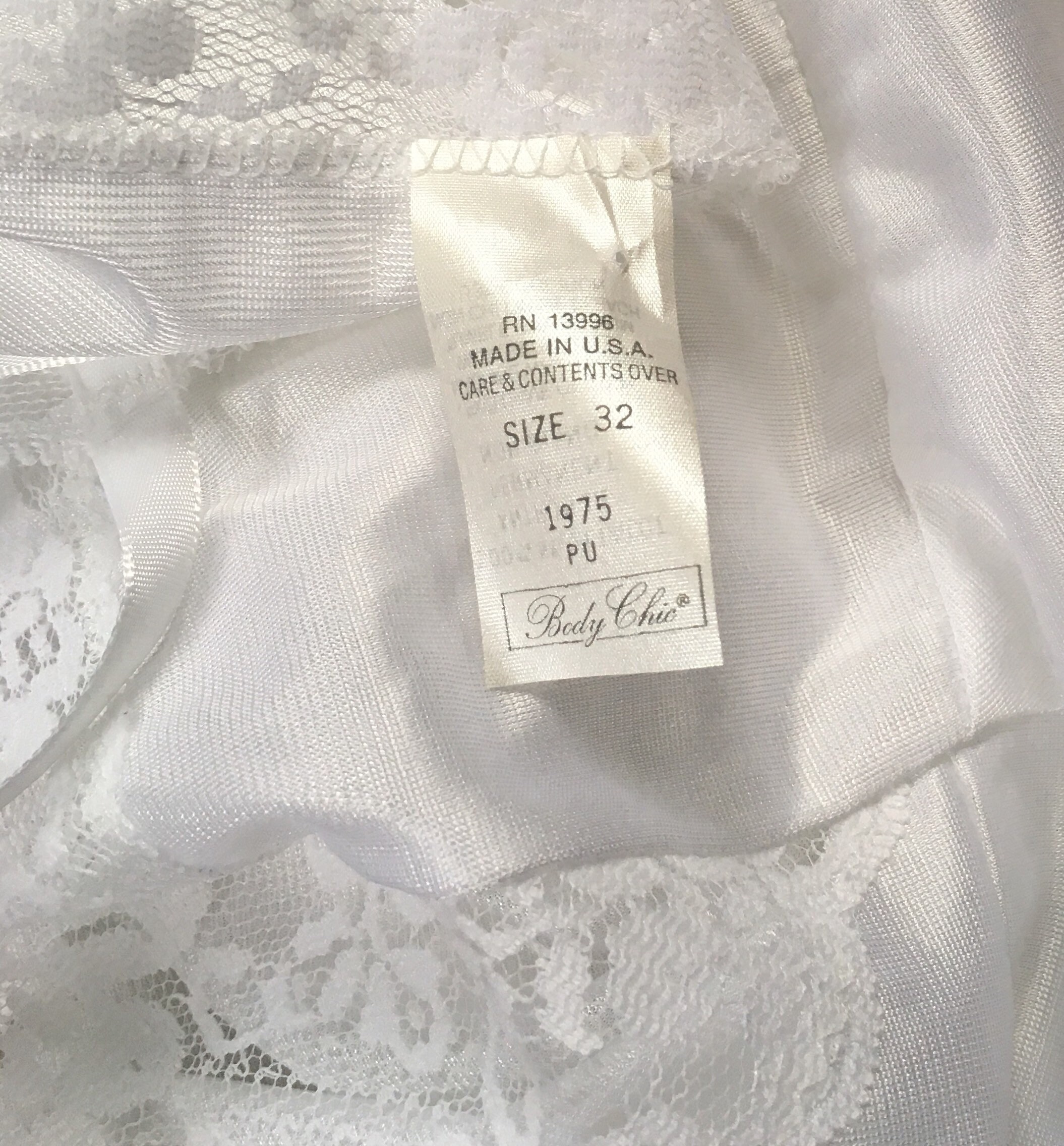 Romantic vintage white nylon long nightgown with lace trim, adjustable shoulder straps and rosette detail.
