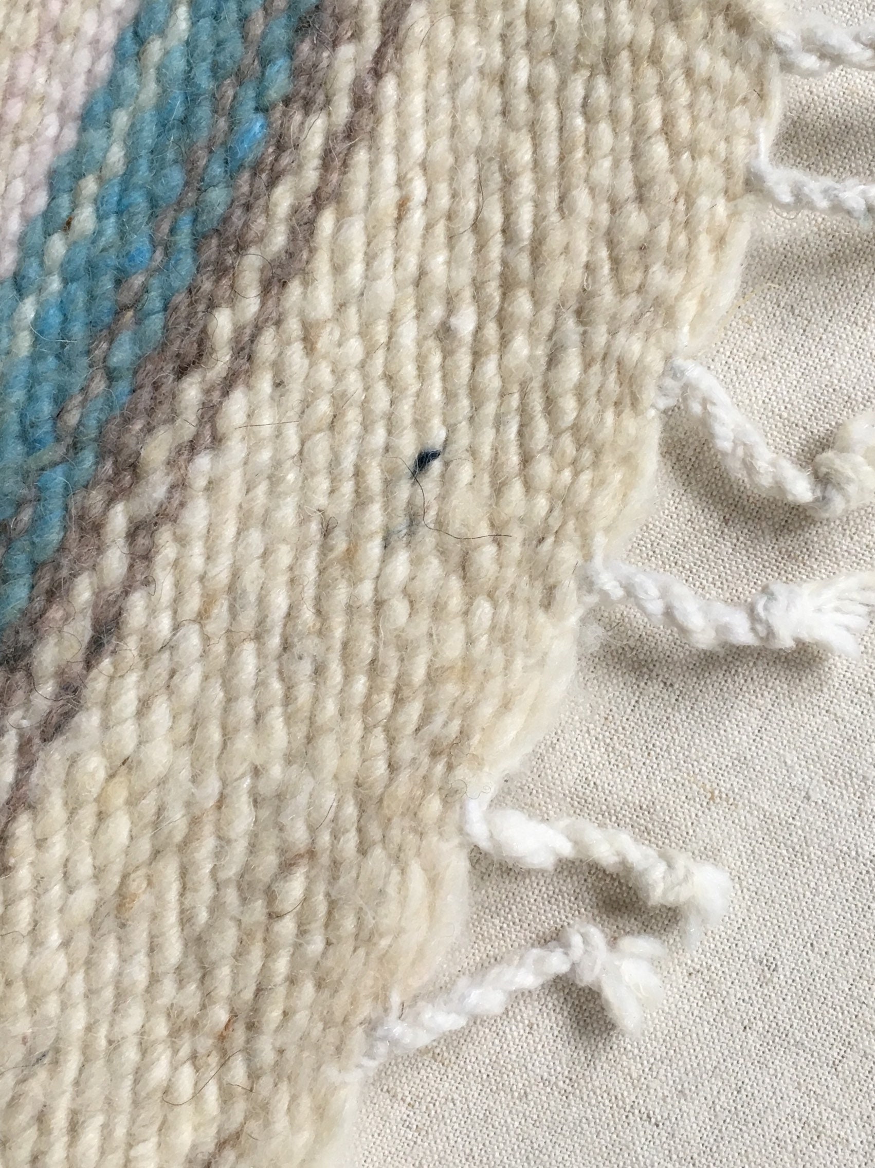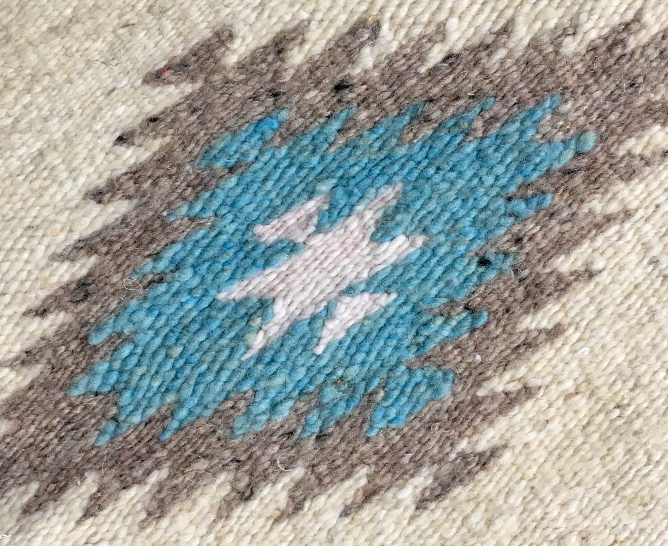 Set of four vintage 70's hand woven wool placemats in a beige, brown and blue Southwest serape-style design