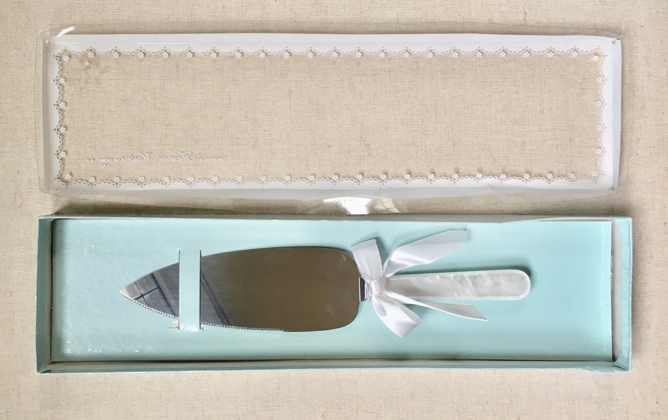 Cut your wedding cake in style with this vintage cake knife with pearlized handle and serrated stainless steel blade.