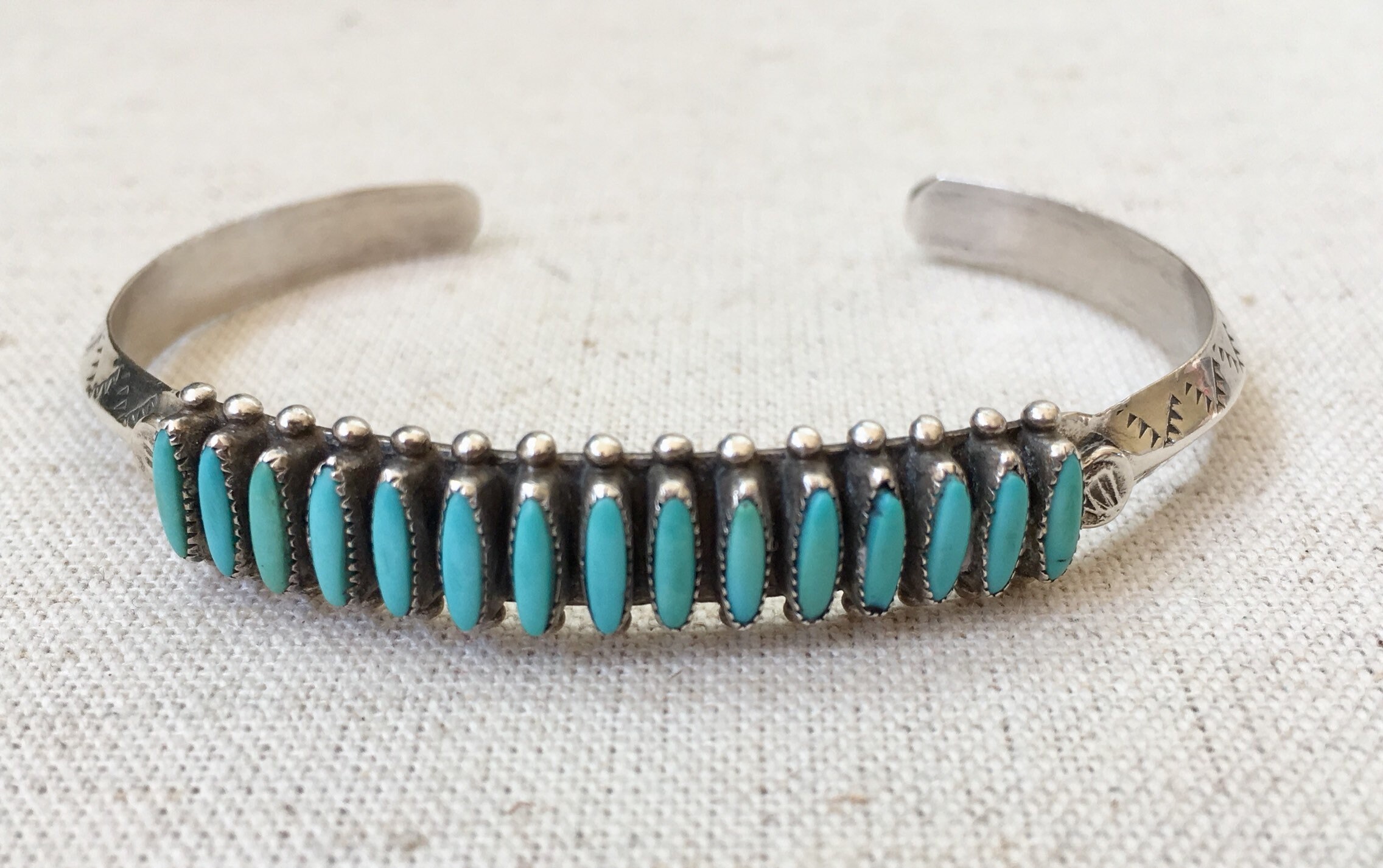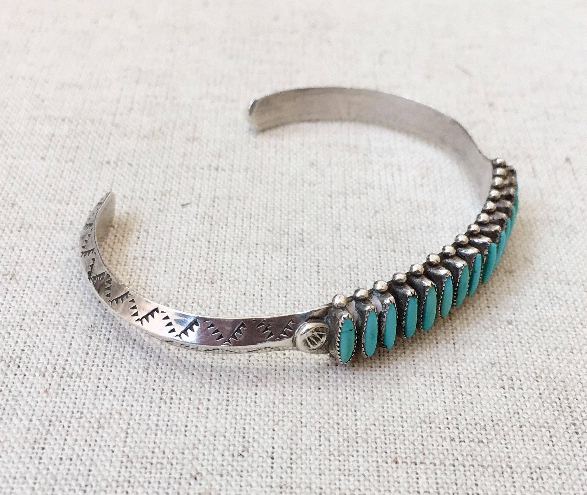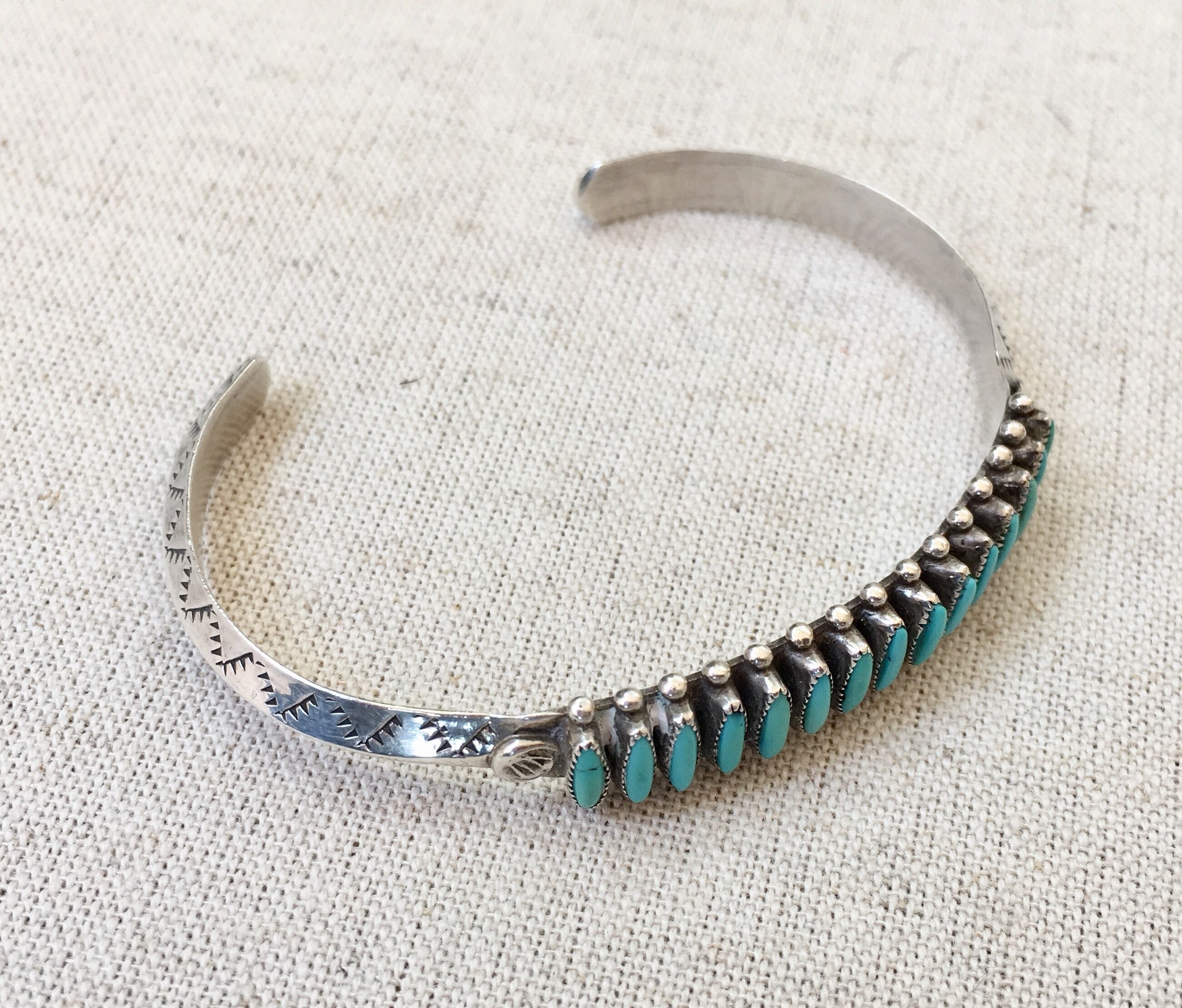 Delicate and beautifully crafted vintage Native American Zuni needlepoint turquoise cuff with hand stamped designs along the band and 15 inset turquoise stones.