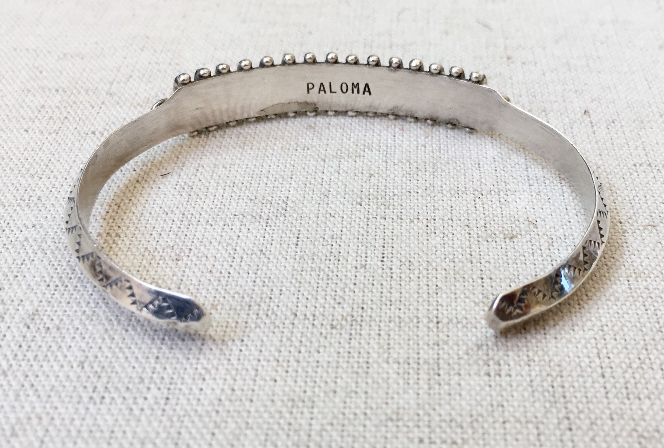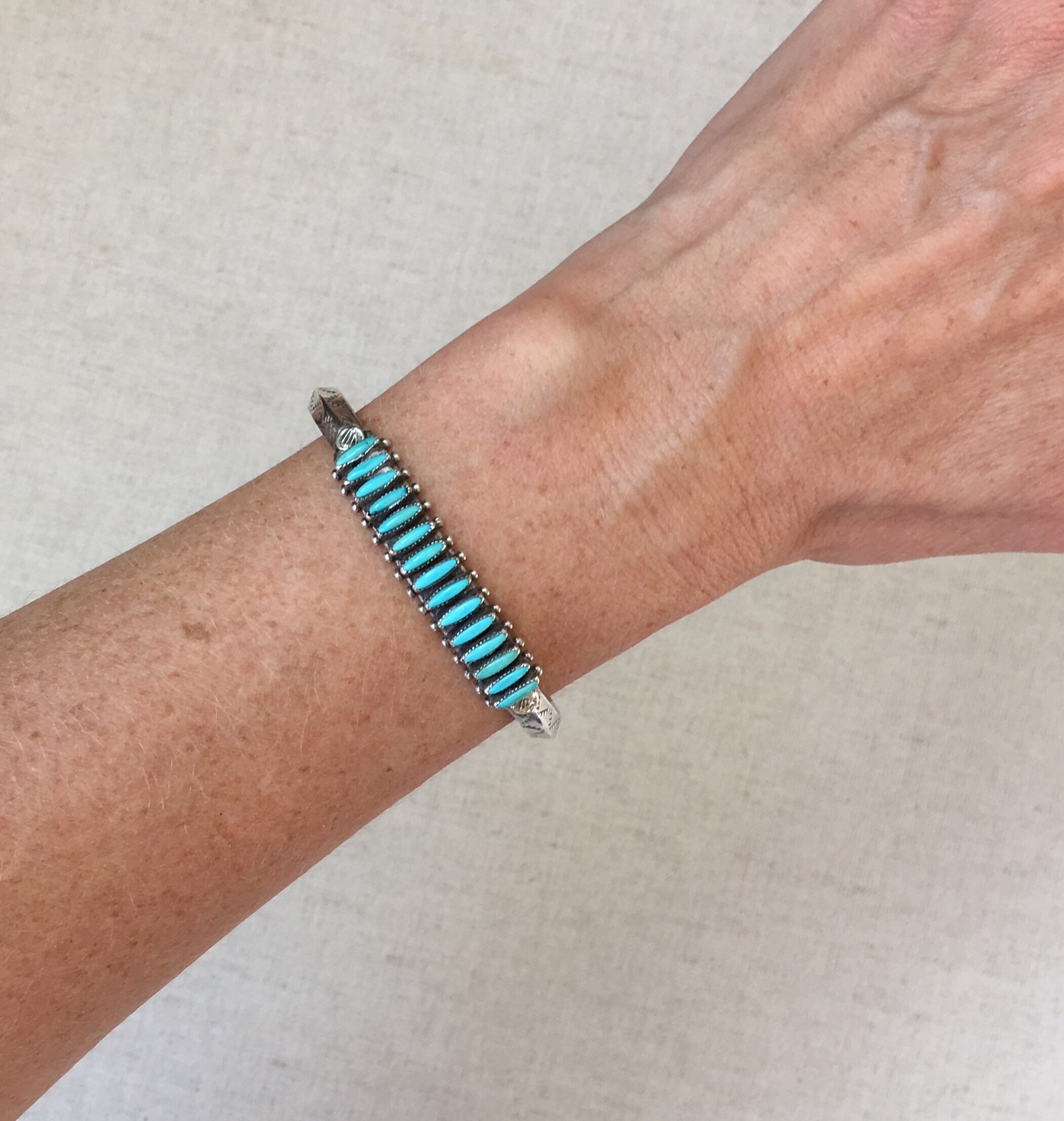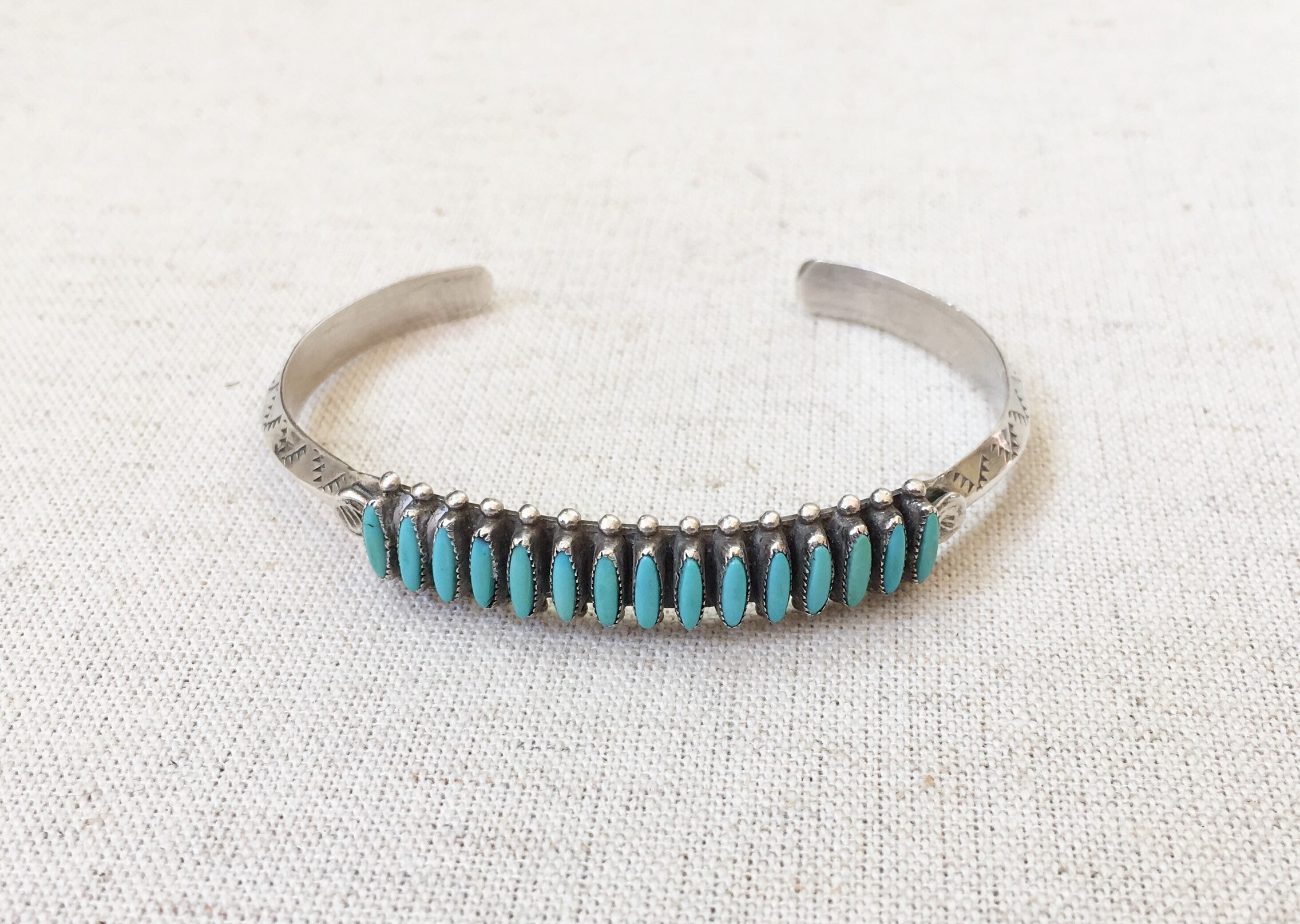 Delicate and beautifully crafted vintage Native American Zuni needlepoint turquoise cuff with hand stamped designs along the band and 15 inset turquoise stones.