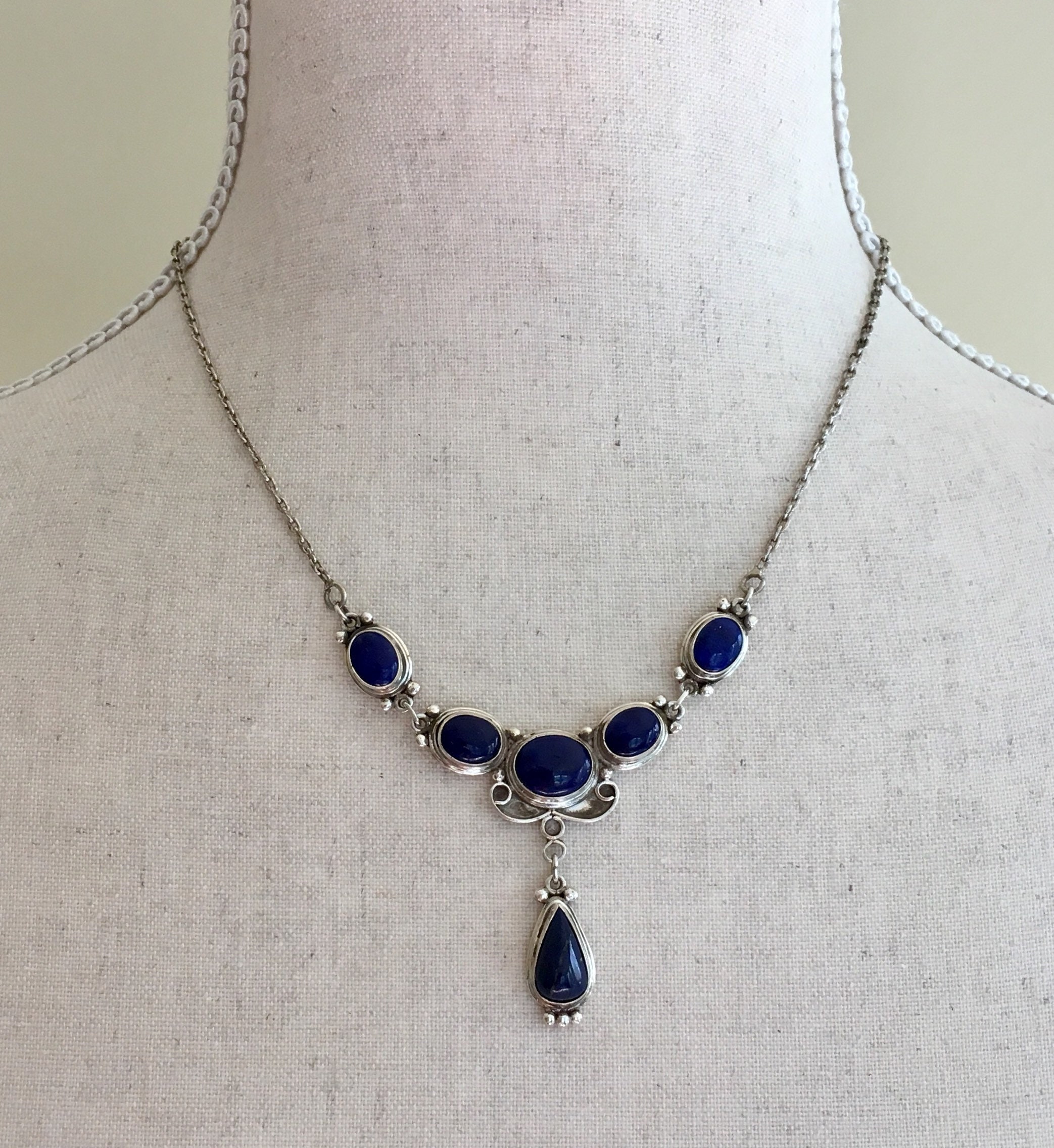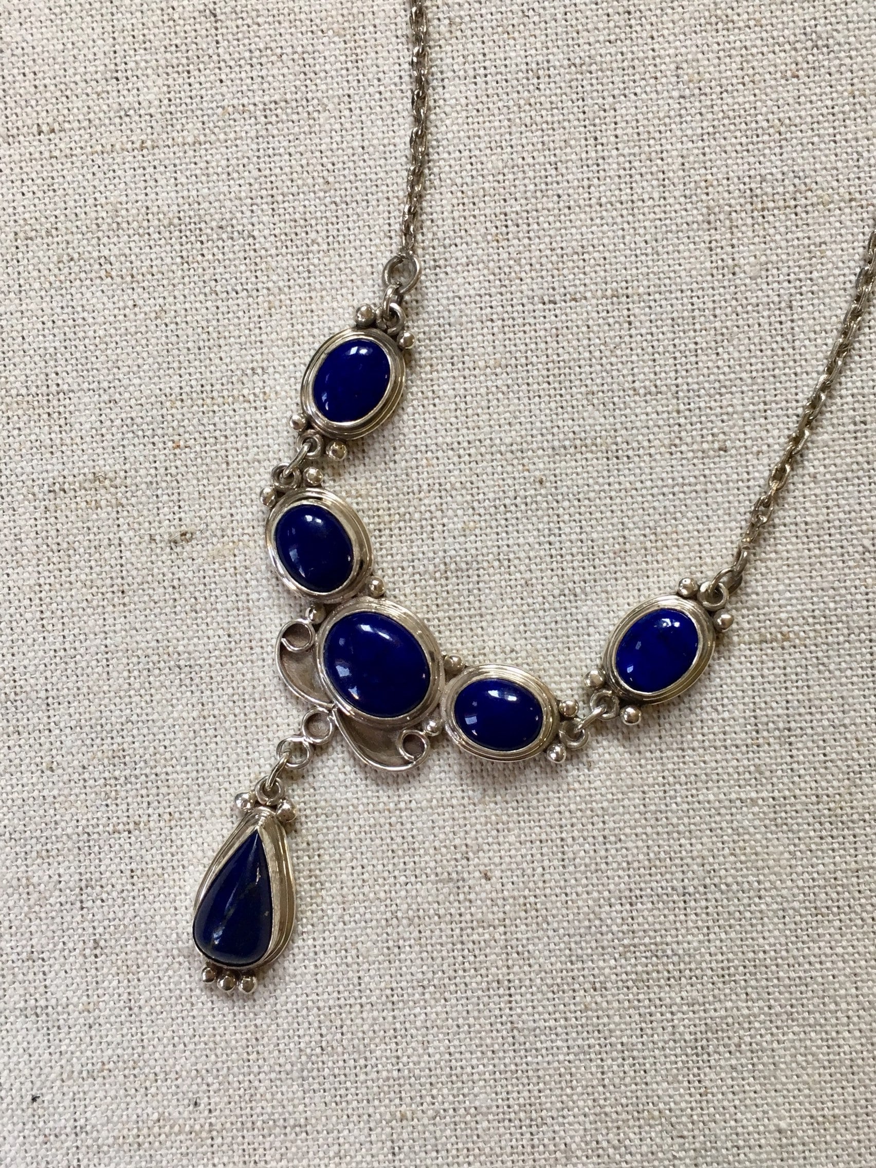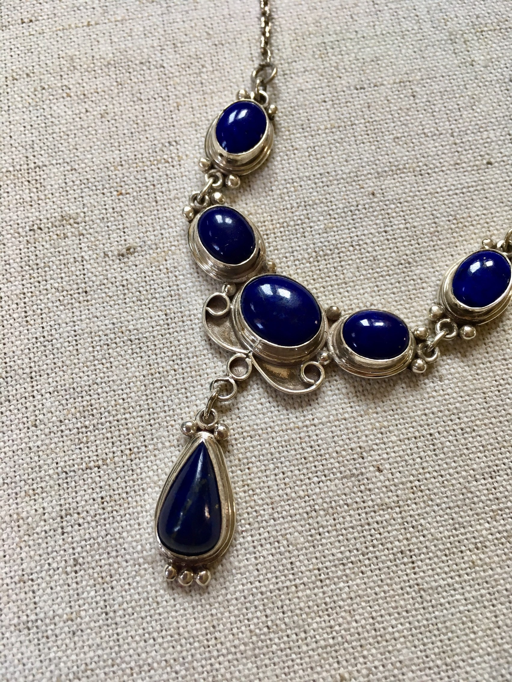 Simple vintage handmade Native American Navajo sterling silver necklace with six glossy Lapis Azuli stones.
