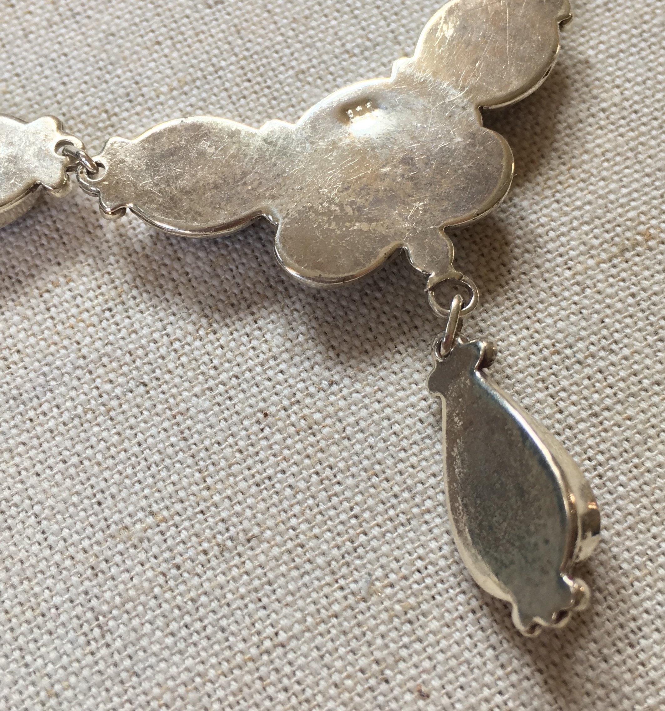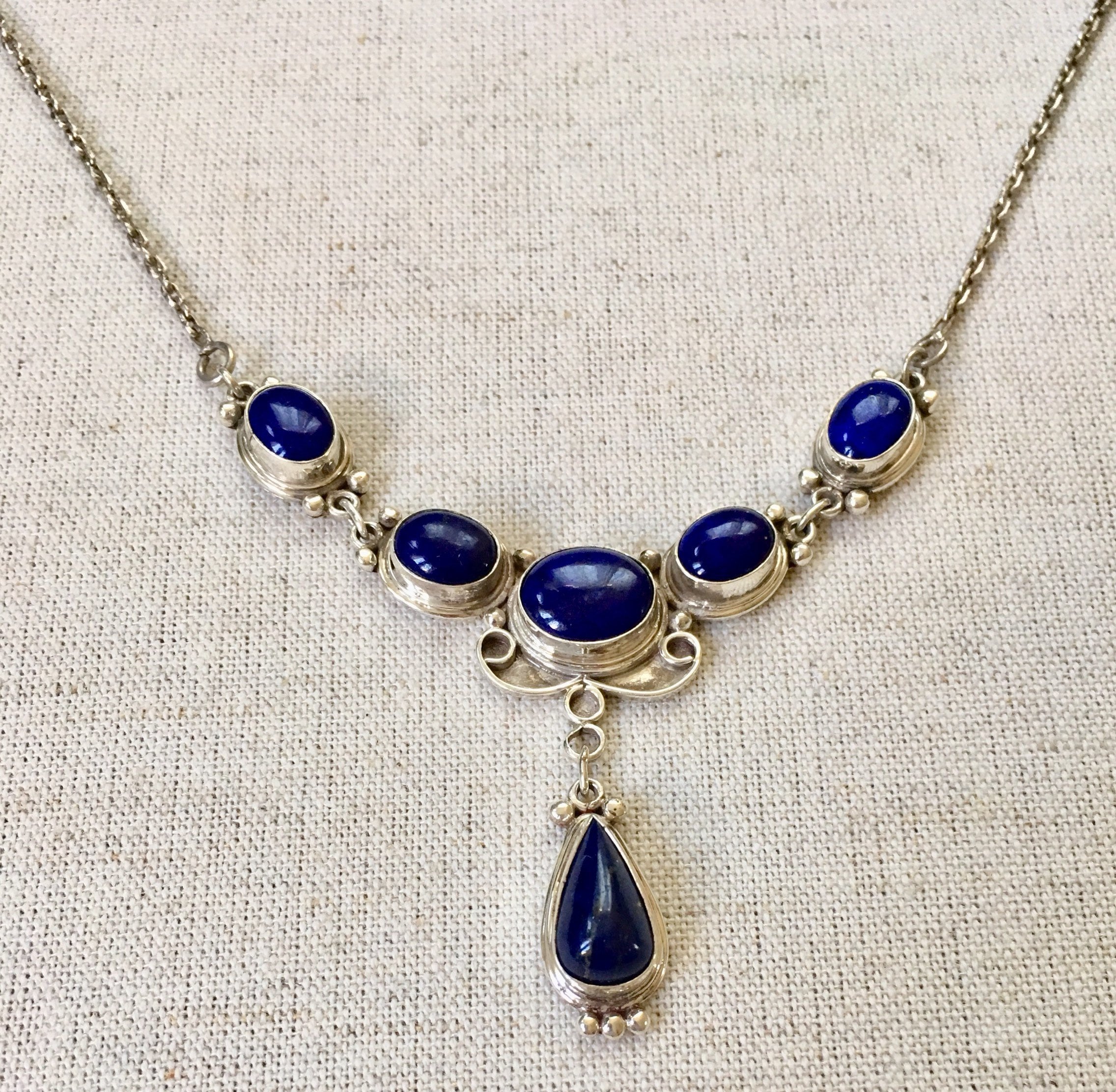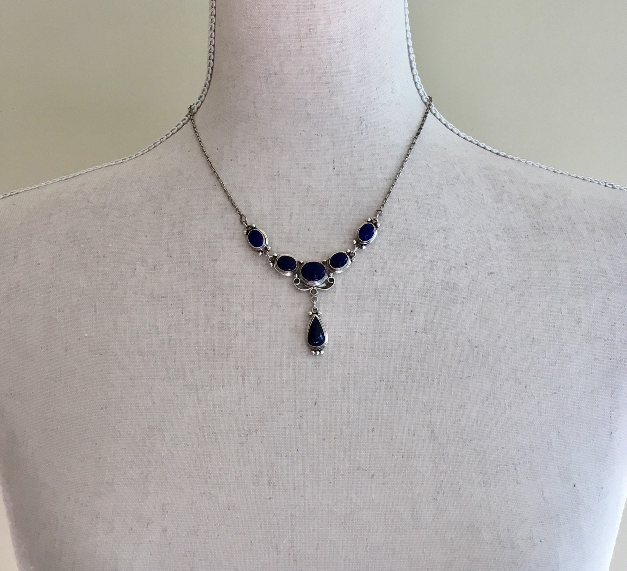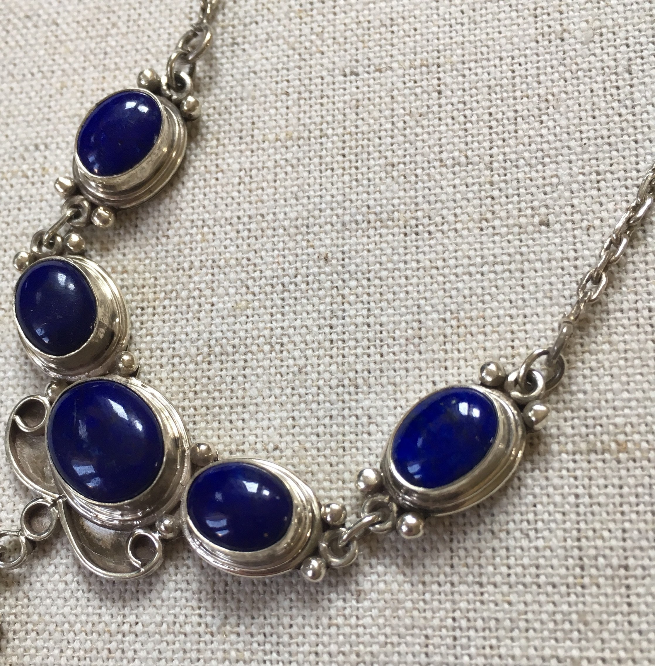Simple vintage handmade Native American Navajo sterling silver necklace with six glossy Lapis Azuli stones.
