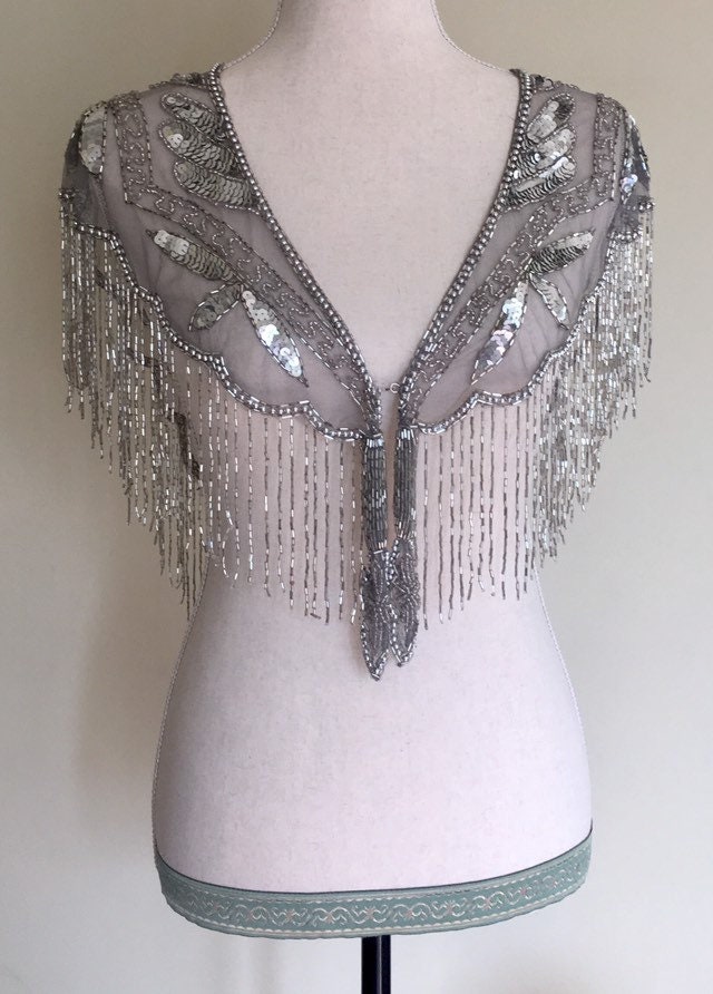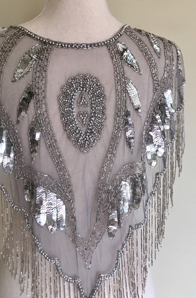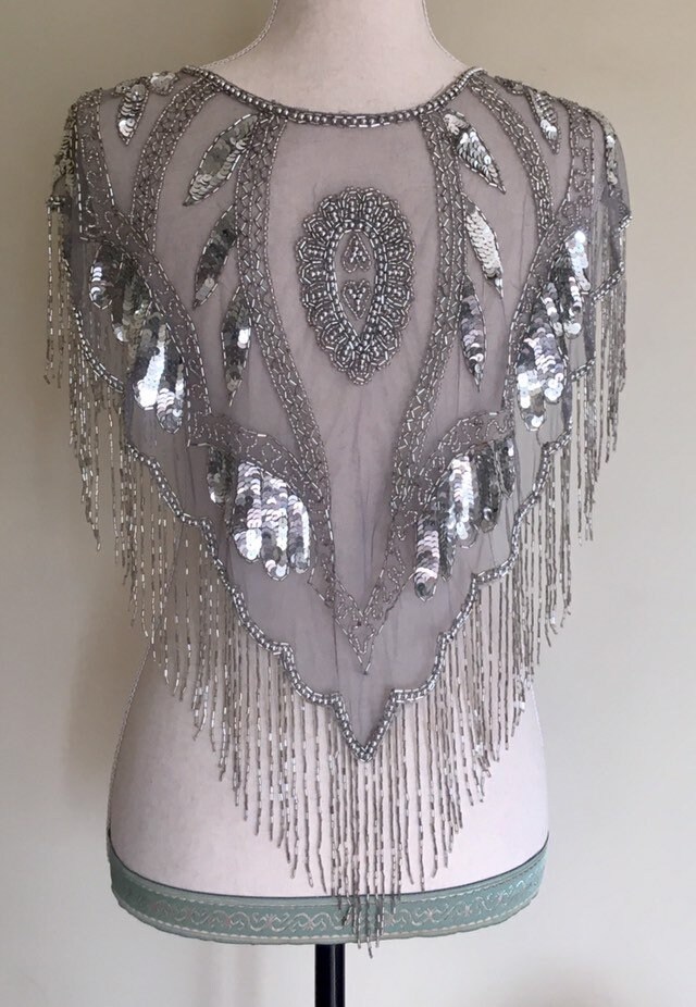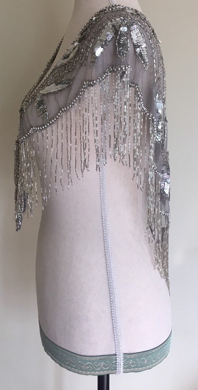 Stunning vintage sheer grey mesh shawl / wrap heavily beaded with beads and sequins. With its great capelet style & flutter sleeves, this piece would be great topped over a wedding, bridesmaid or formal dress.