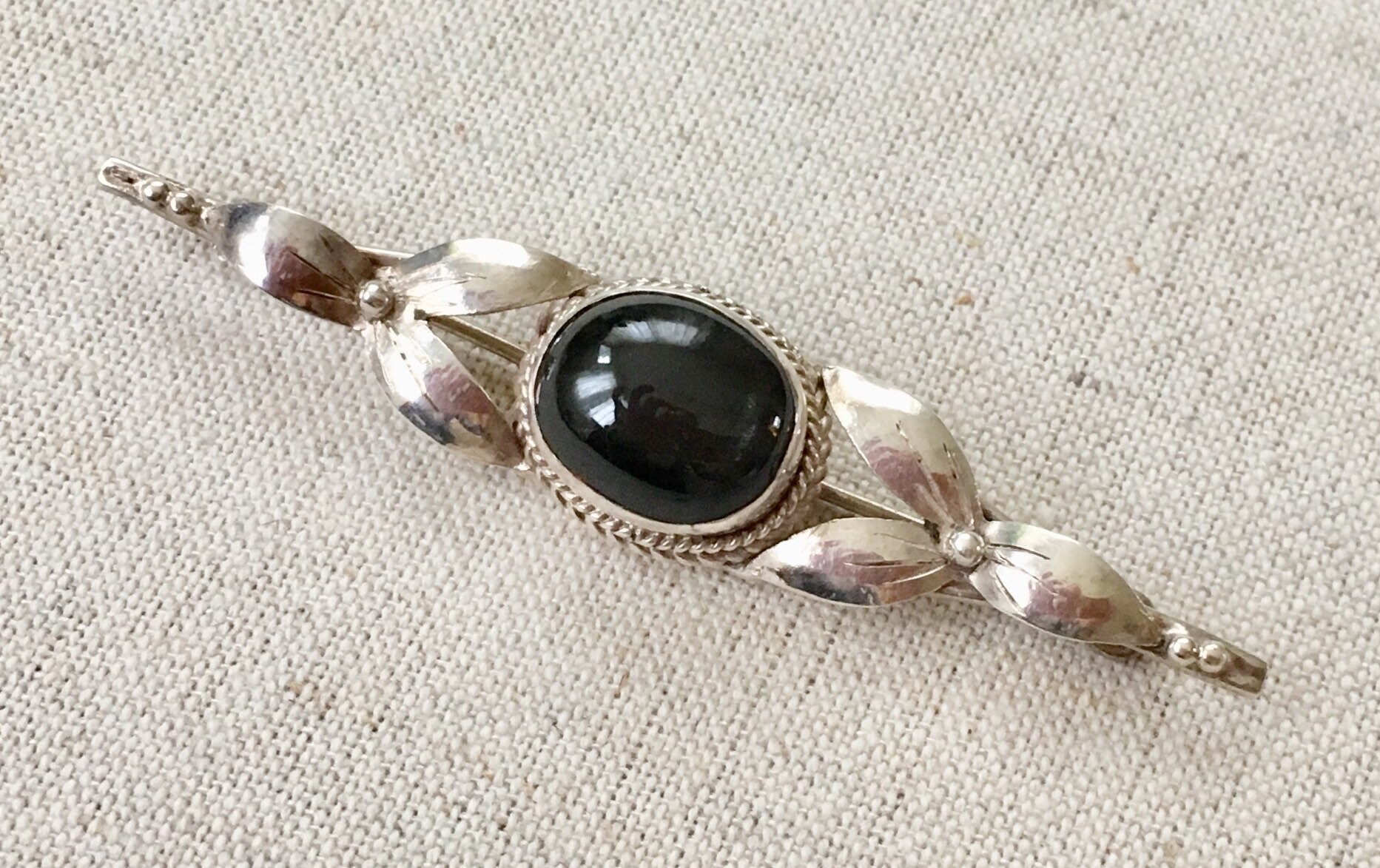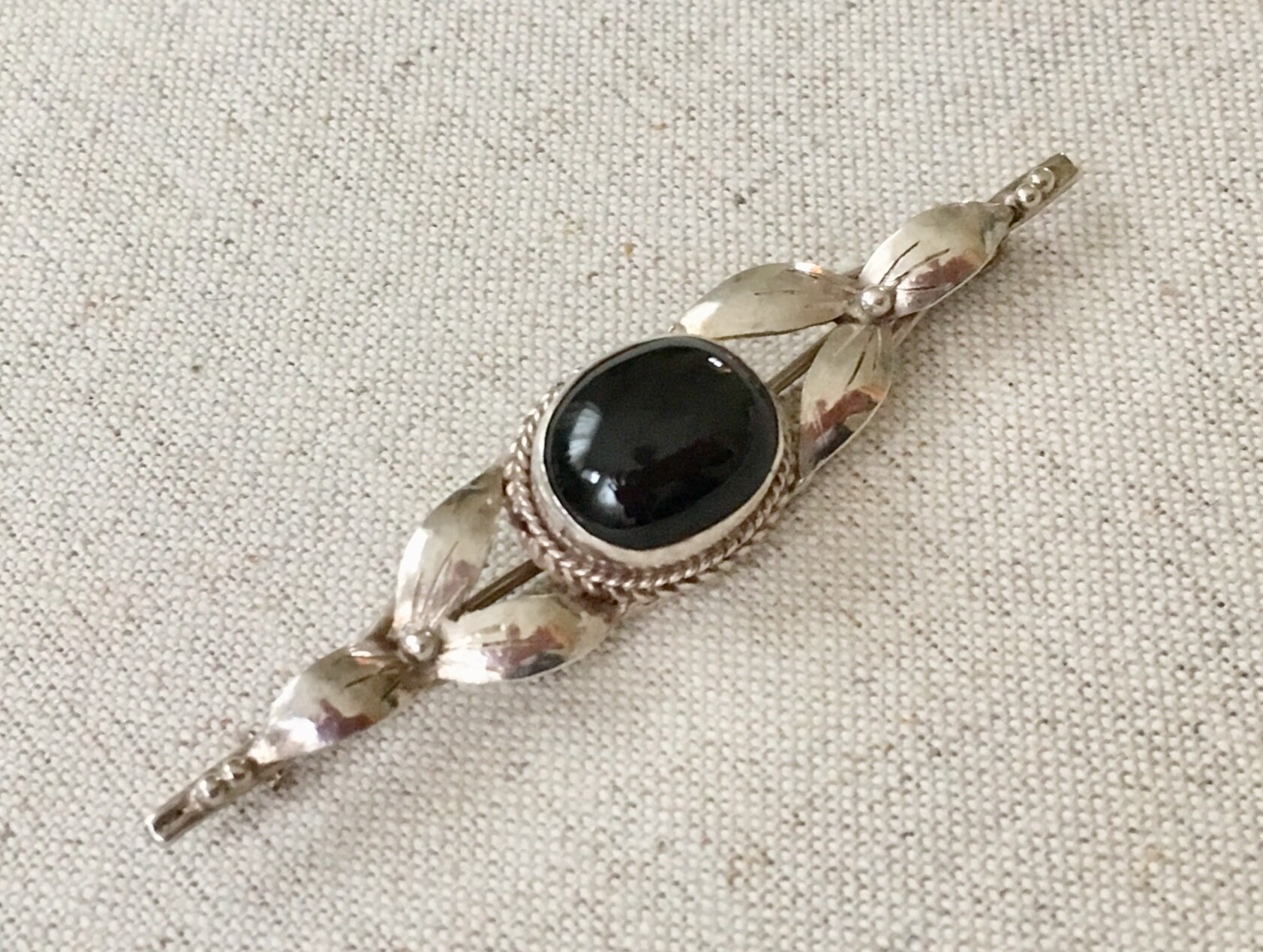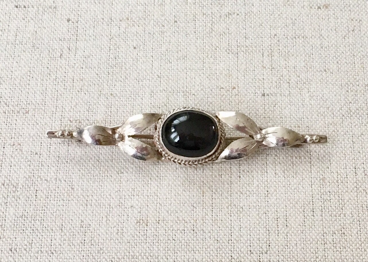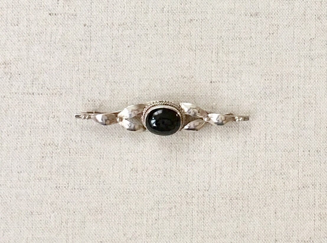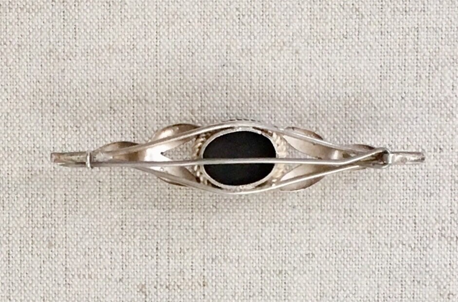 Pretty vintage sterling silver and black onyx pin / brooch with floral and twisted rope scroll work.