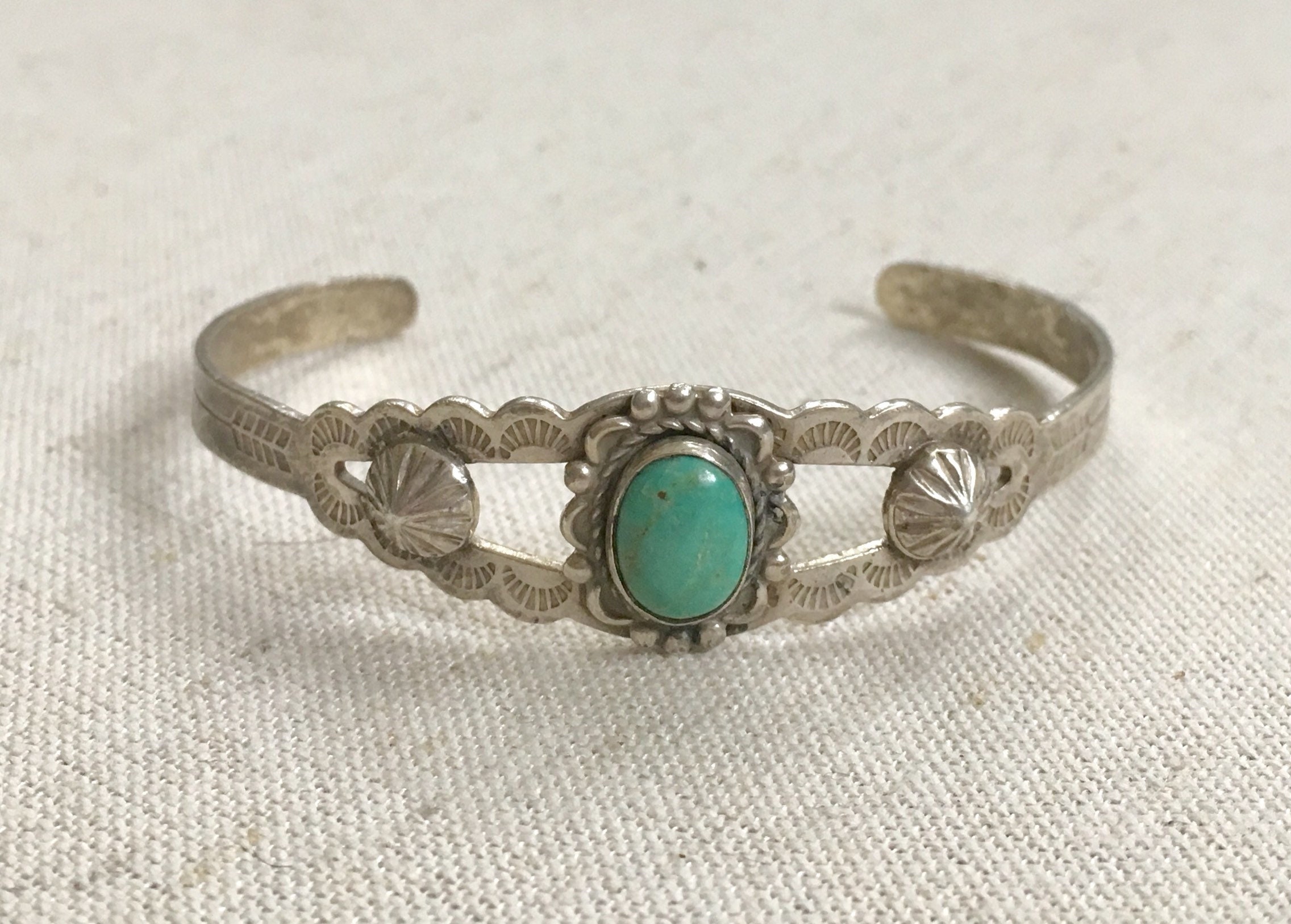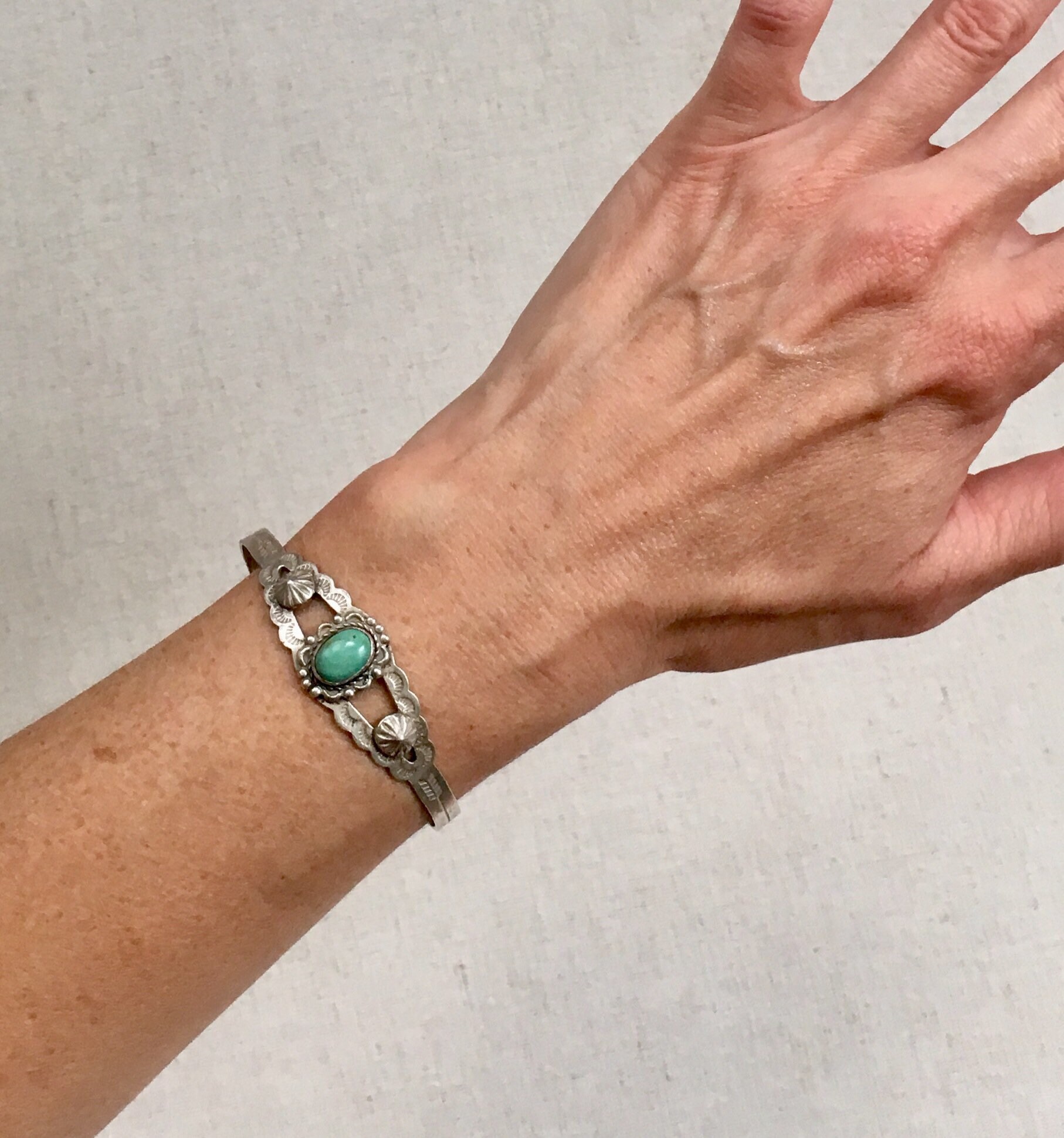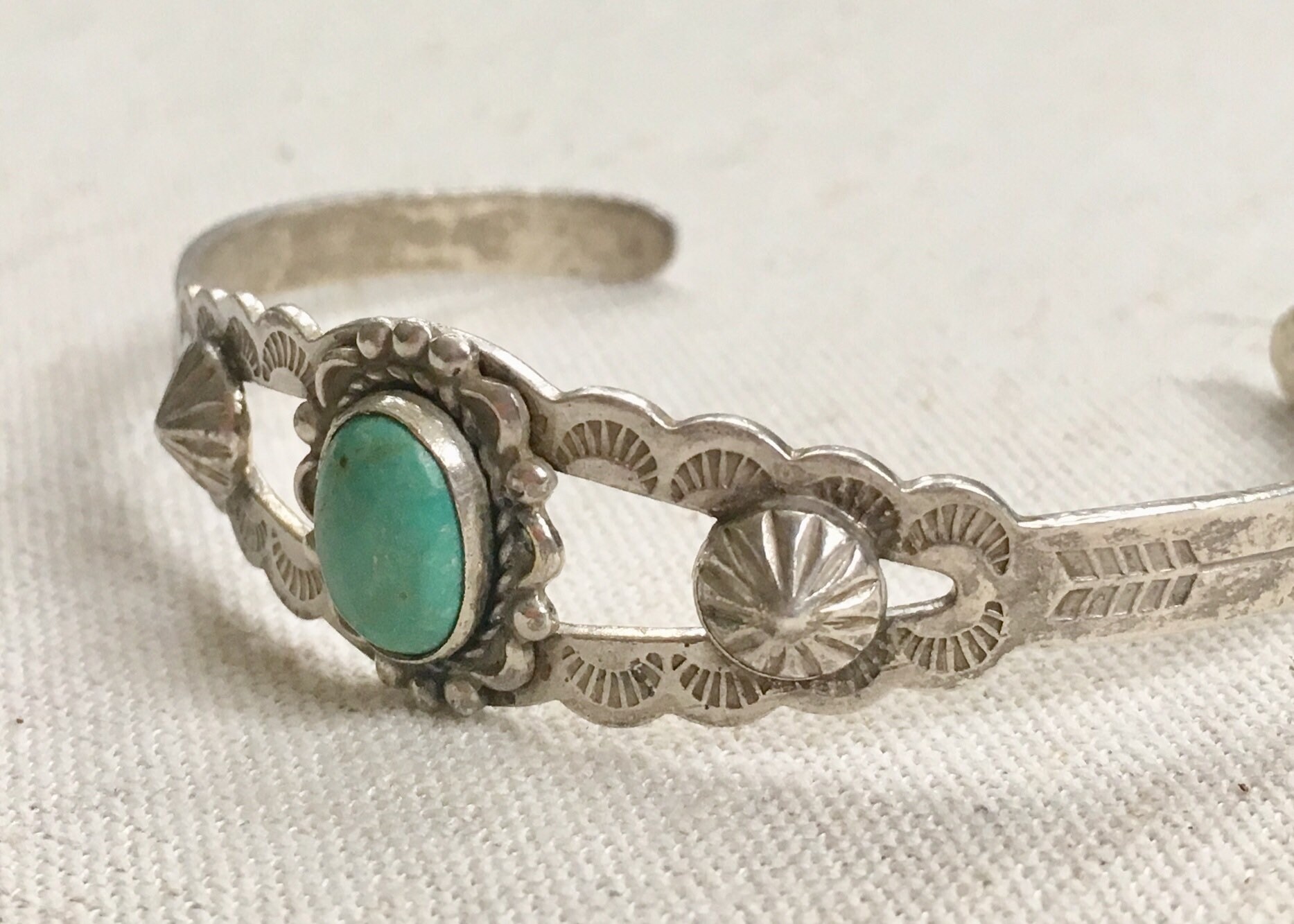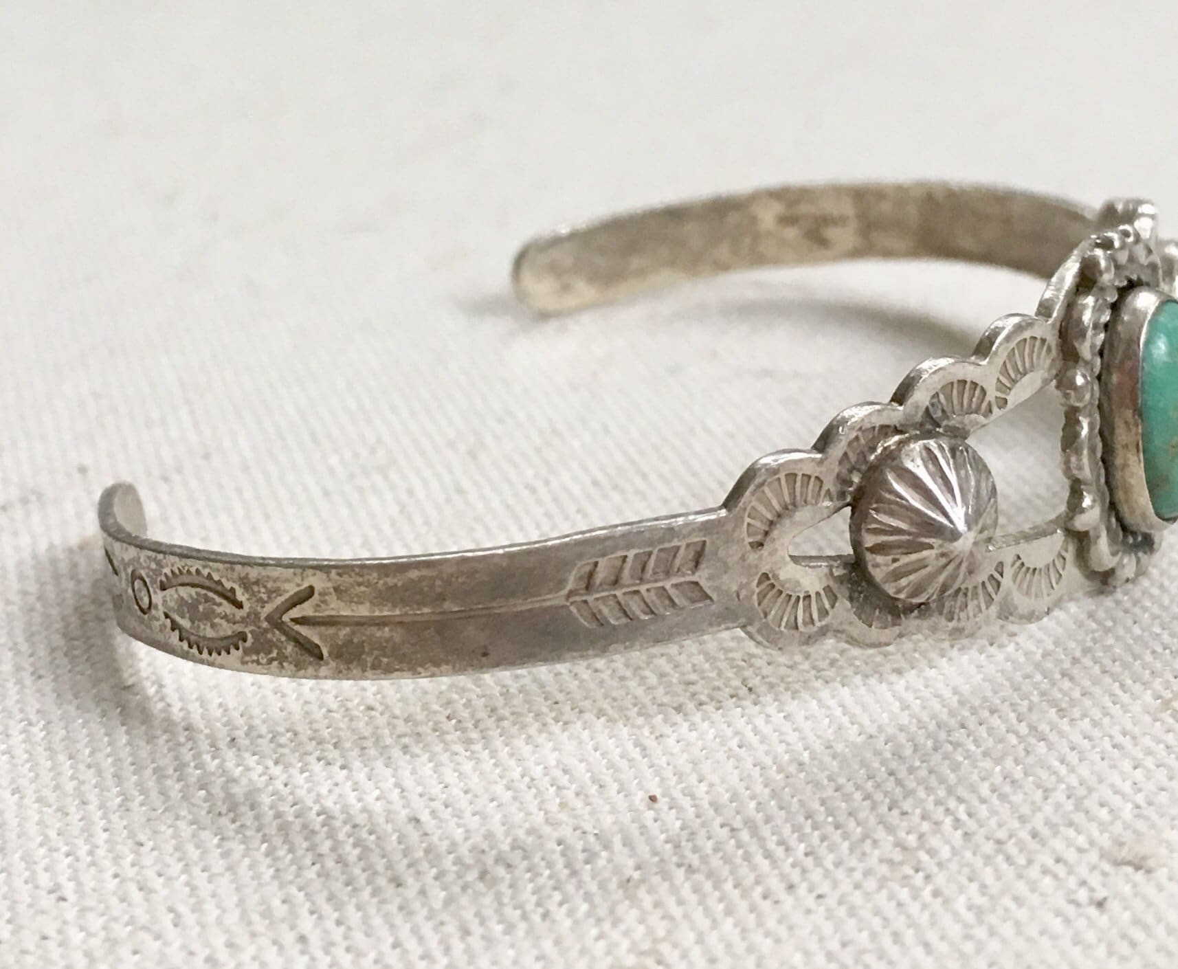 Delicate vintage Fred Harvey era Bell Trading Native American hand stamped sterling silver and turquoise bracelet cuff
