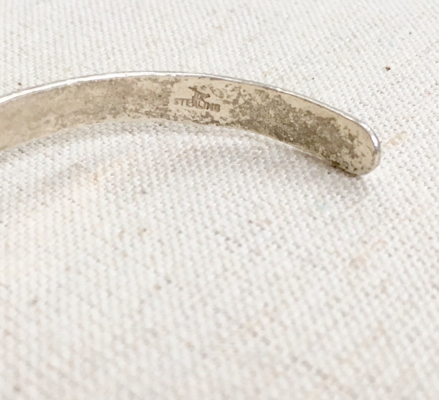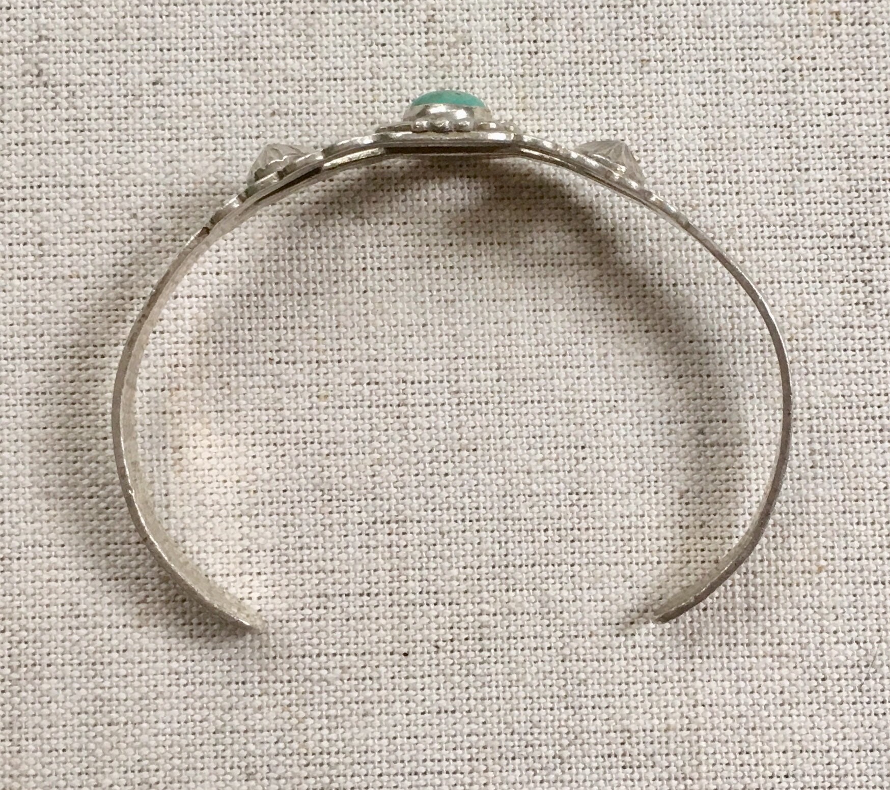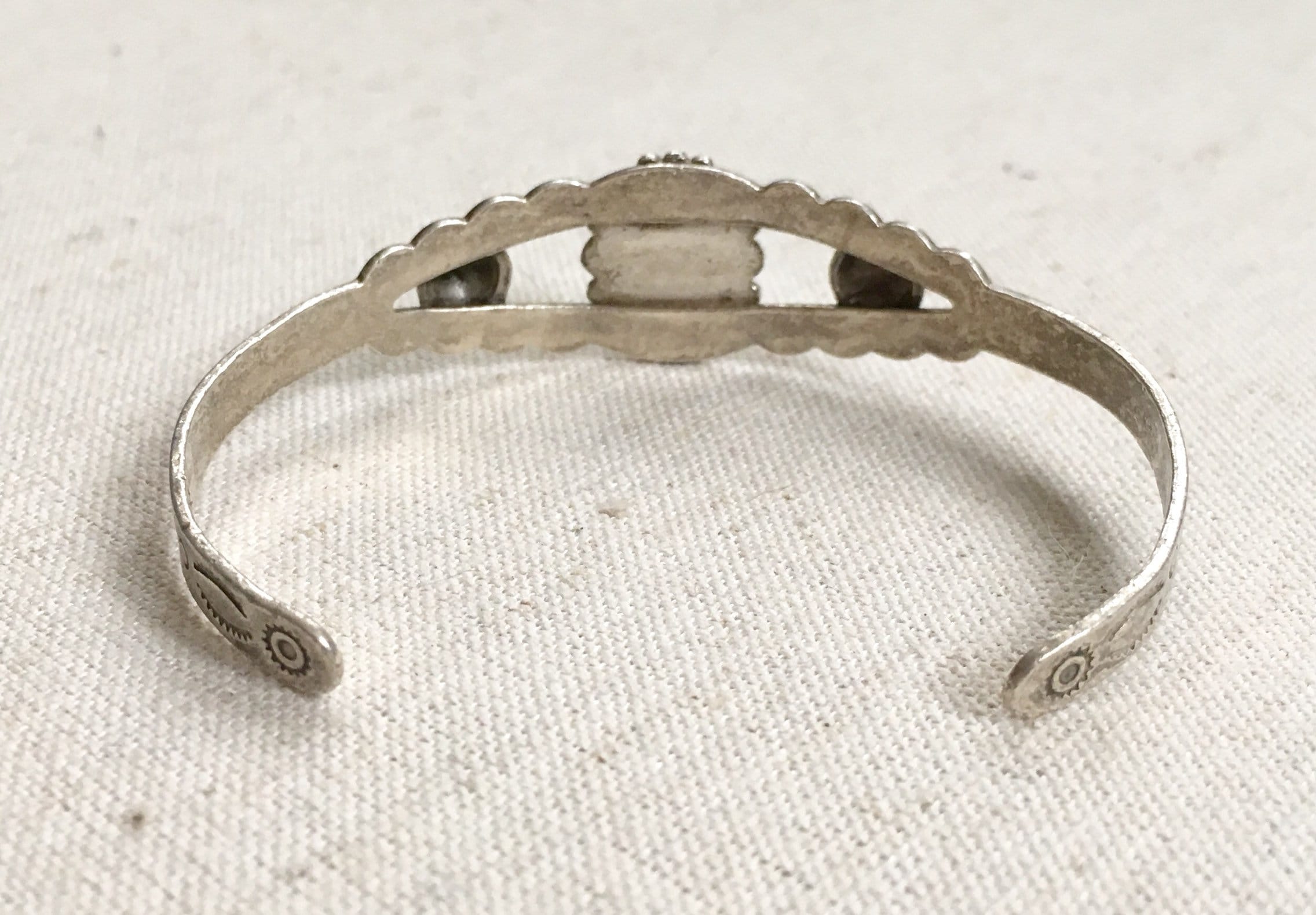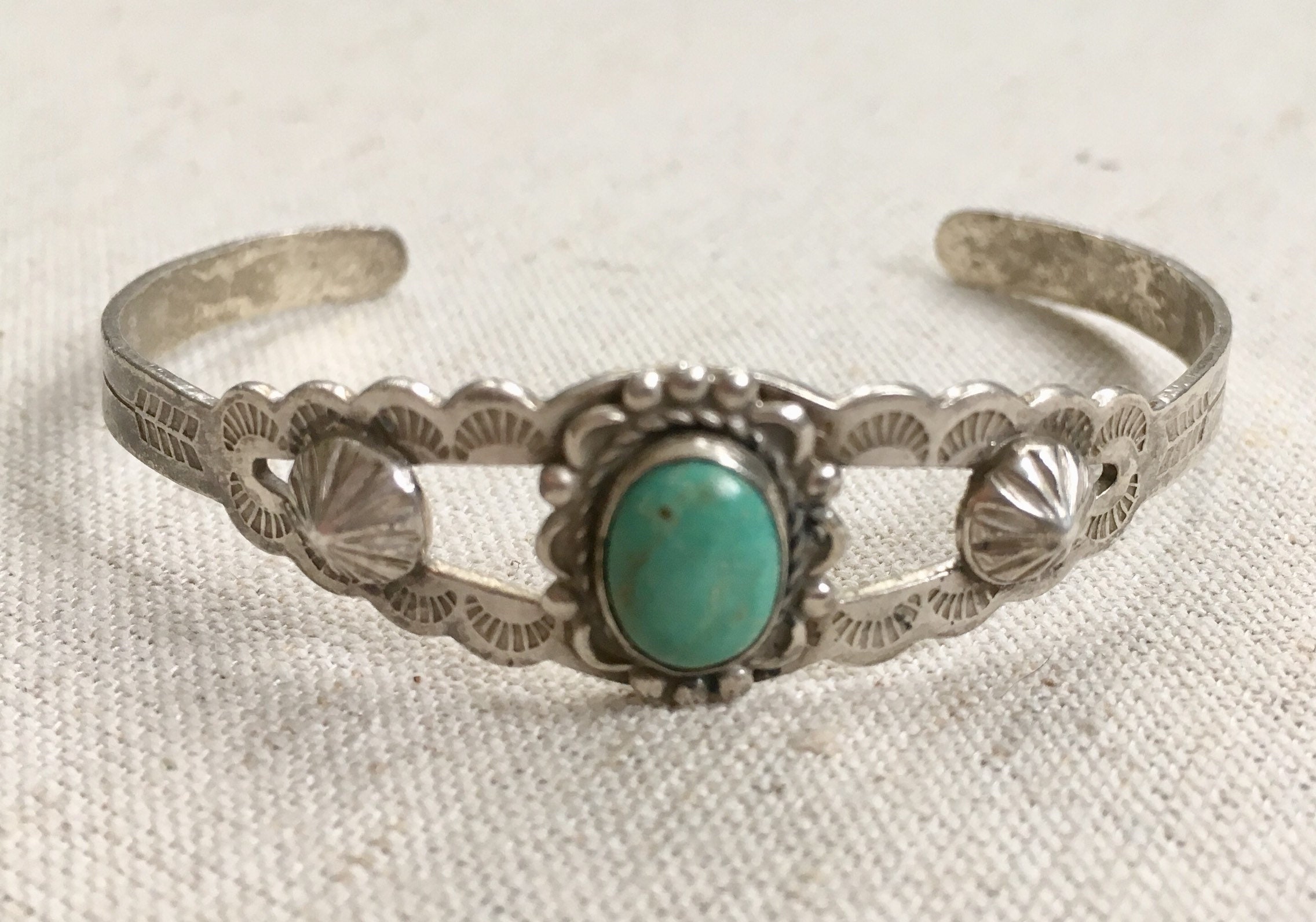 Delicate vintage Fred Harvey era Bell Trading Native American hand stamped sterling silver and turquoise bracelet cuff