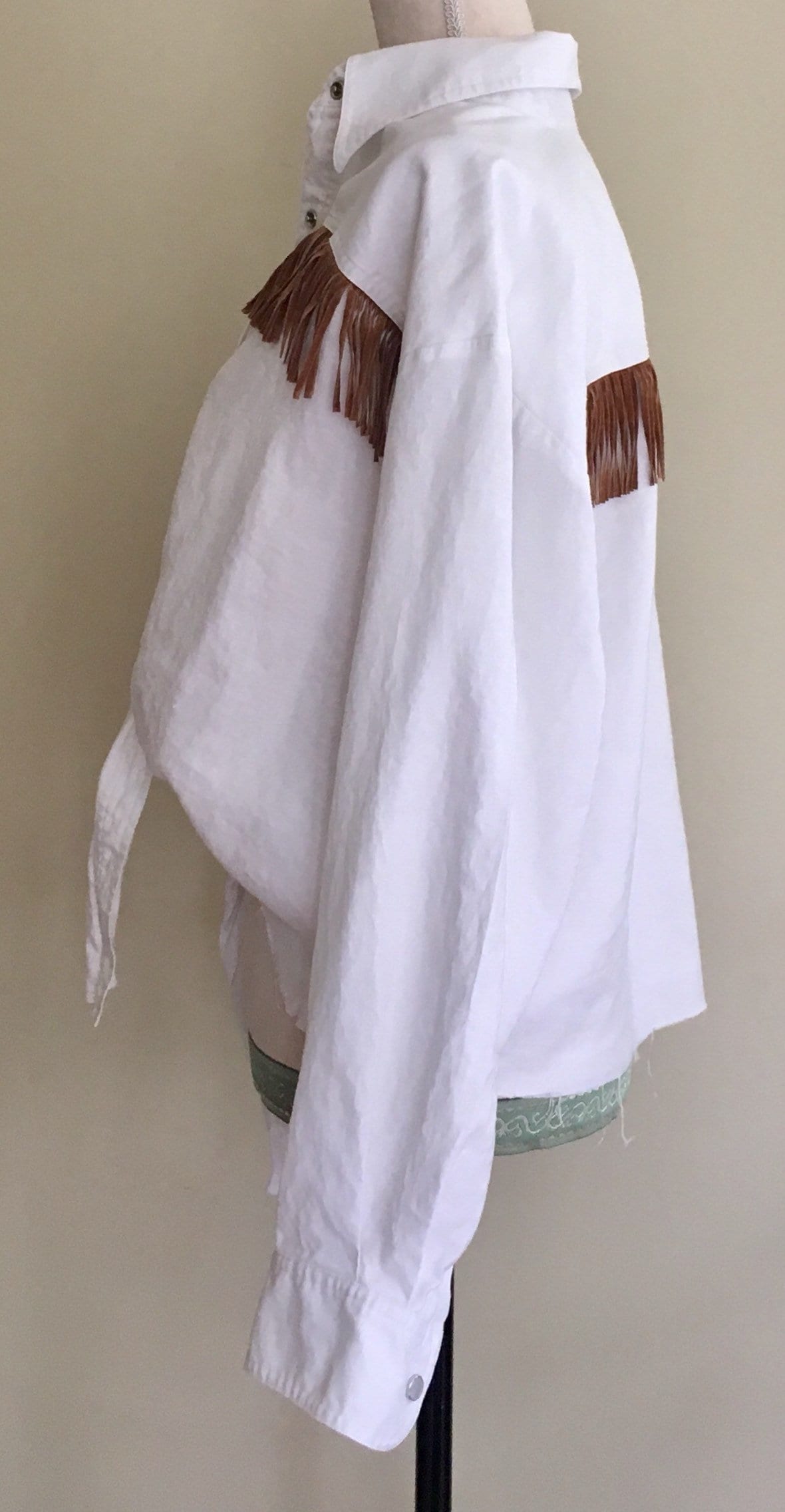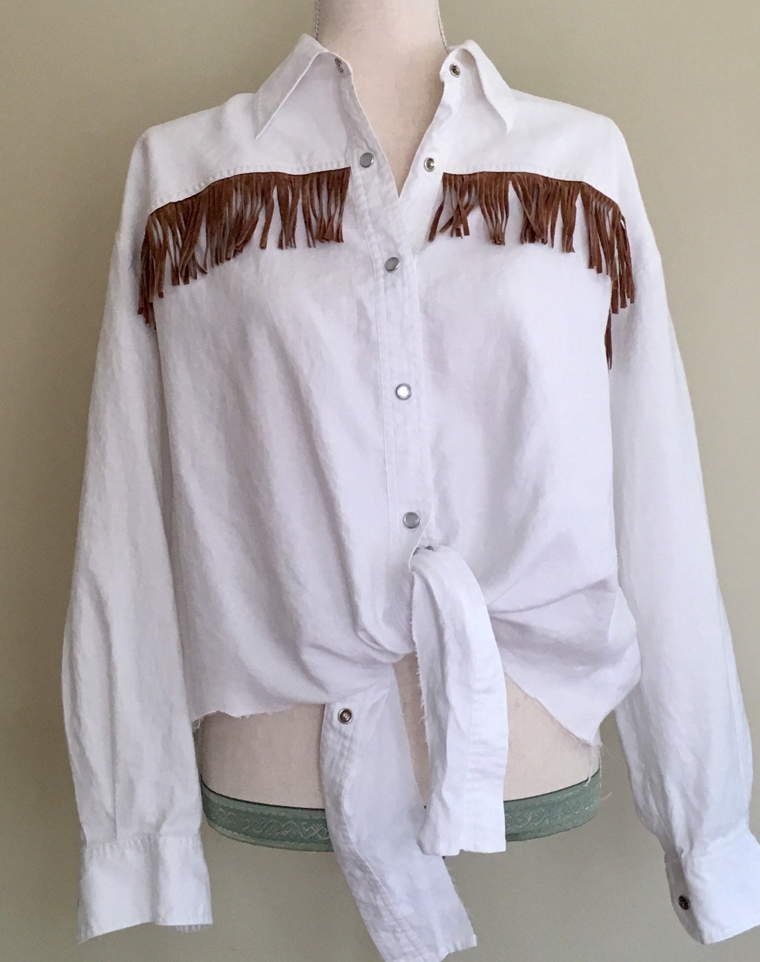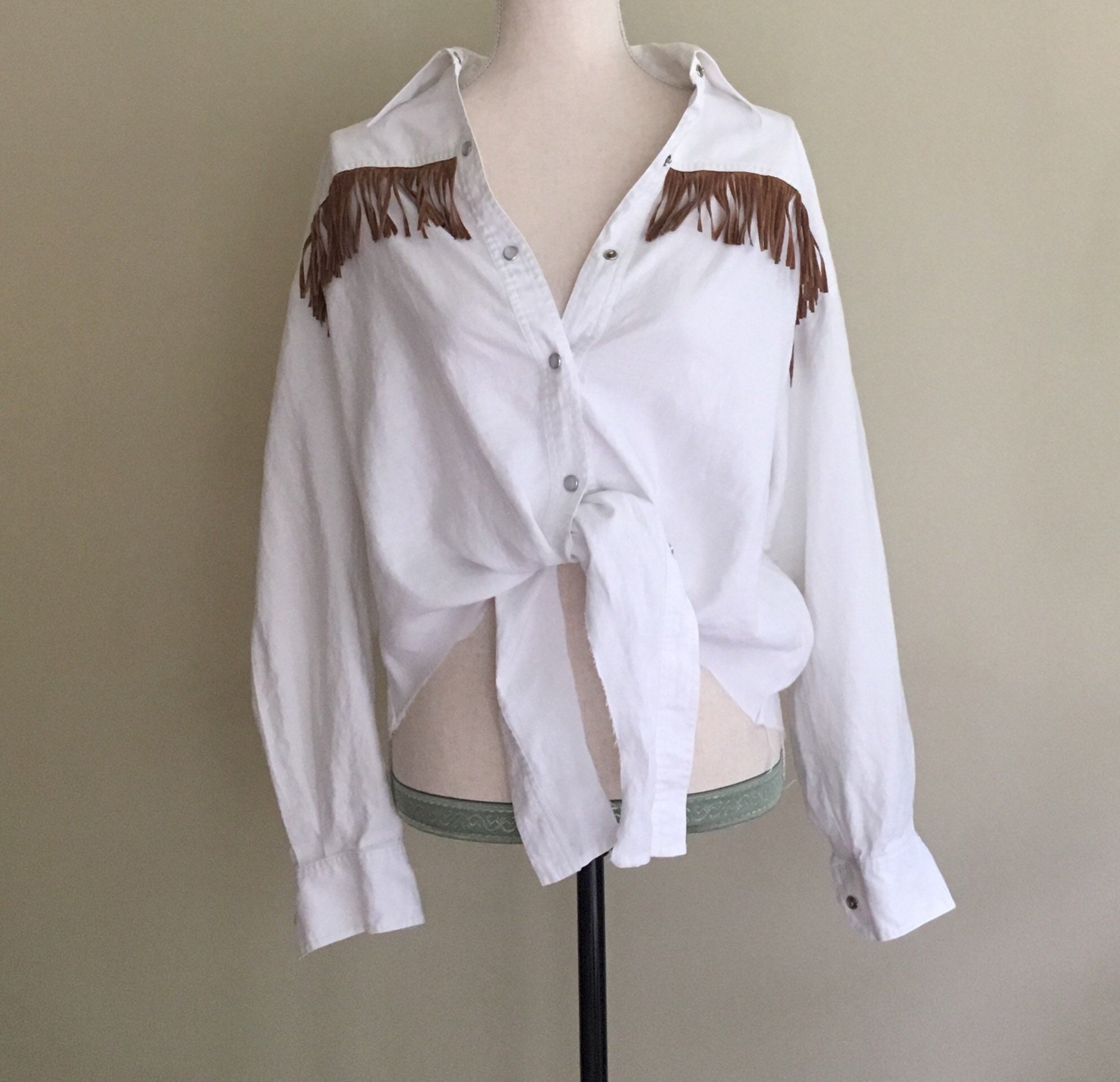 Fun vintage Bergdorf Goodman "On the Plaza" white linen Western snap shirt with brown fringe across the chest, "tie" at front and unfinished hemline.