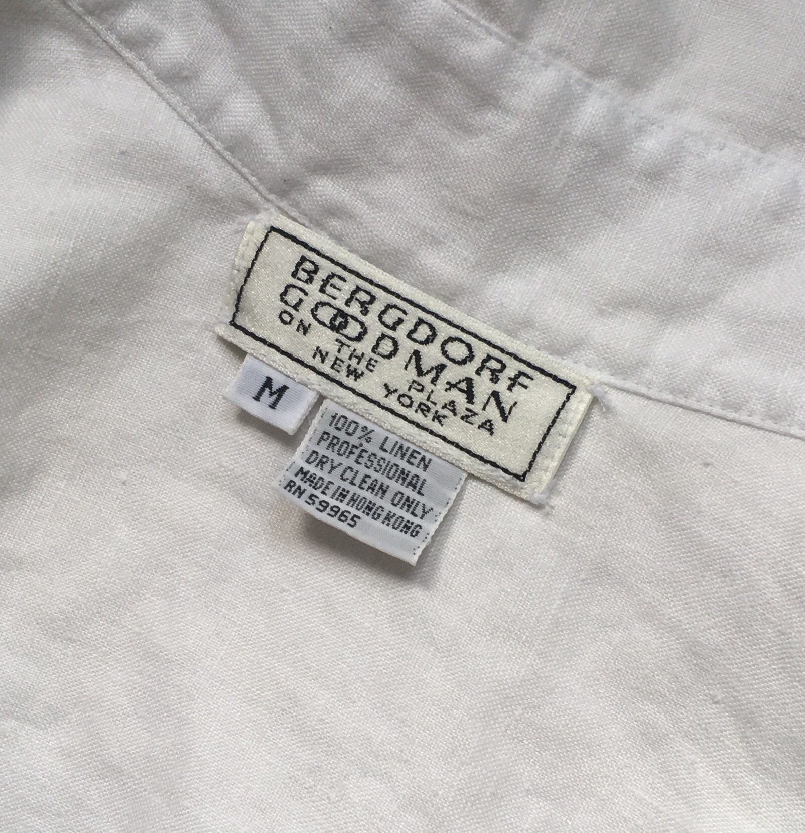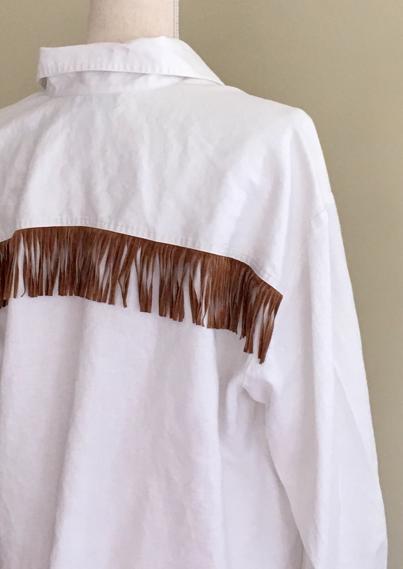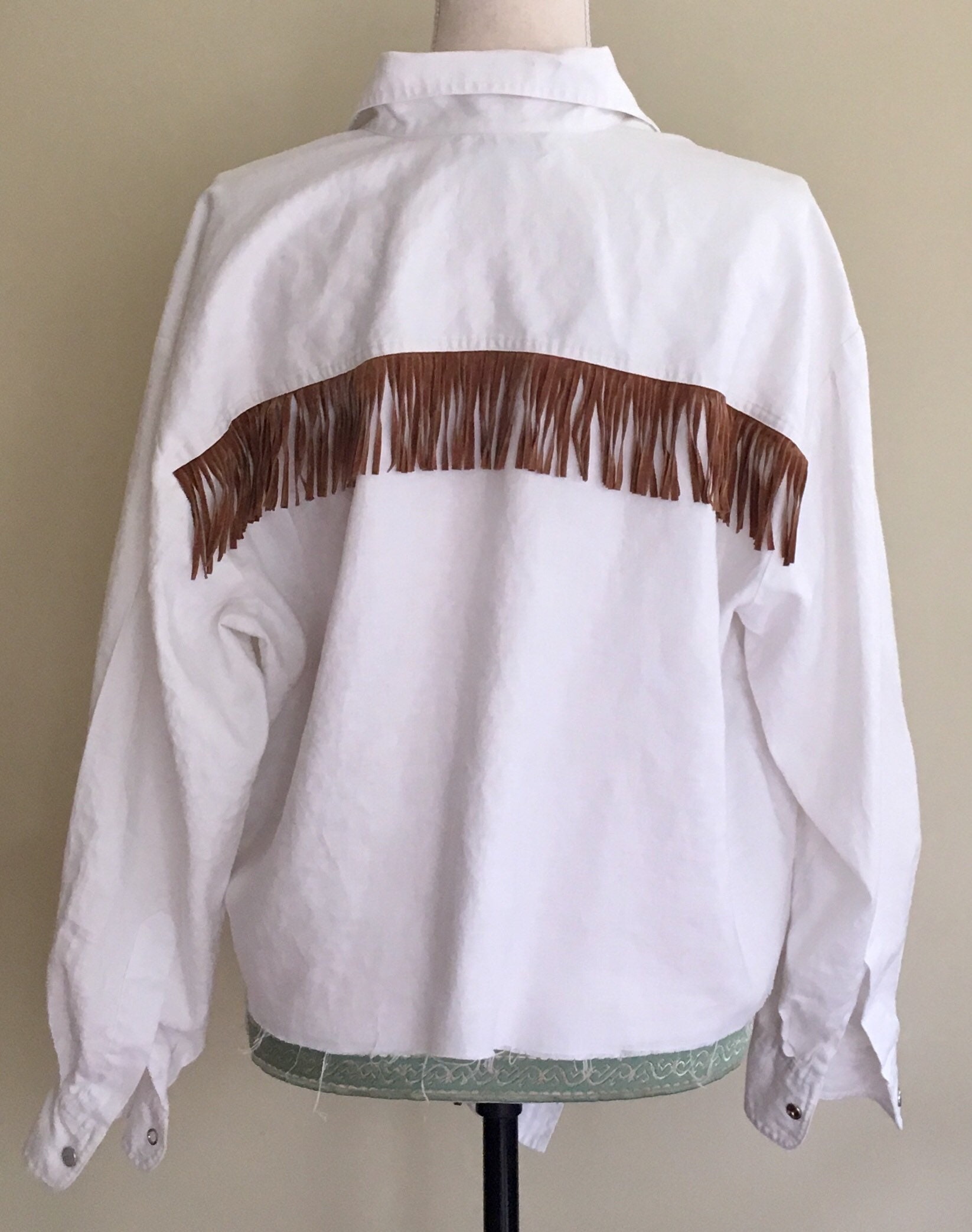 Fun vintage Bergdorf Goodman "On the Plaza" white linen Western snap shirt with brown fringe across the chest, "tie" at front and unfinished hemline.