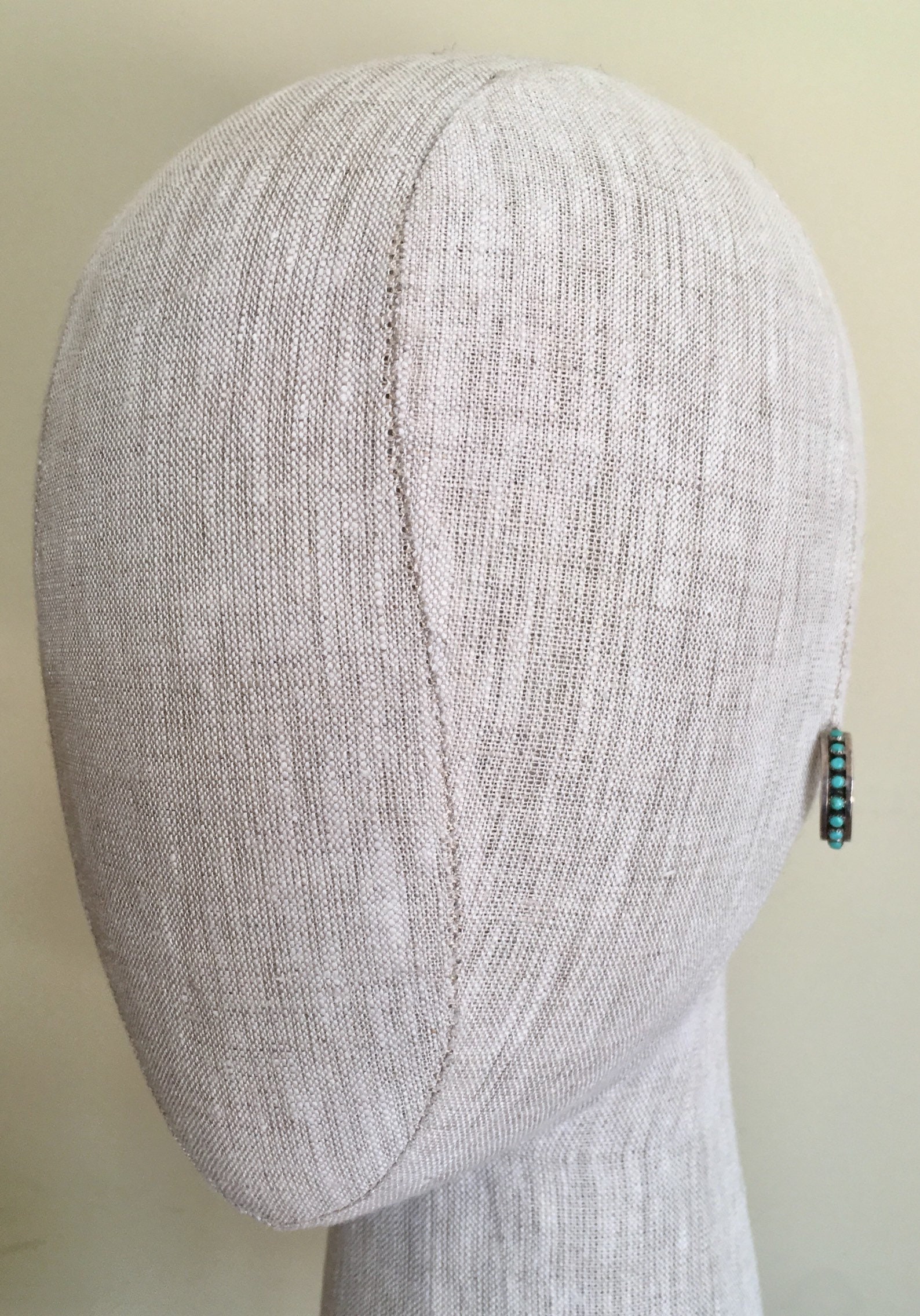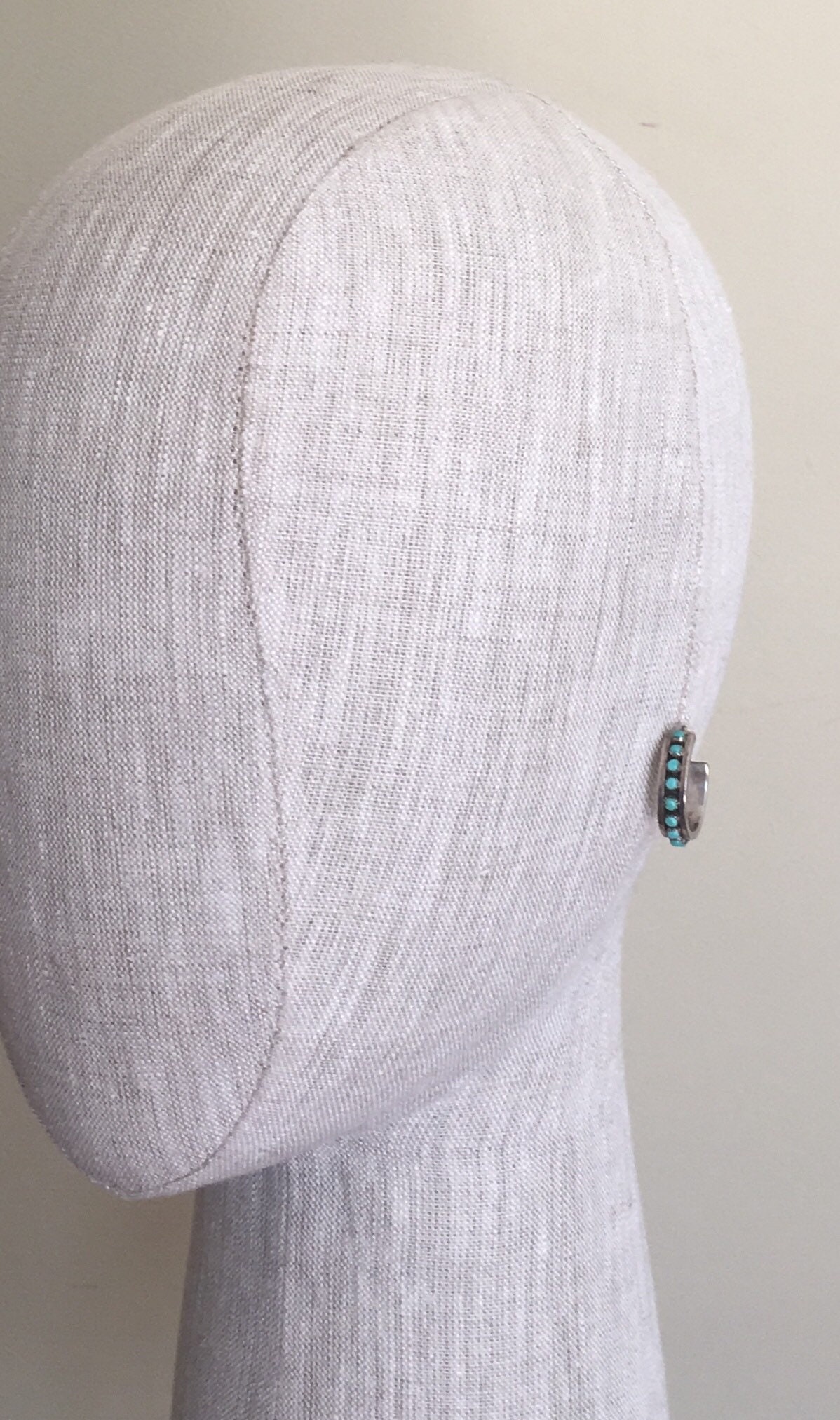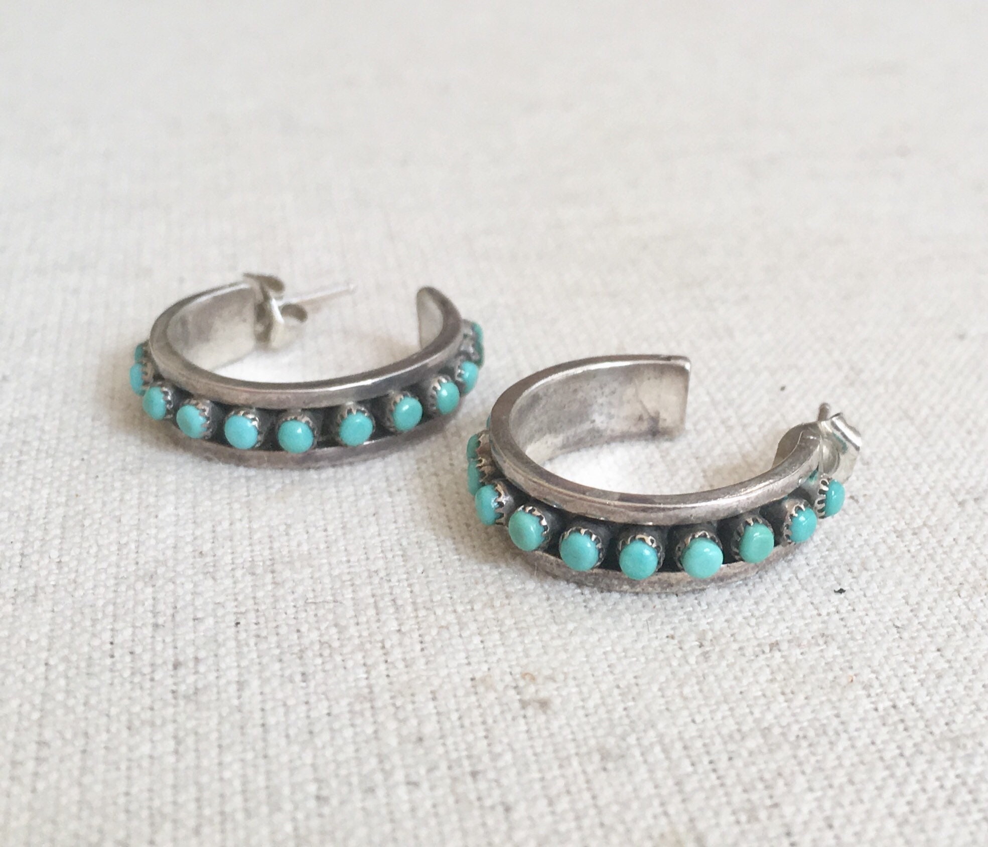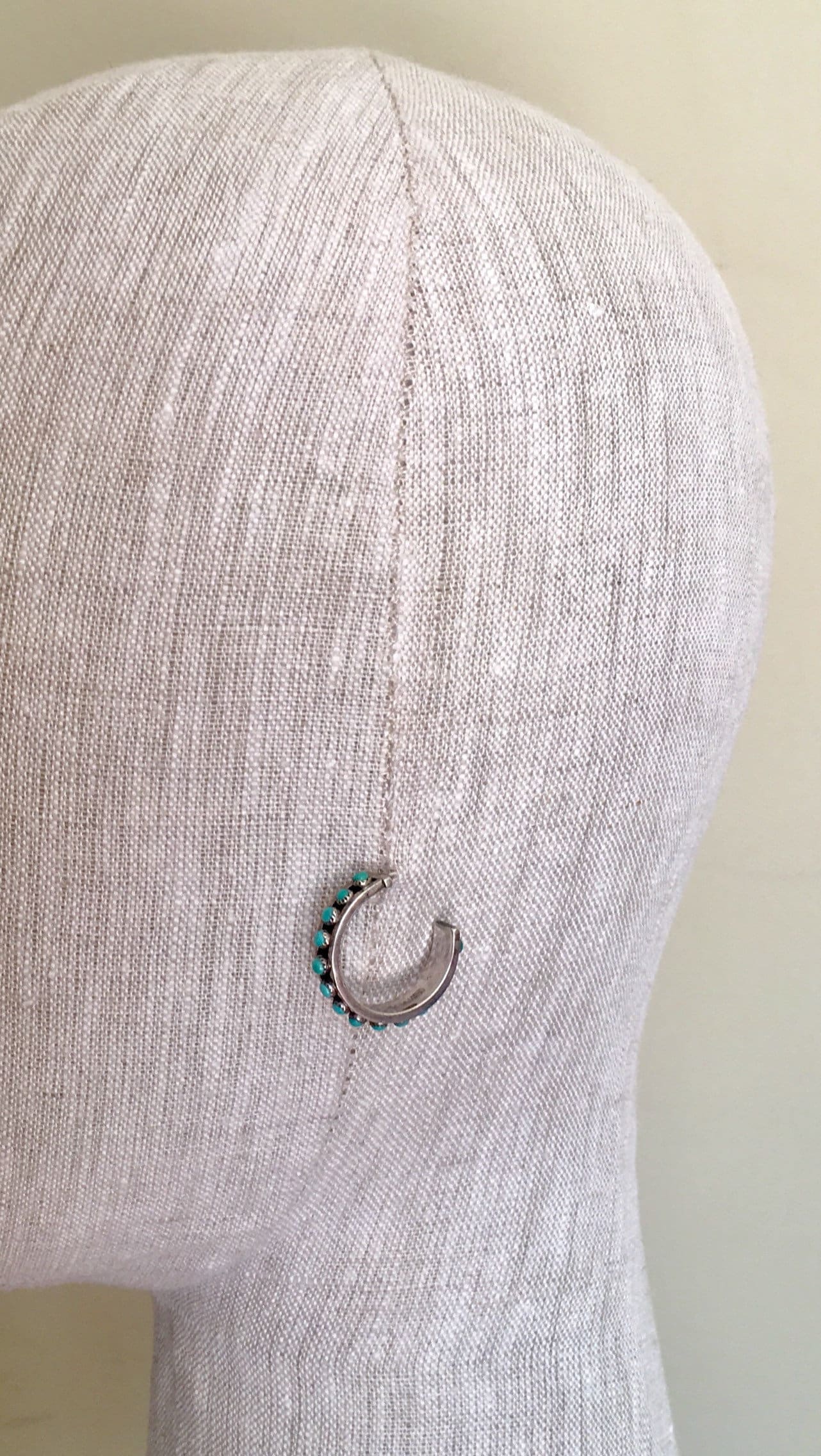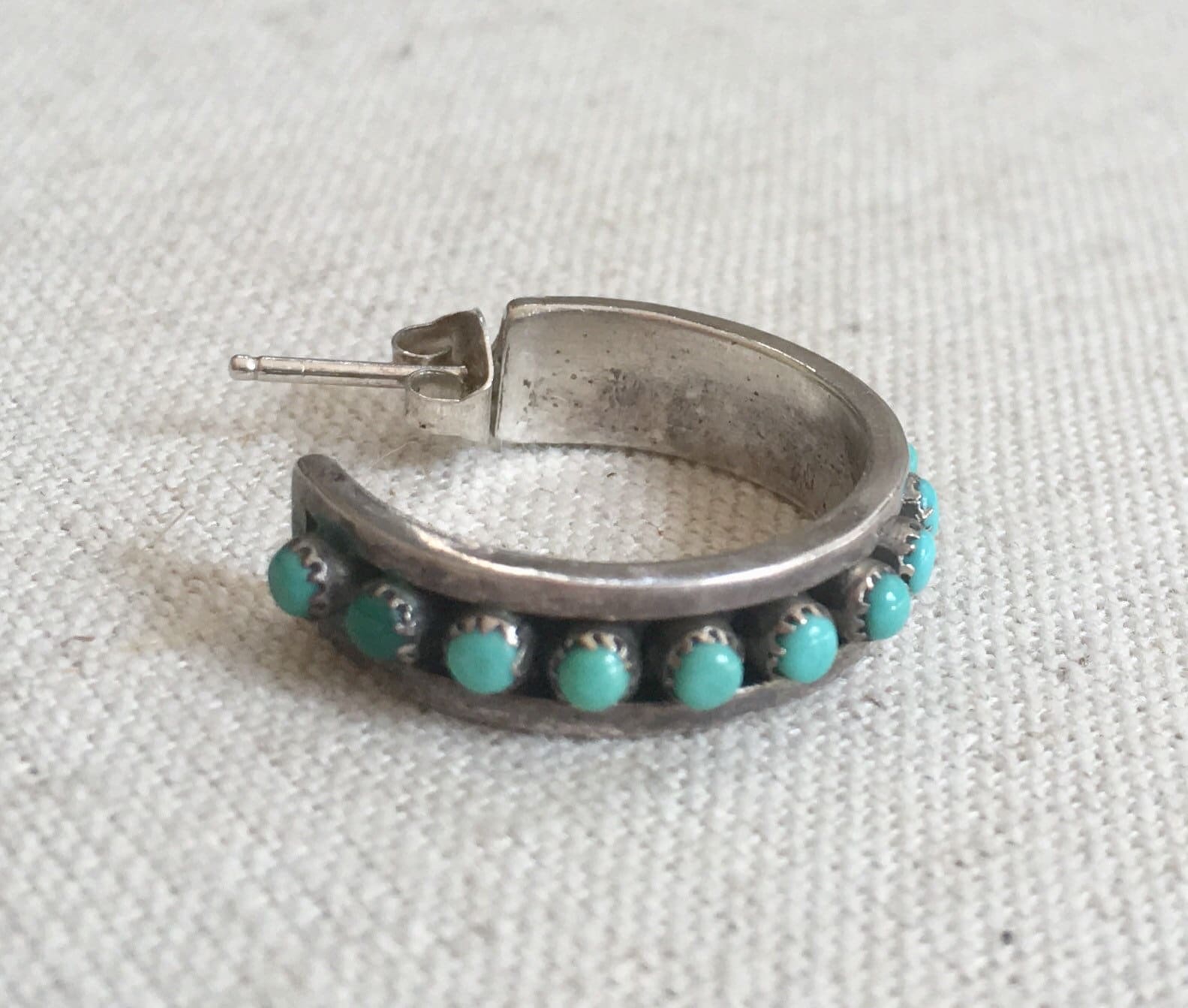Vintage Native American Zuni sterling silver hoop earrings with 14 meticulously inset turquoise stones on each earring