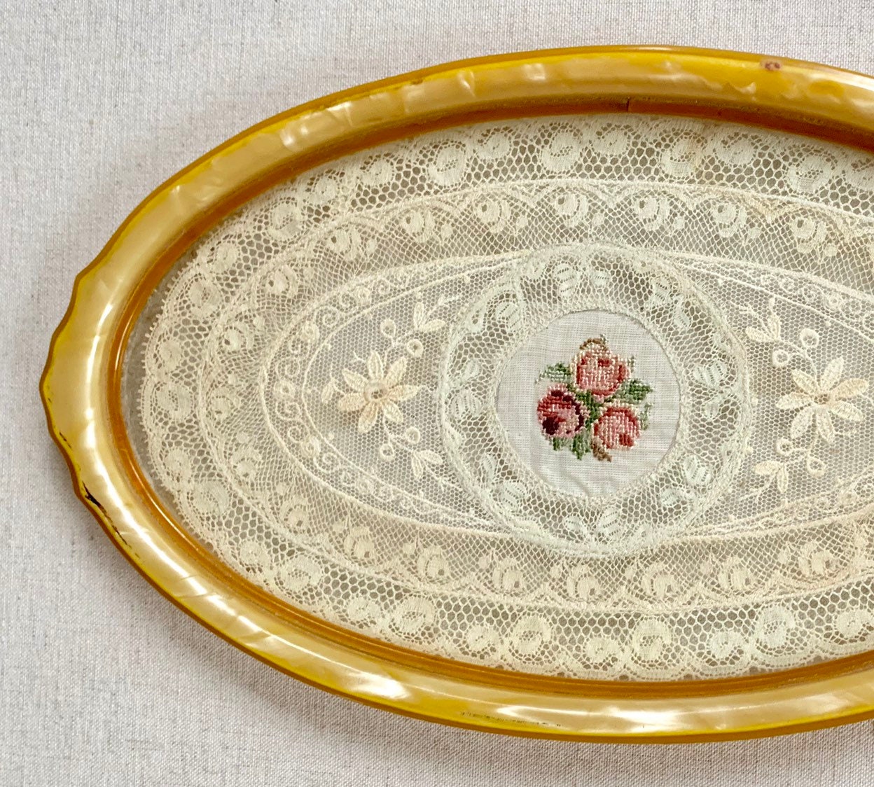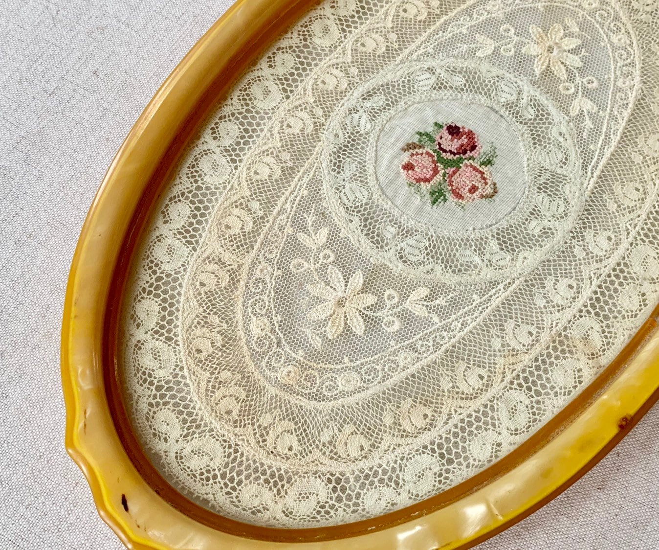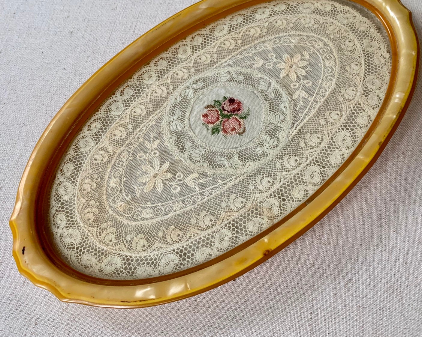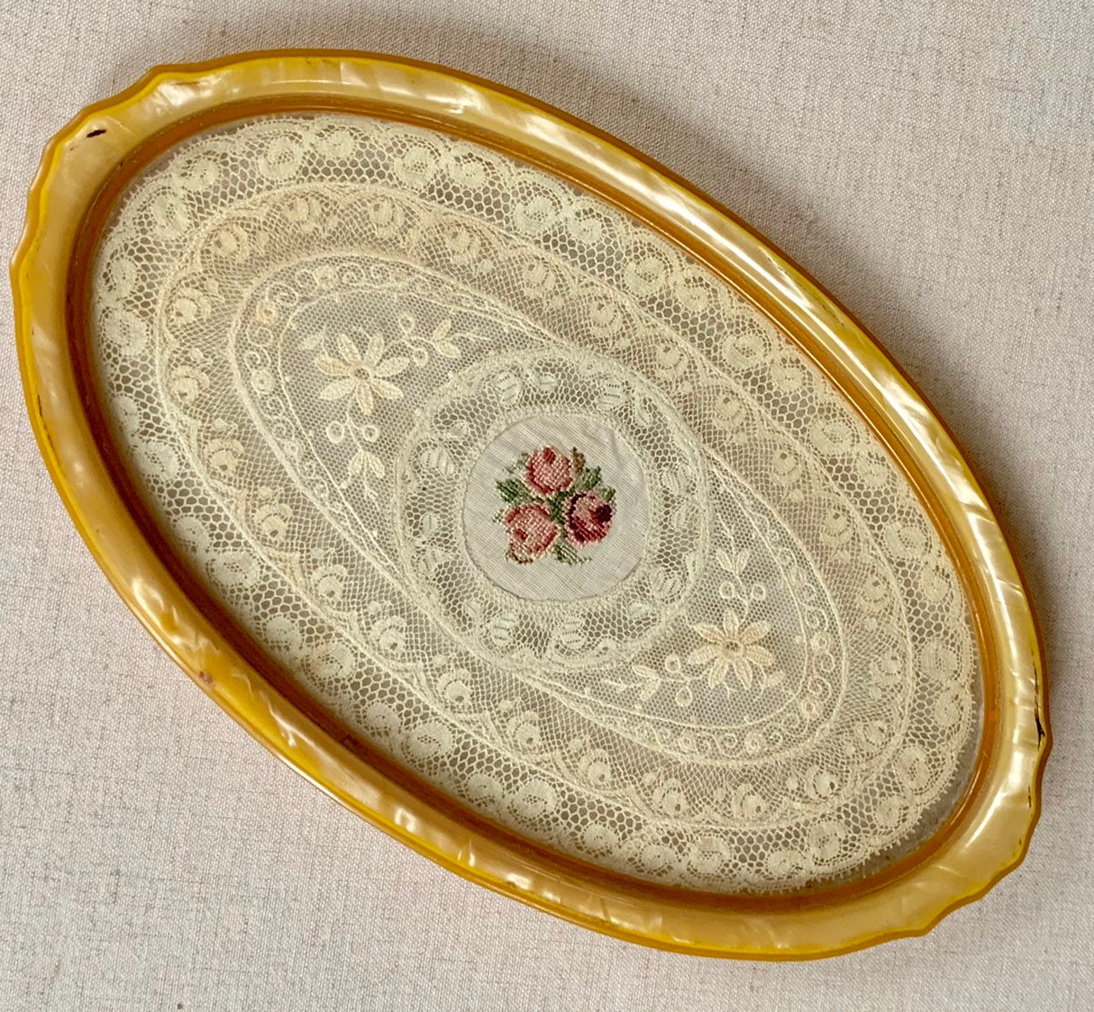 Adorable vintage Victorian lace vanity tray with desert rose cross stitch center and pearlized bakelite trim.