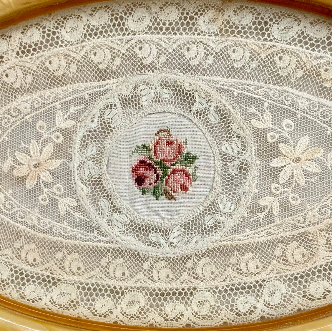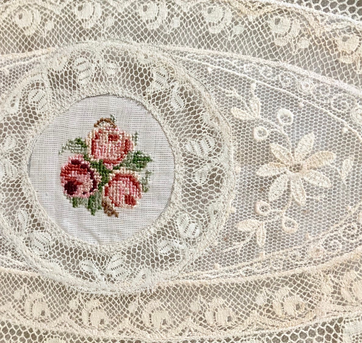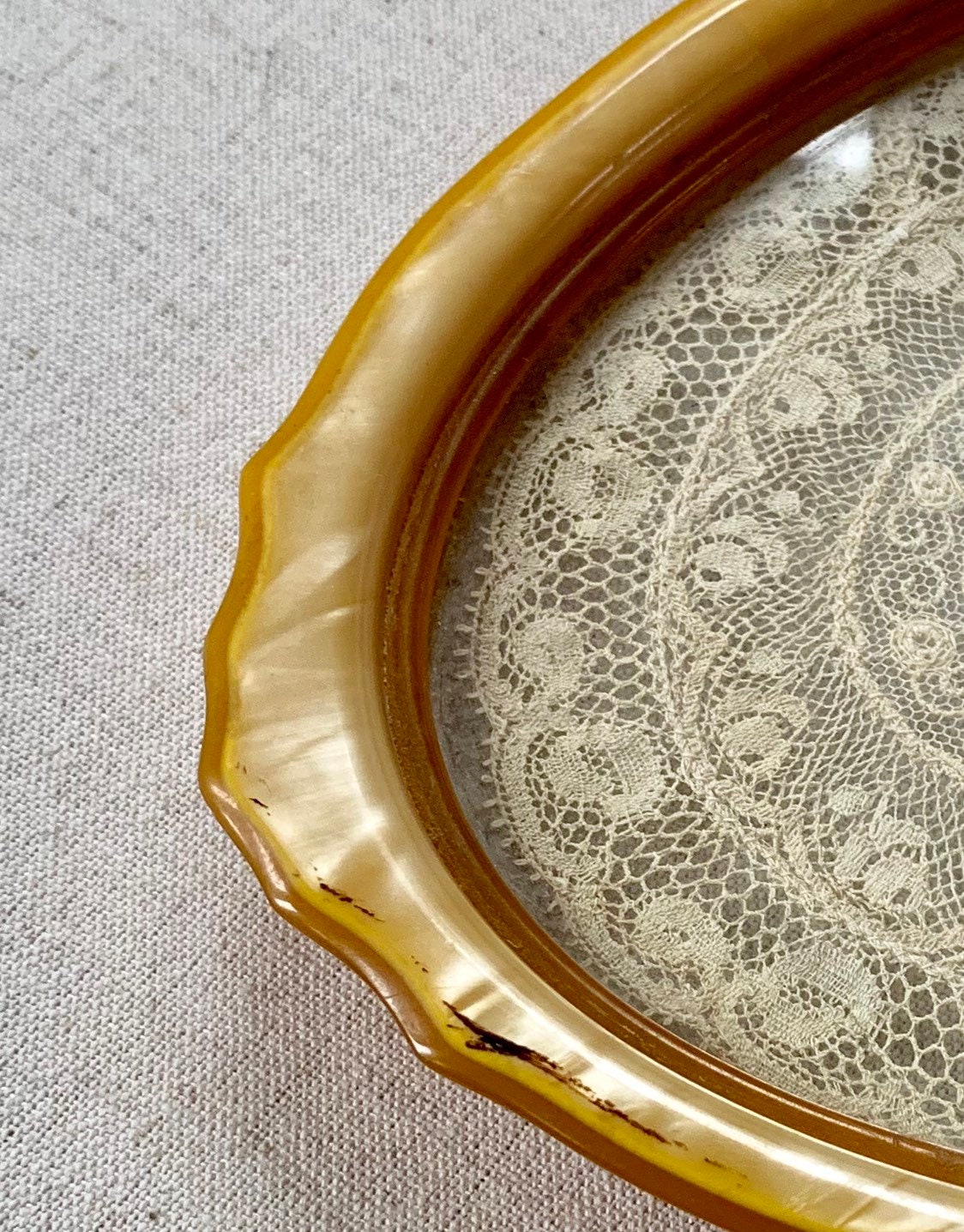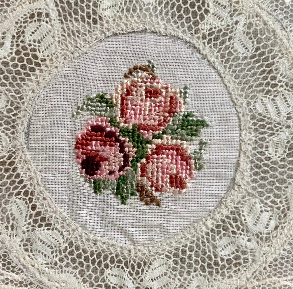 Adorable vintage Victorian lace vanity tray with desert rose cross stitch center and pearlized bakelite trim.