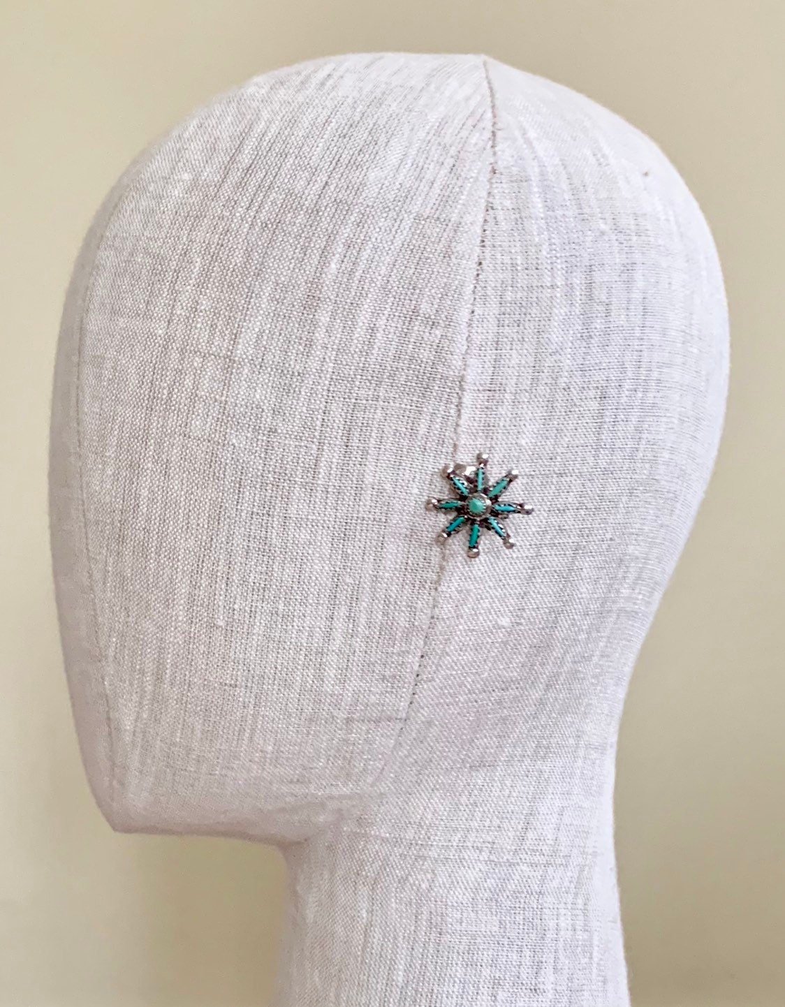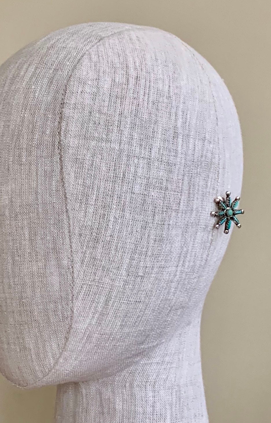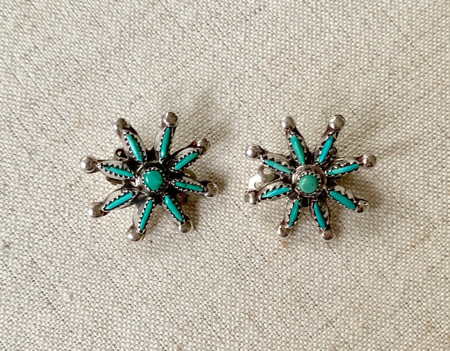 Beautifully crafted vintage 40's Native American Zuni sterling silver and needlepoint turquoise CLIP-ON earrings set in a delicate flower / starburst design