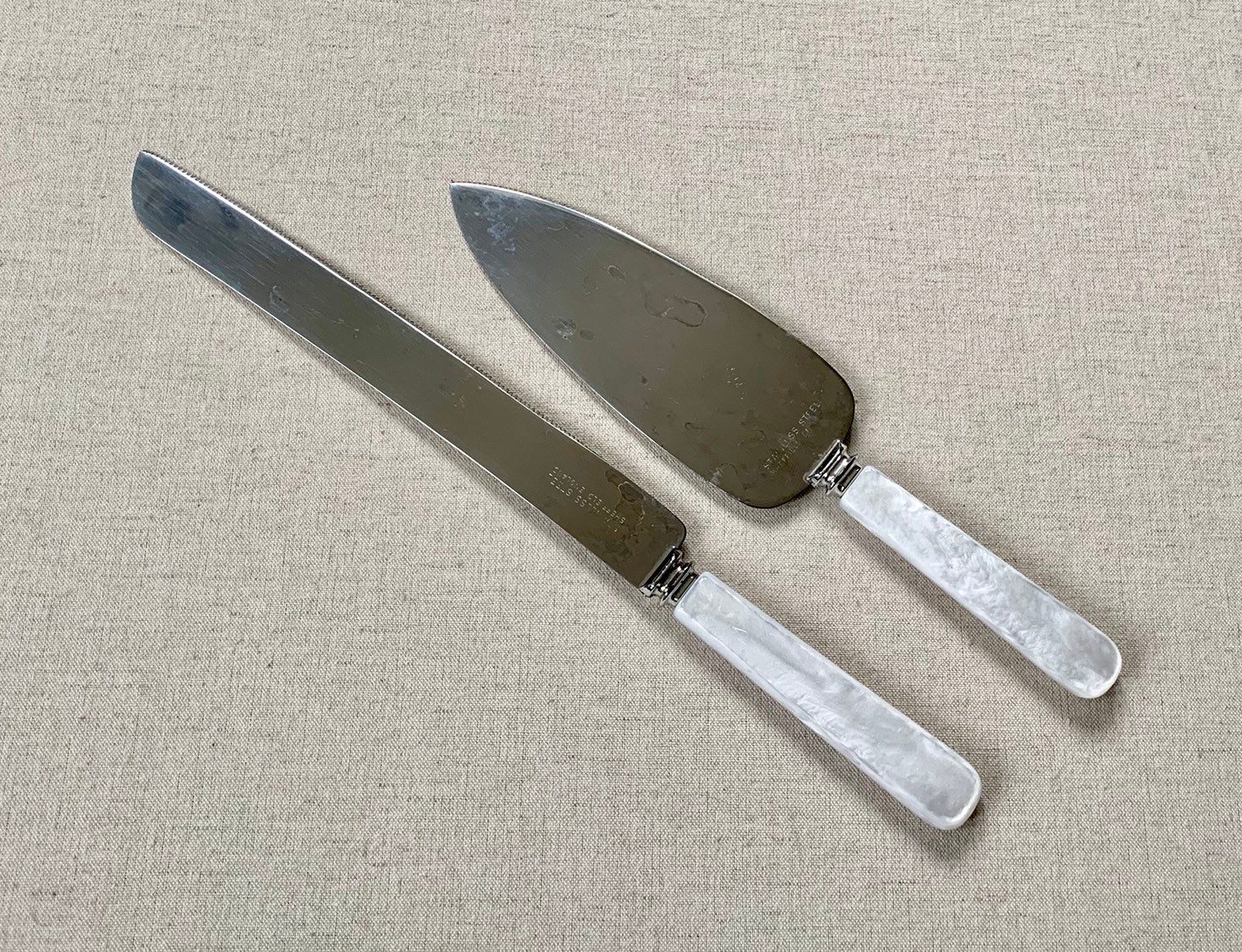 Cut your wedding cake in style with this vintage cake knife & server set with Sheffield, England pearlized handle and serrated stainless steel blade