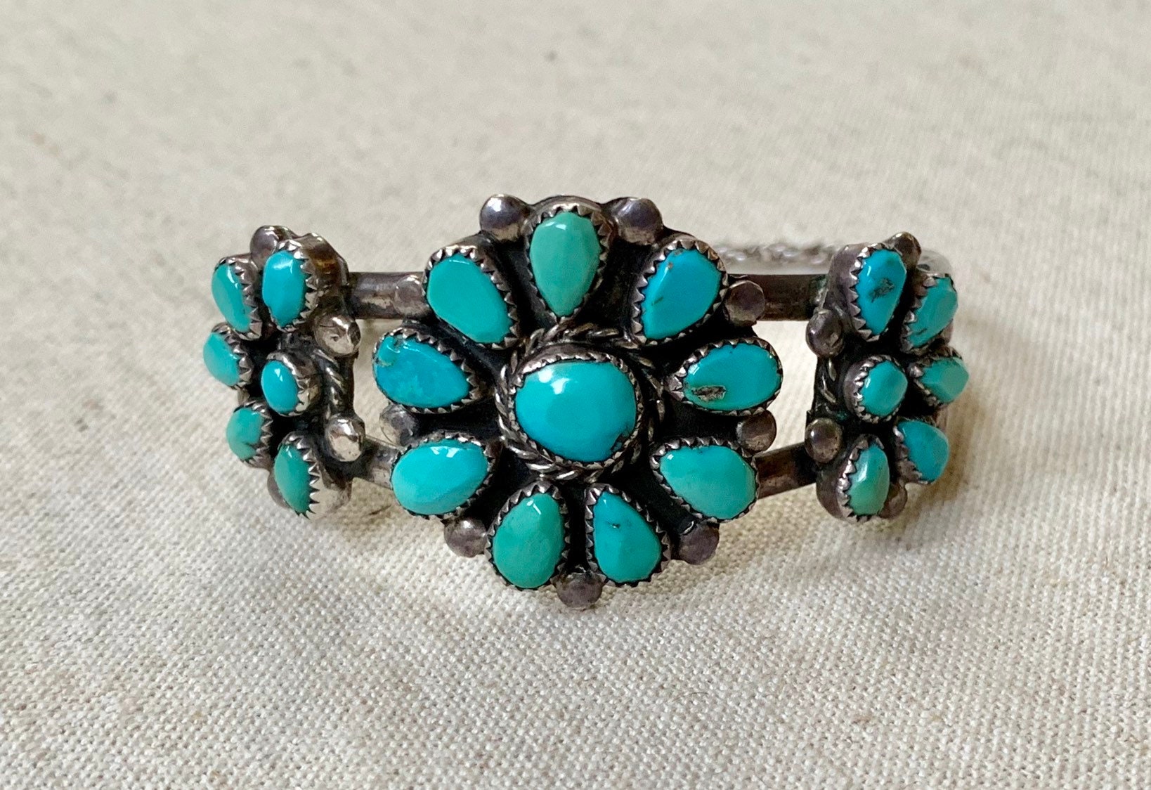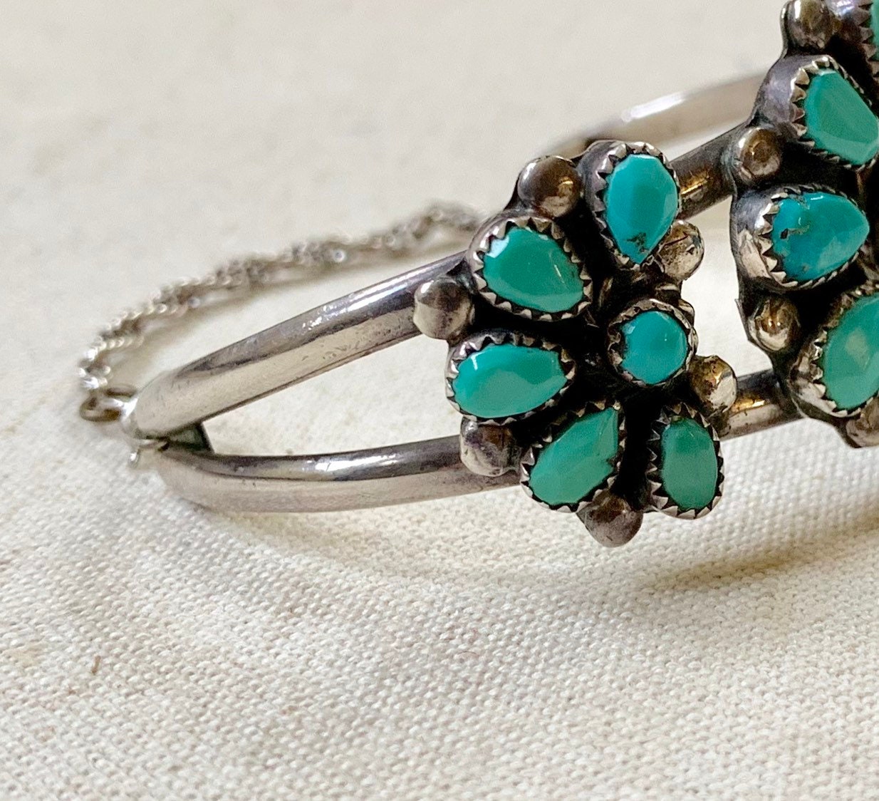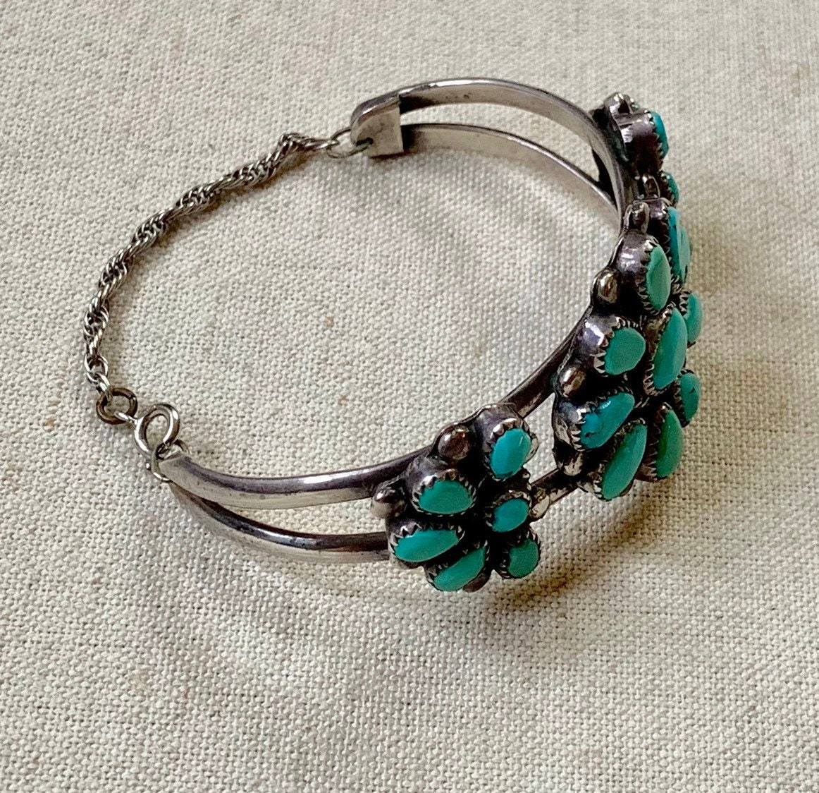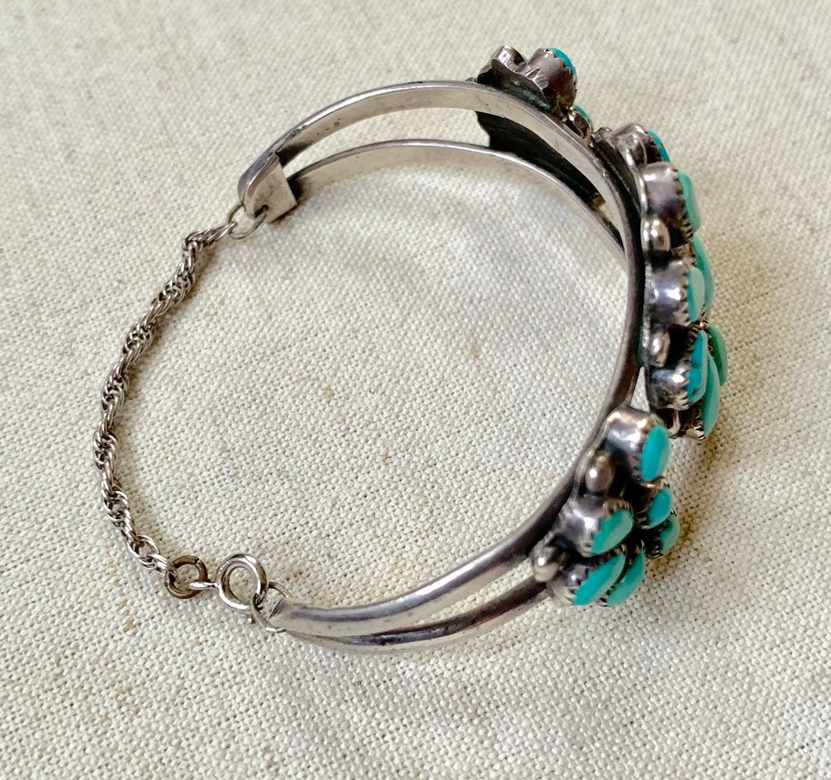 Beautifully crafted vintage Old Pawn Native American Zuni sterling silver and turquoise cluster bracelet / cuff with safety chain