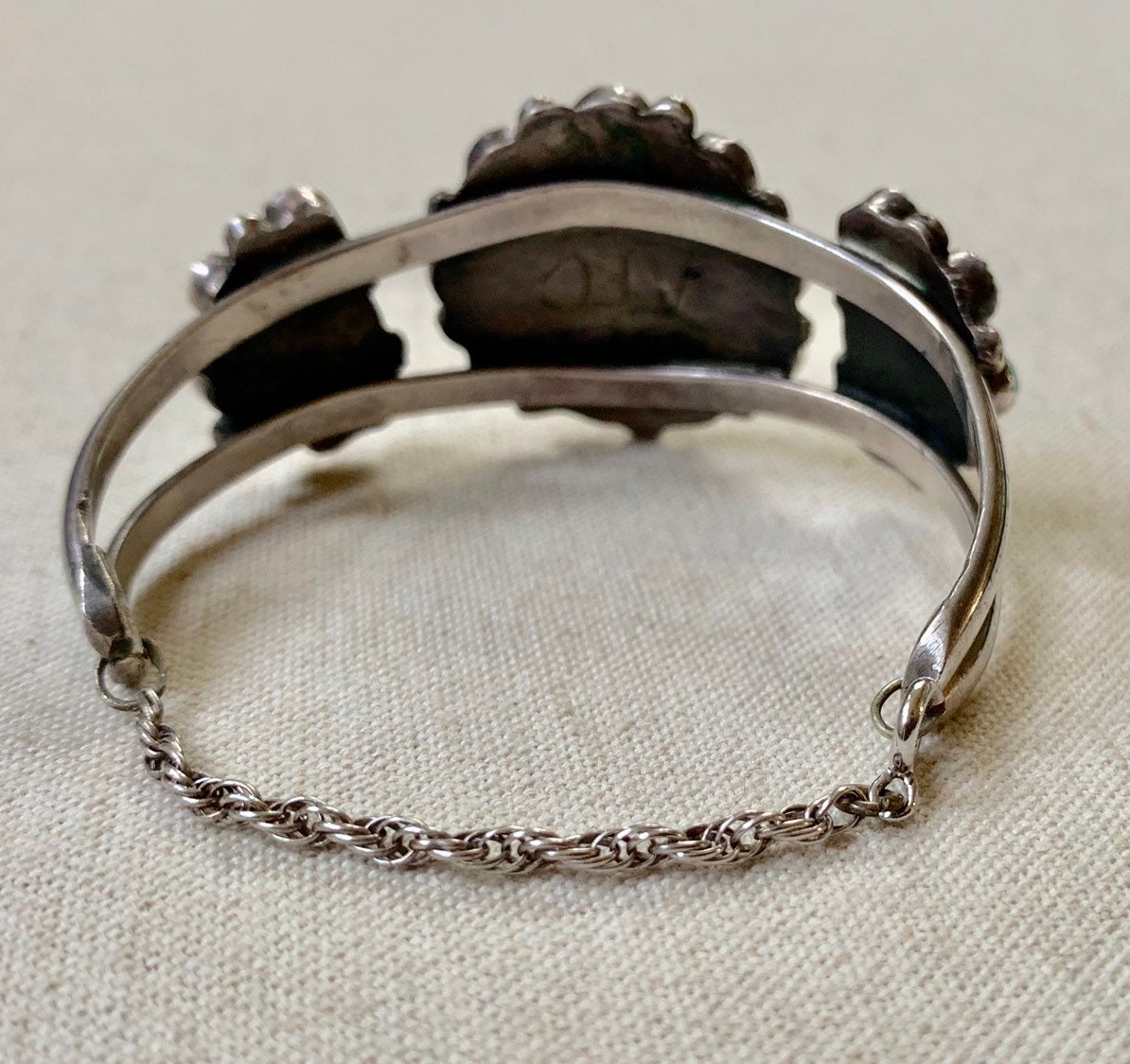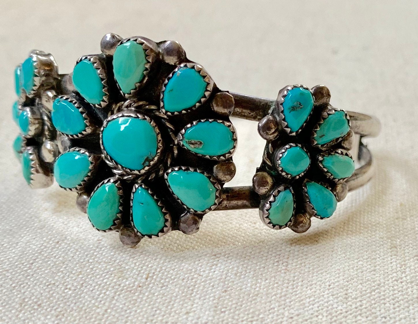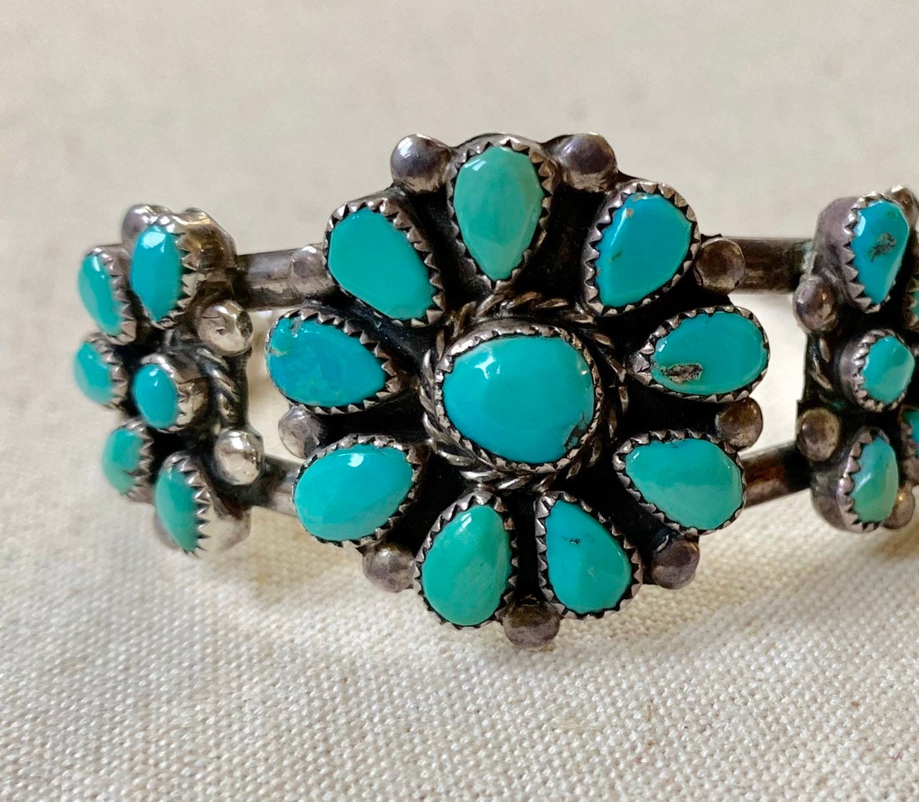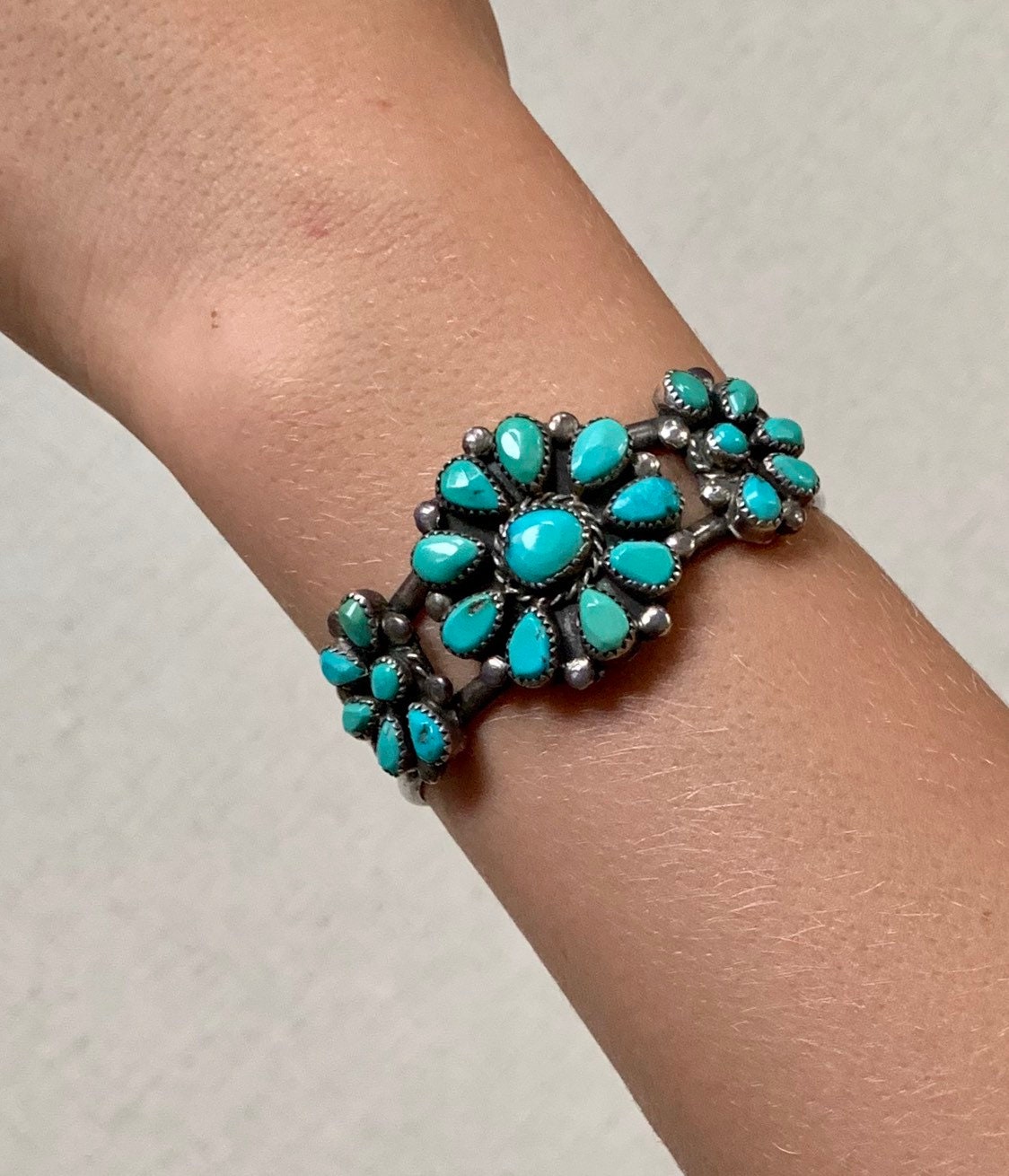 Beautifully crafted vintage Old Pawn Native American Zuni sterling silver and turquoise cluster bracelet / cuff with safety chain