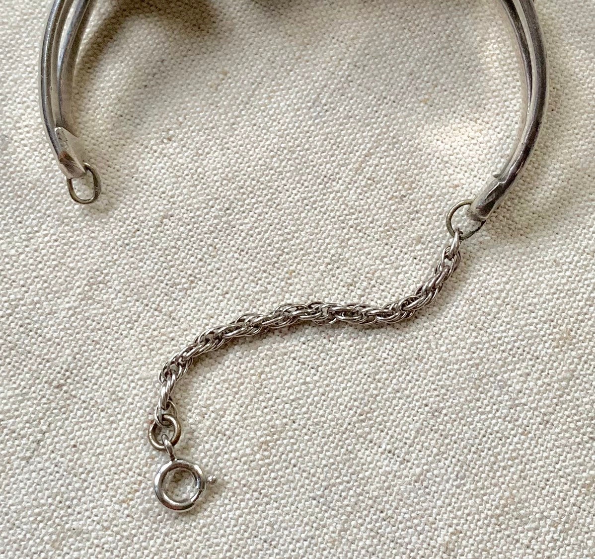 Good vintage condition with aged patina. The clasp on the safety chain clasp doesn’t appear to be old like the rest of the piece and doesn't close perfectly.