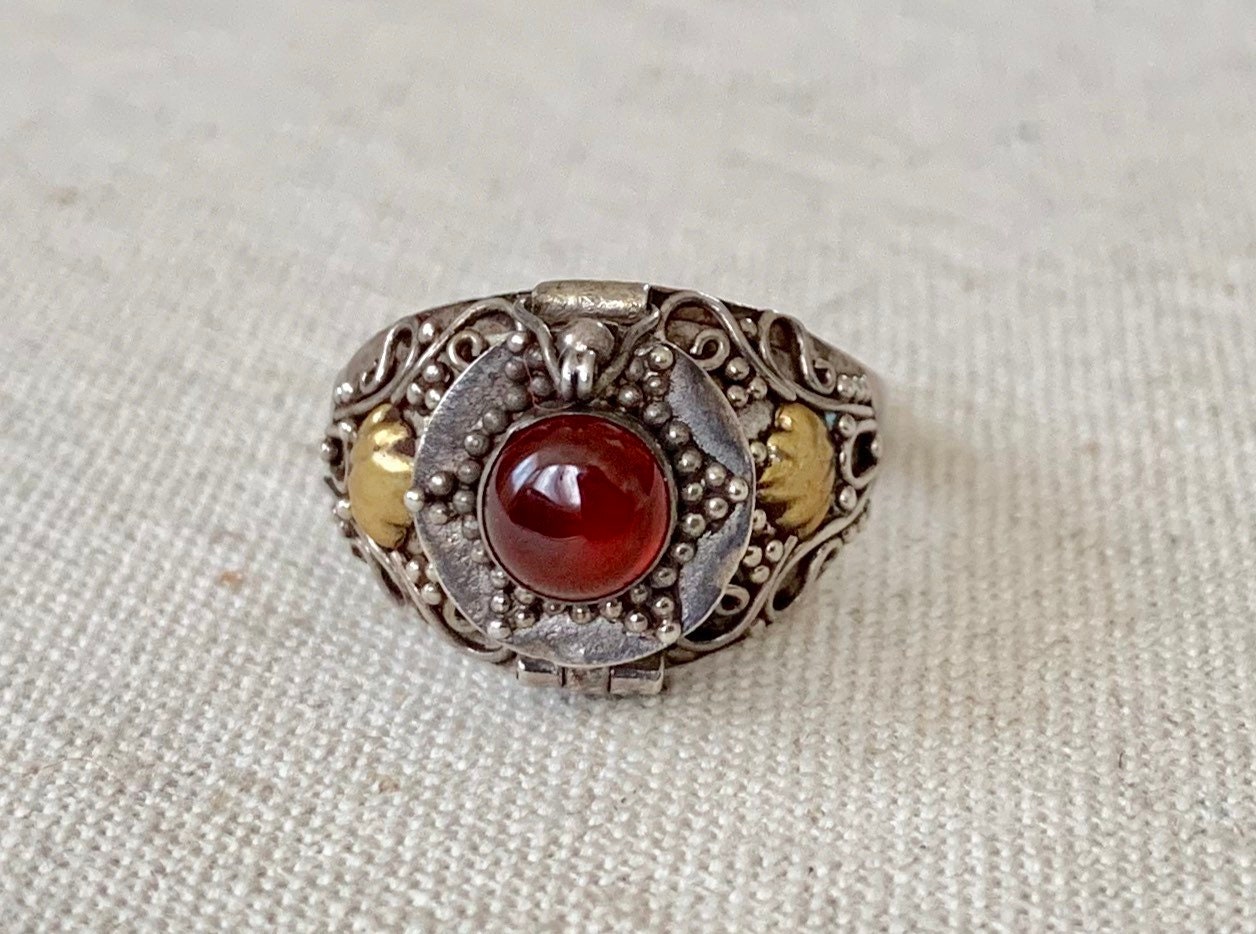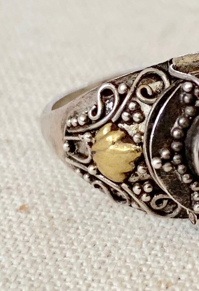 Antique sterling silver poison ring with very ornate silver & brass filagree.