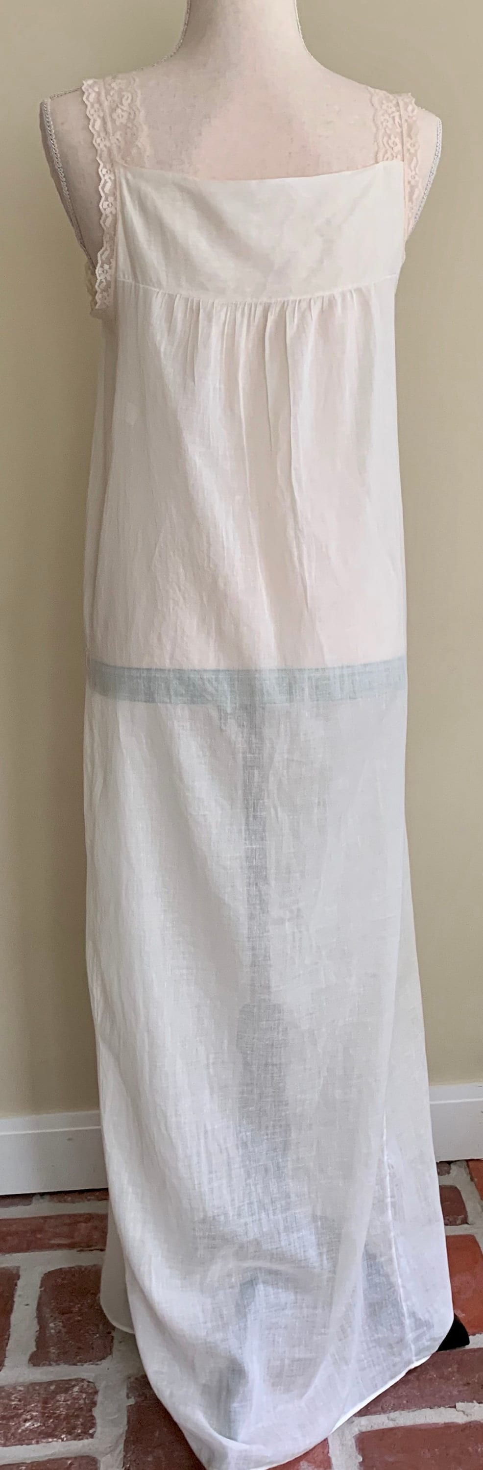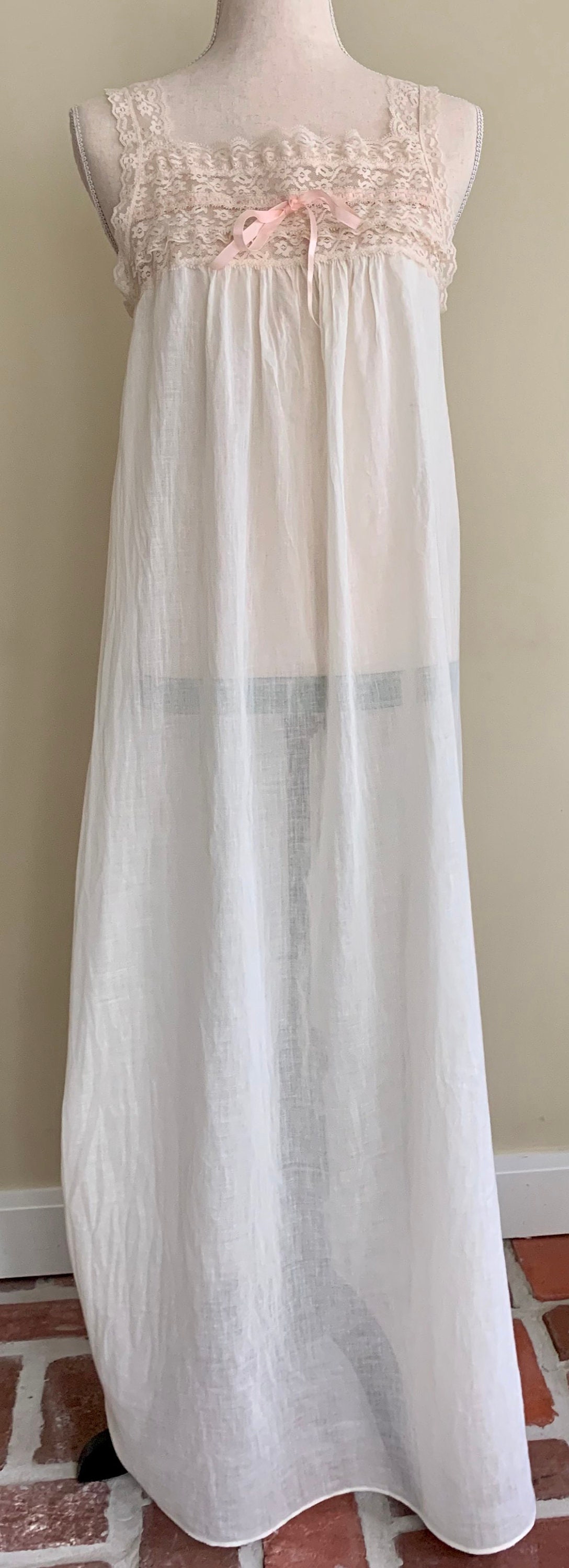 Romantic vintage Formfit ivory cotton nightgown with lace straps & trim and ballet pink ribbon details.