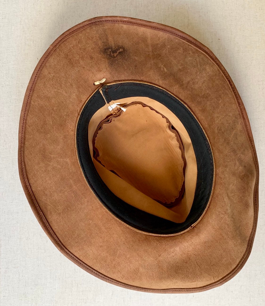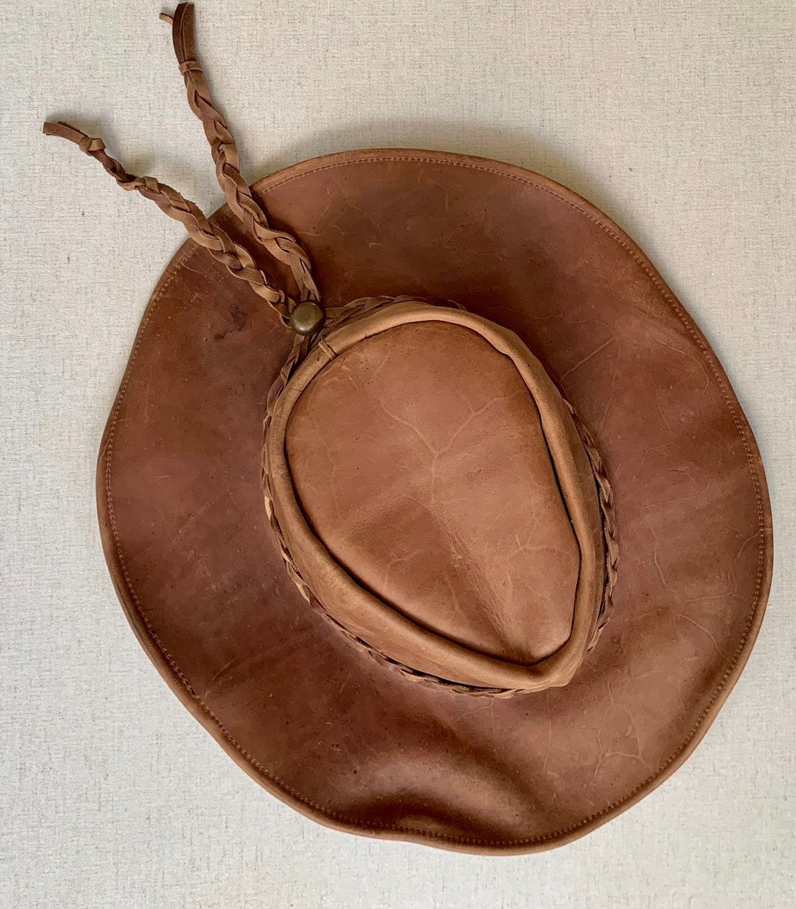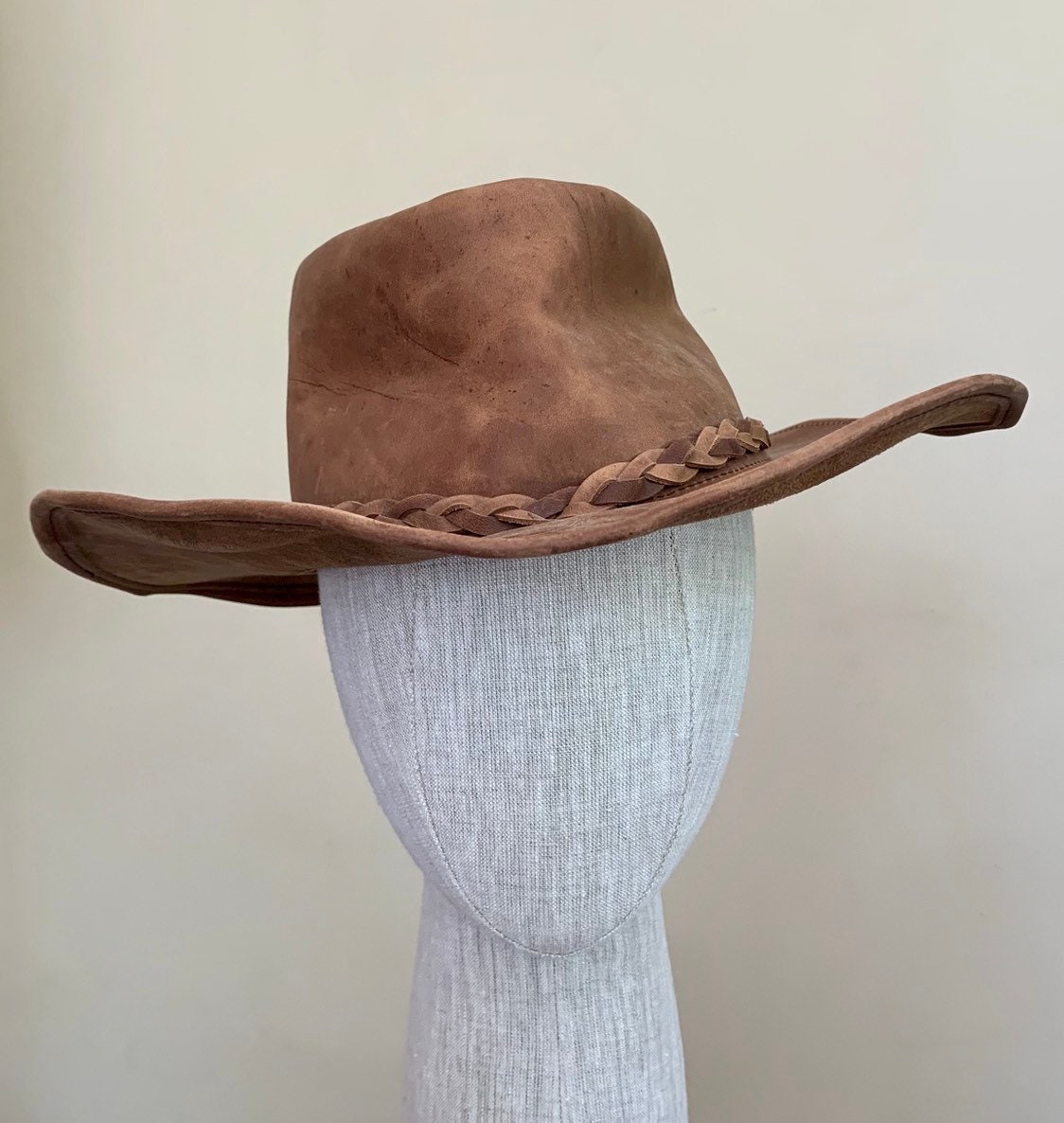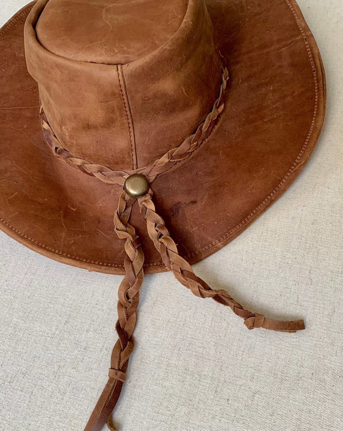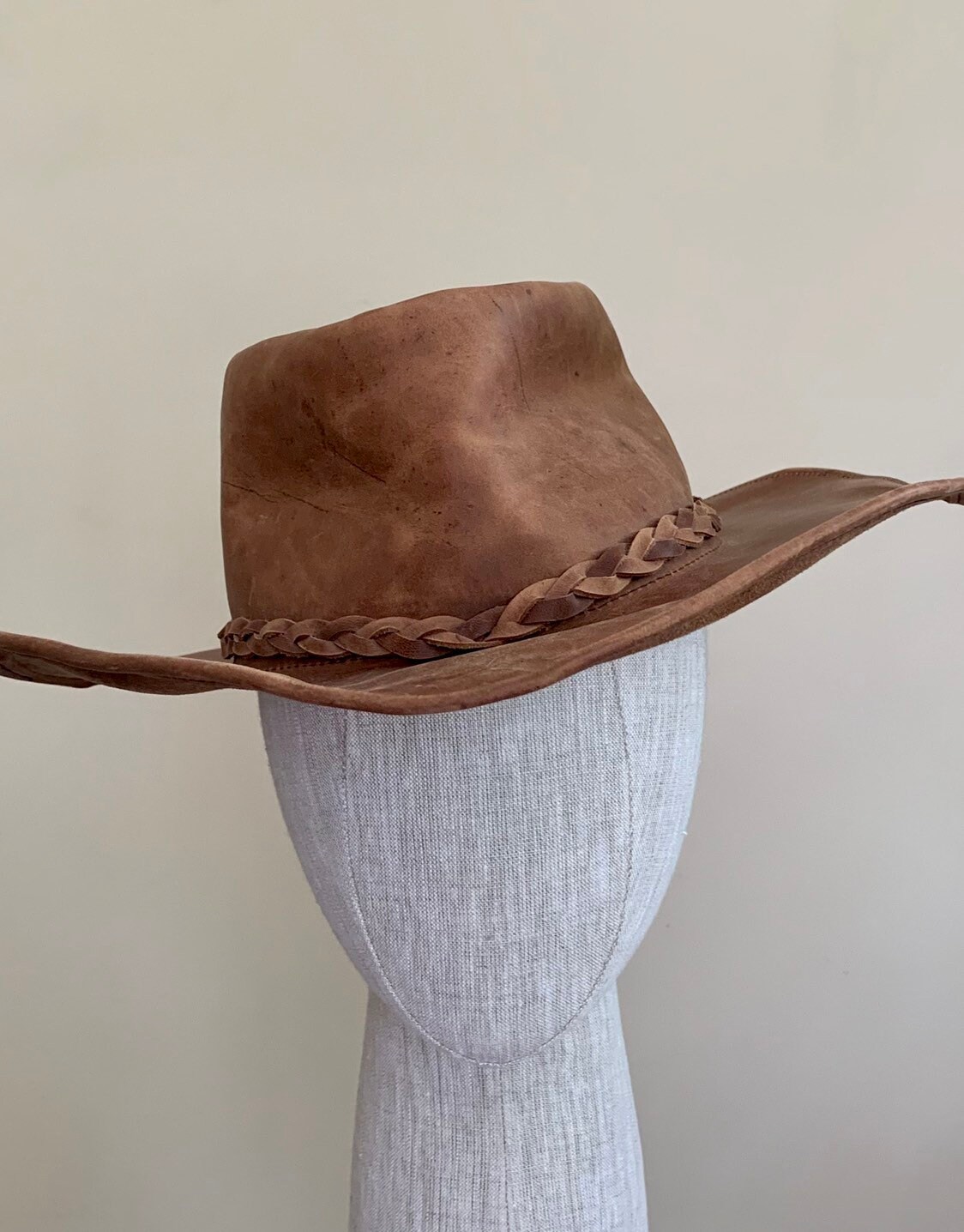 Vintage distressed brown leather cowboy hat with braided leather hat band.