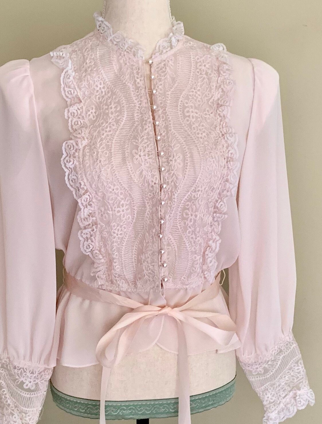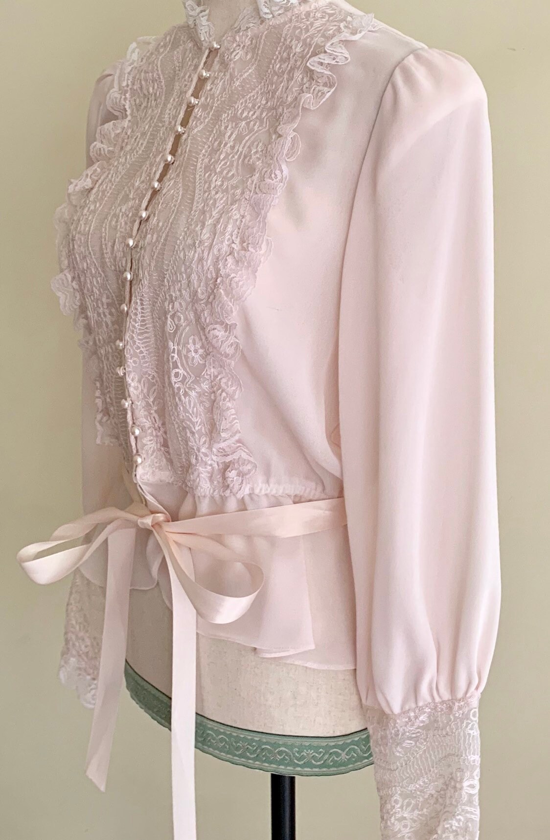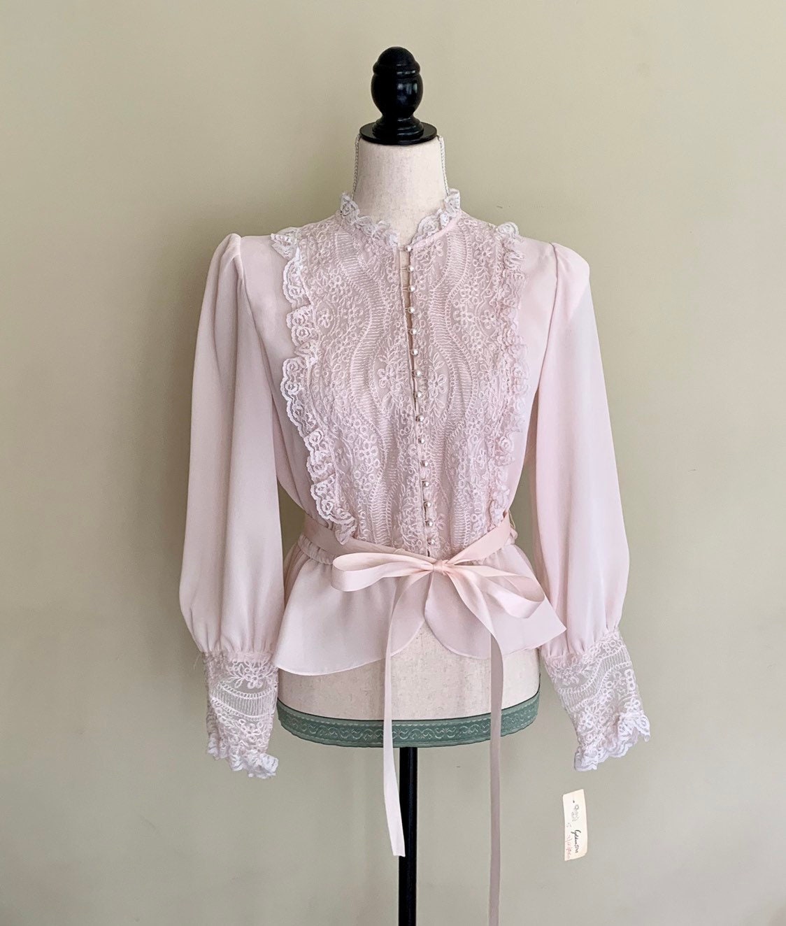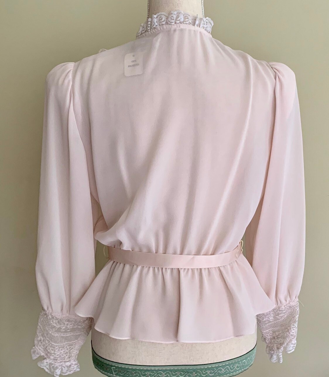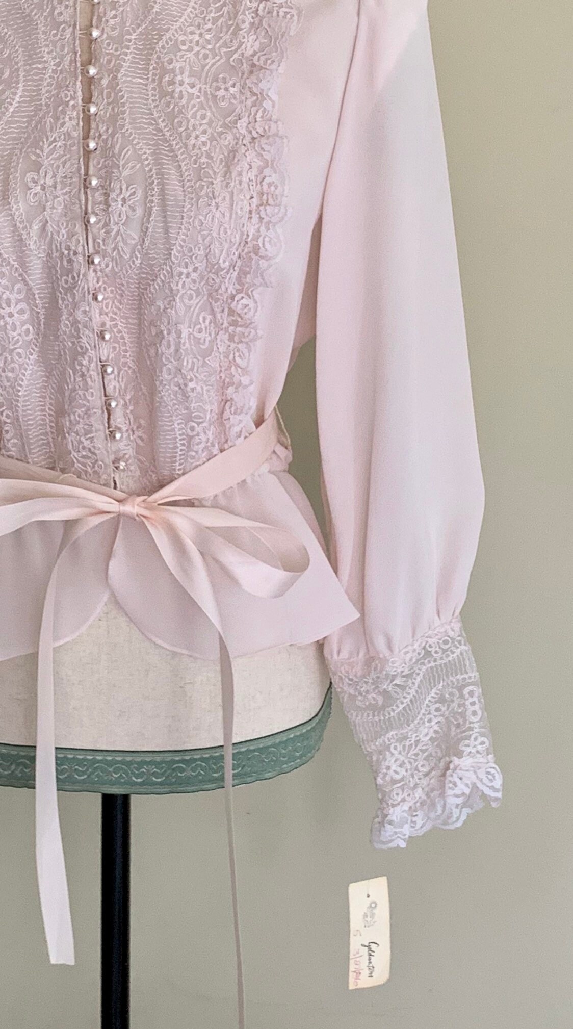 Lovely vintage 80's blush pink Victorian blouse with pearl buttons up the front, detachable ribbon waist and shoulder pads. Original tags still attached including the $72 price tag from 1986.