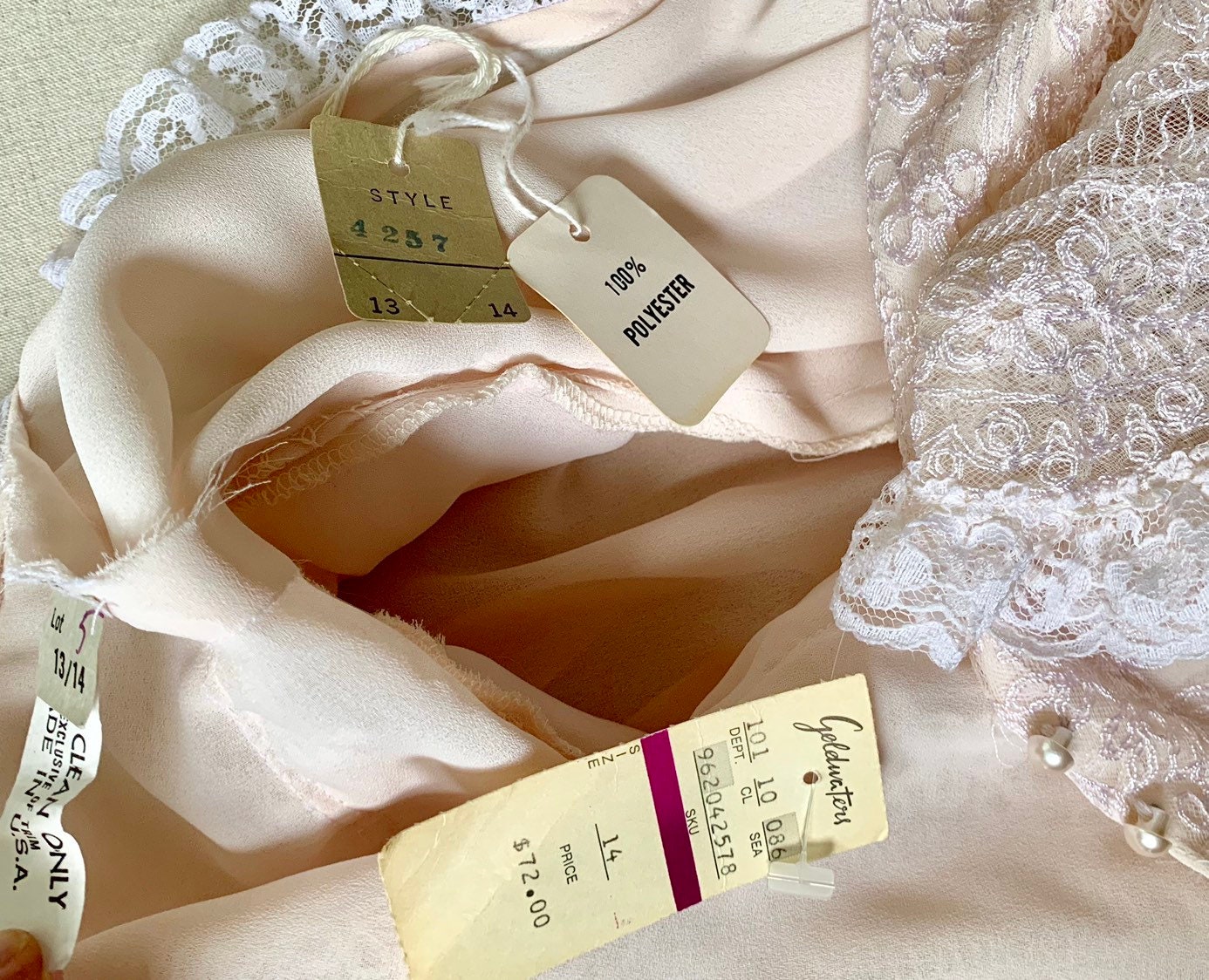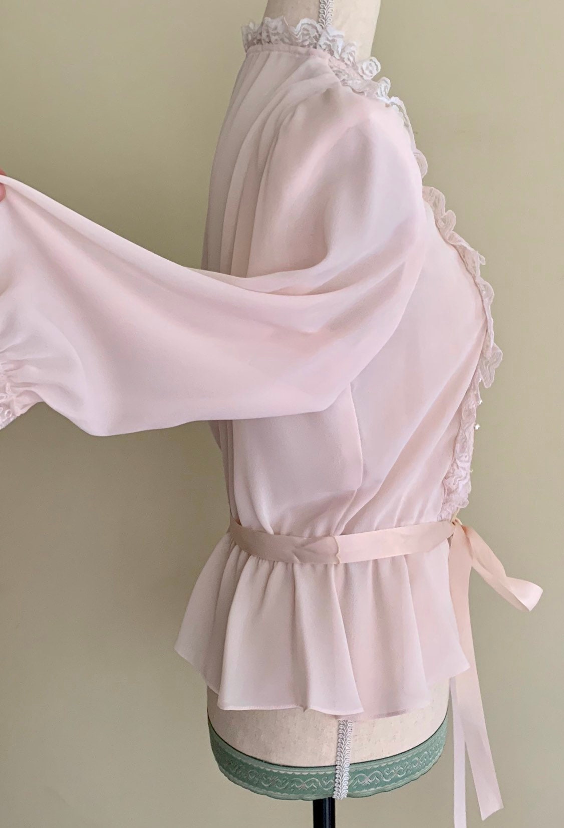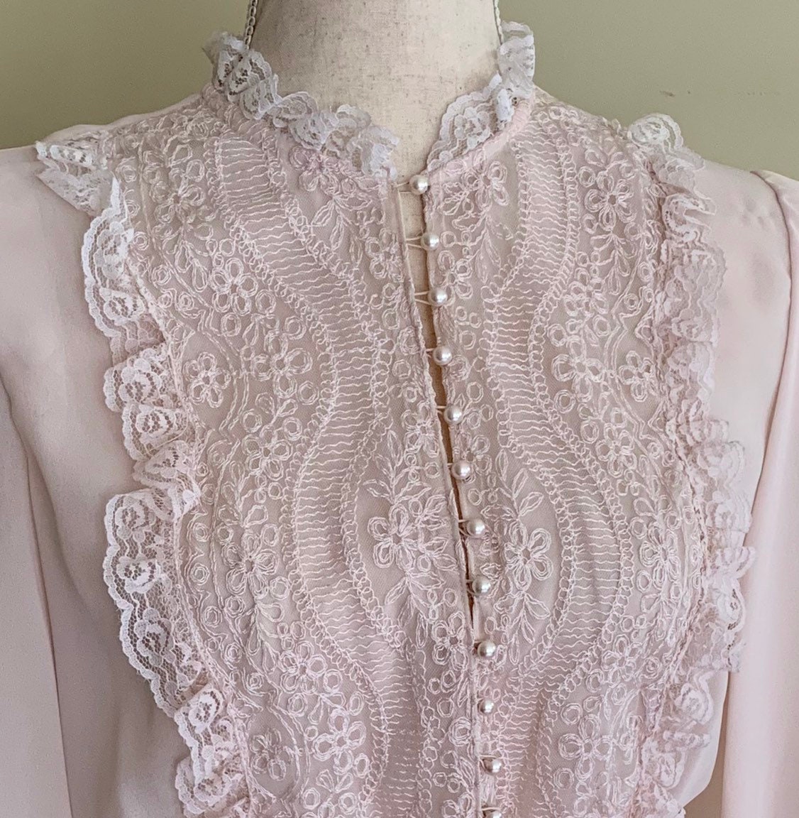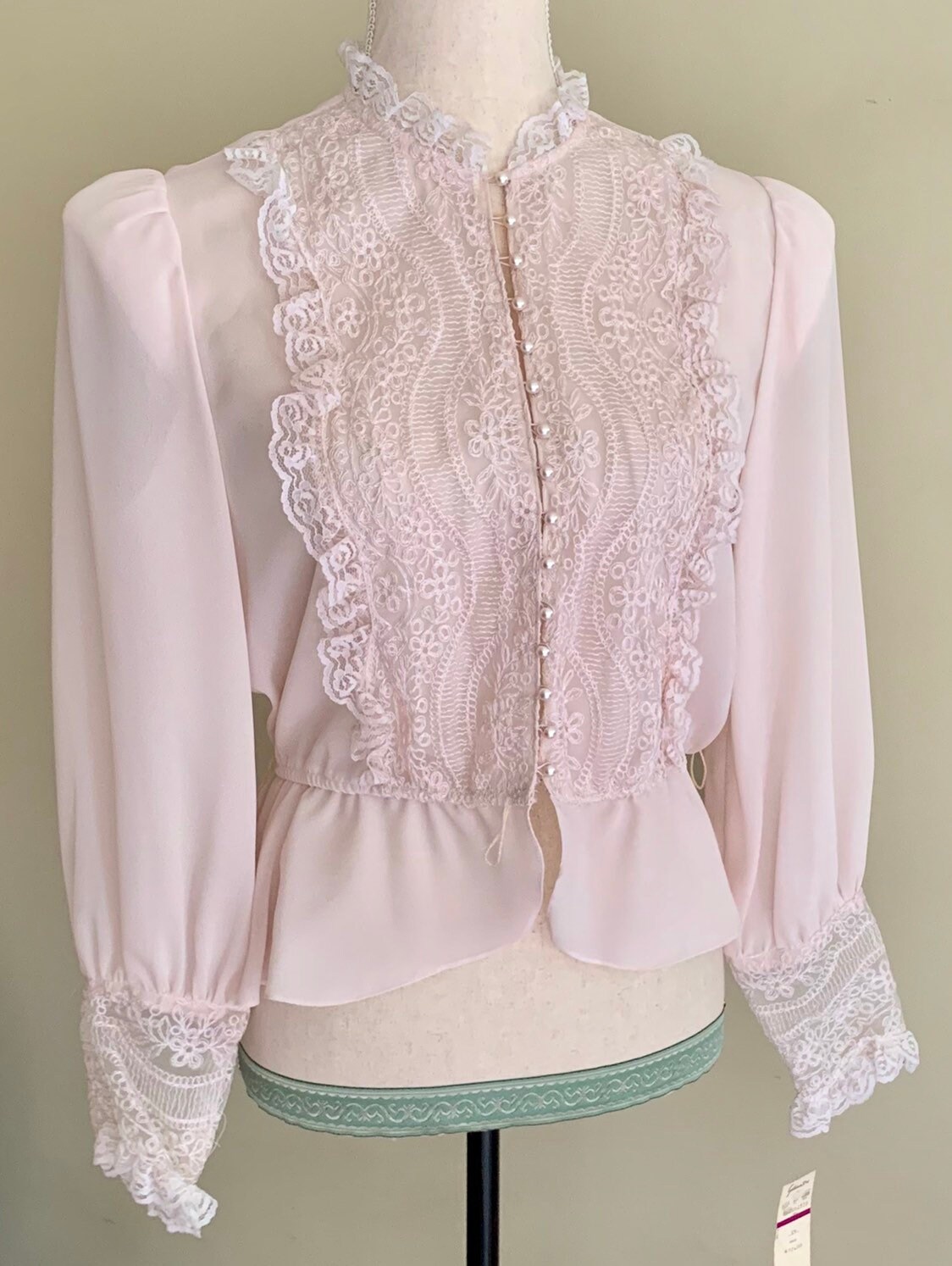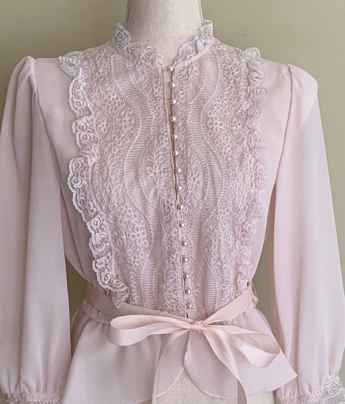 Lovely vintage 80's blush pink Victorian blouse with pearl buttons up the front, detachable ribbon waist and shoulder pads. Original tags still attached including the $72 price tag from 1986.