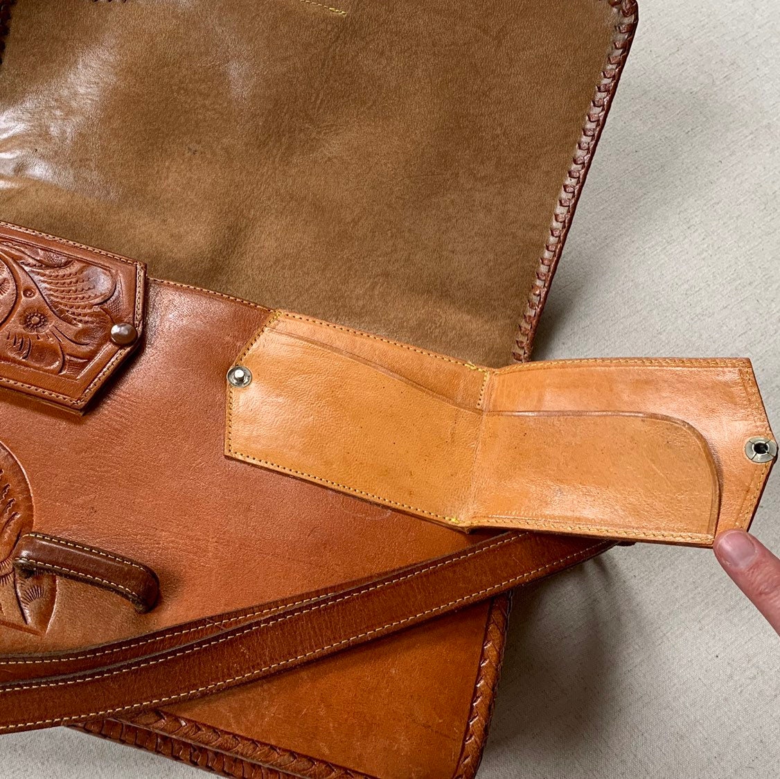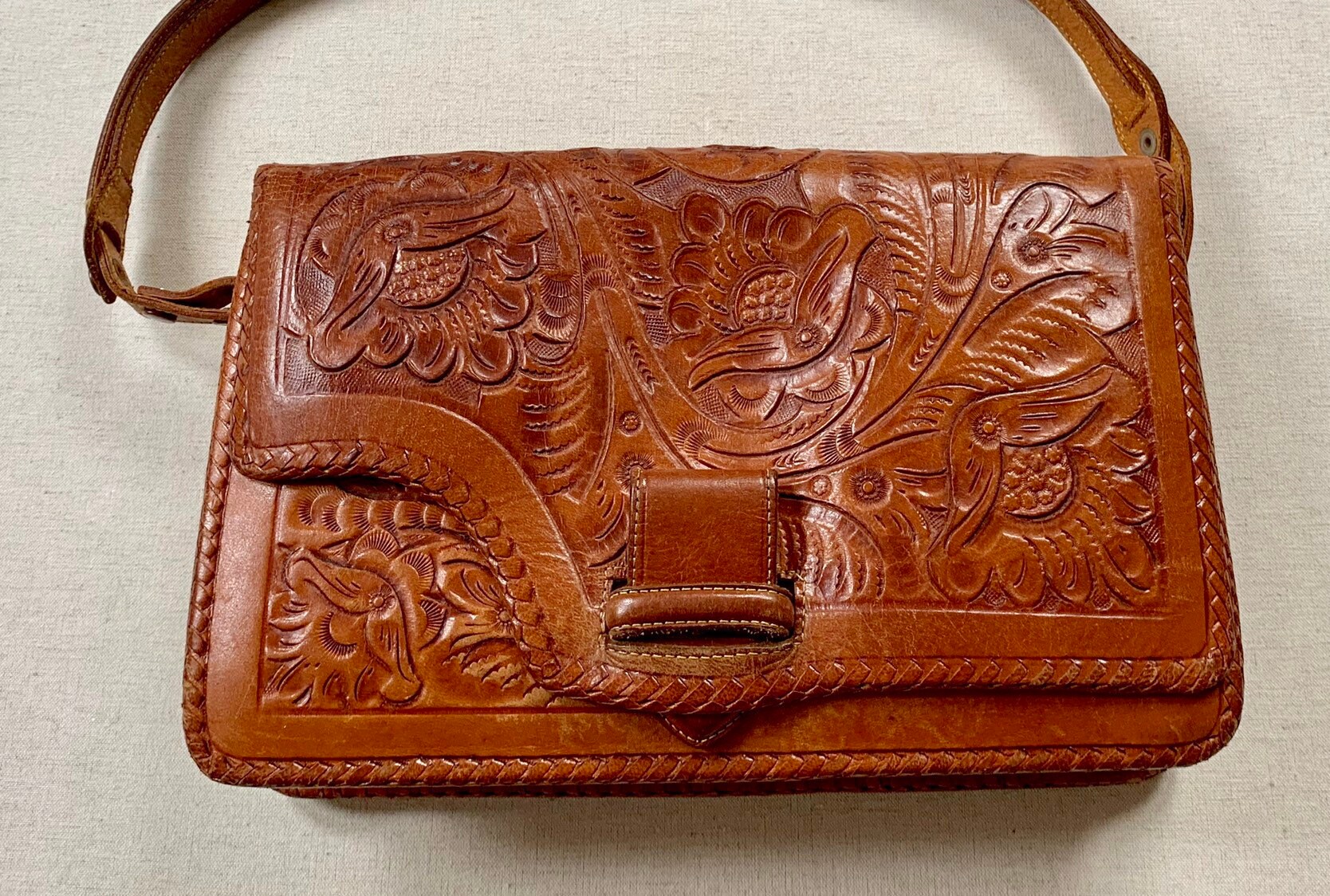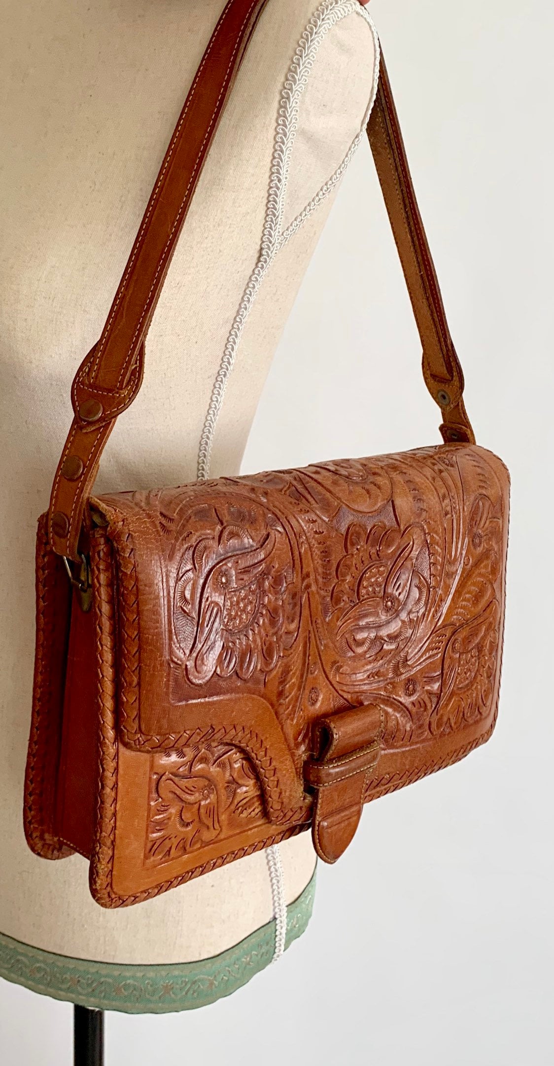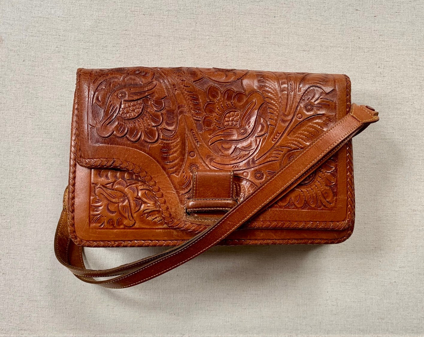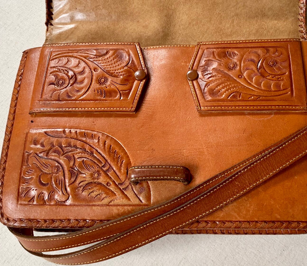 Solidly crafted handmade vintage 70's tooled leather purse with tooled leather strap and stitched details along the edges.