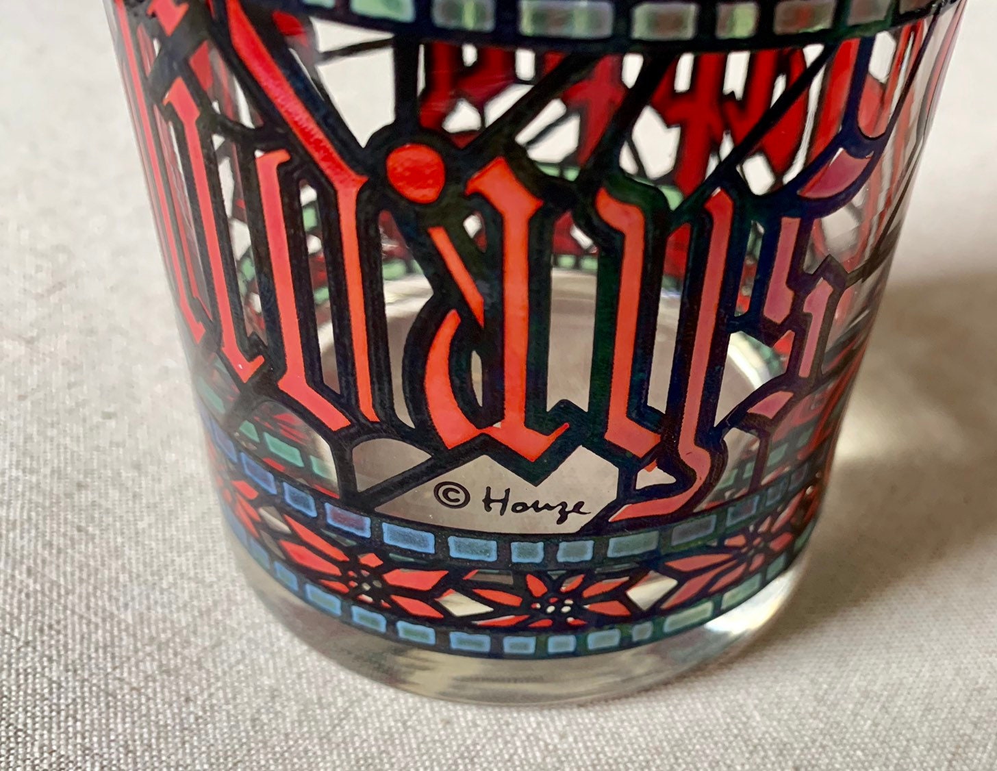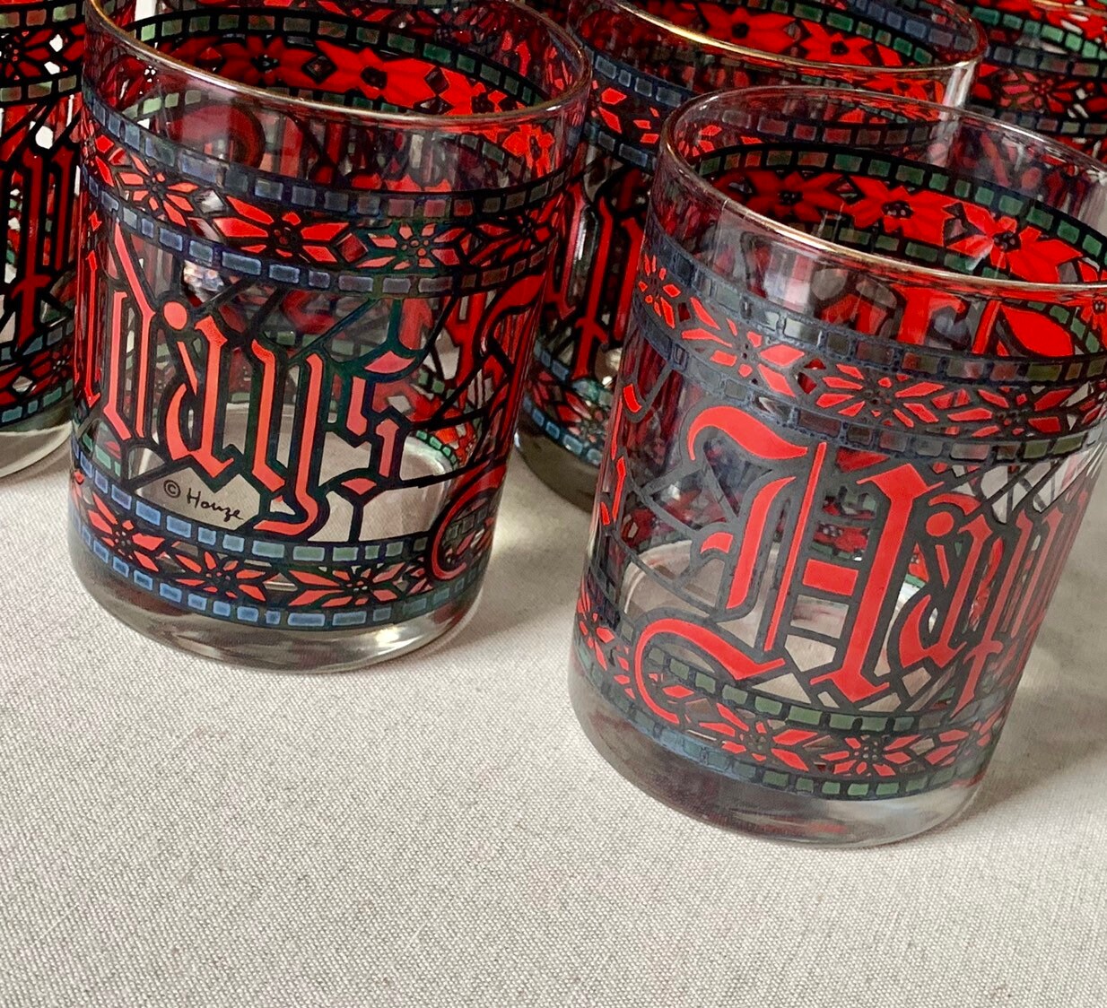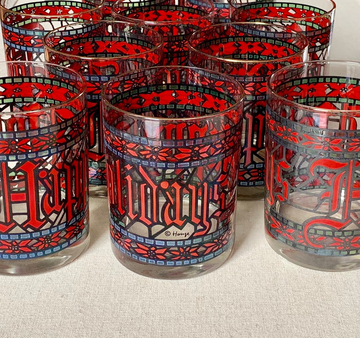 Vintage Mid Century Houze "Happy Holidays" rocks glasses with windowpane design and gold rims