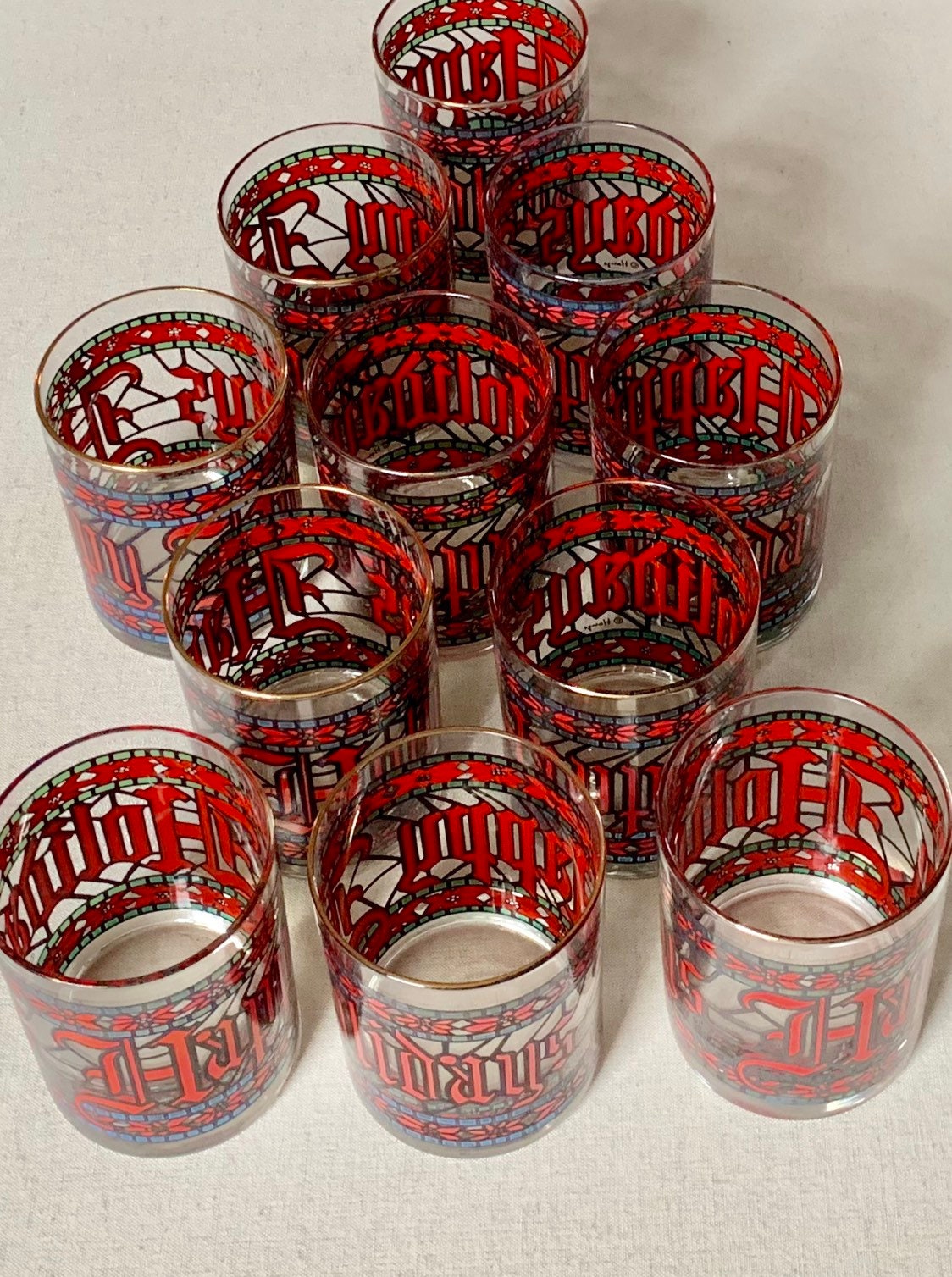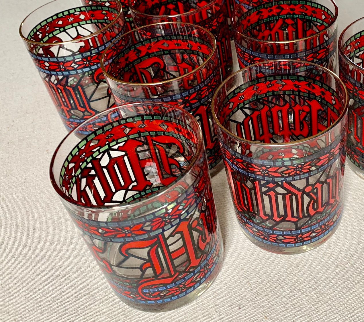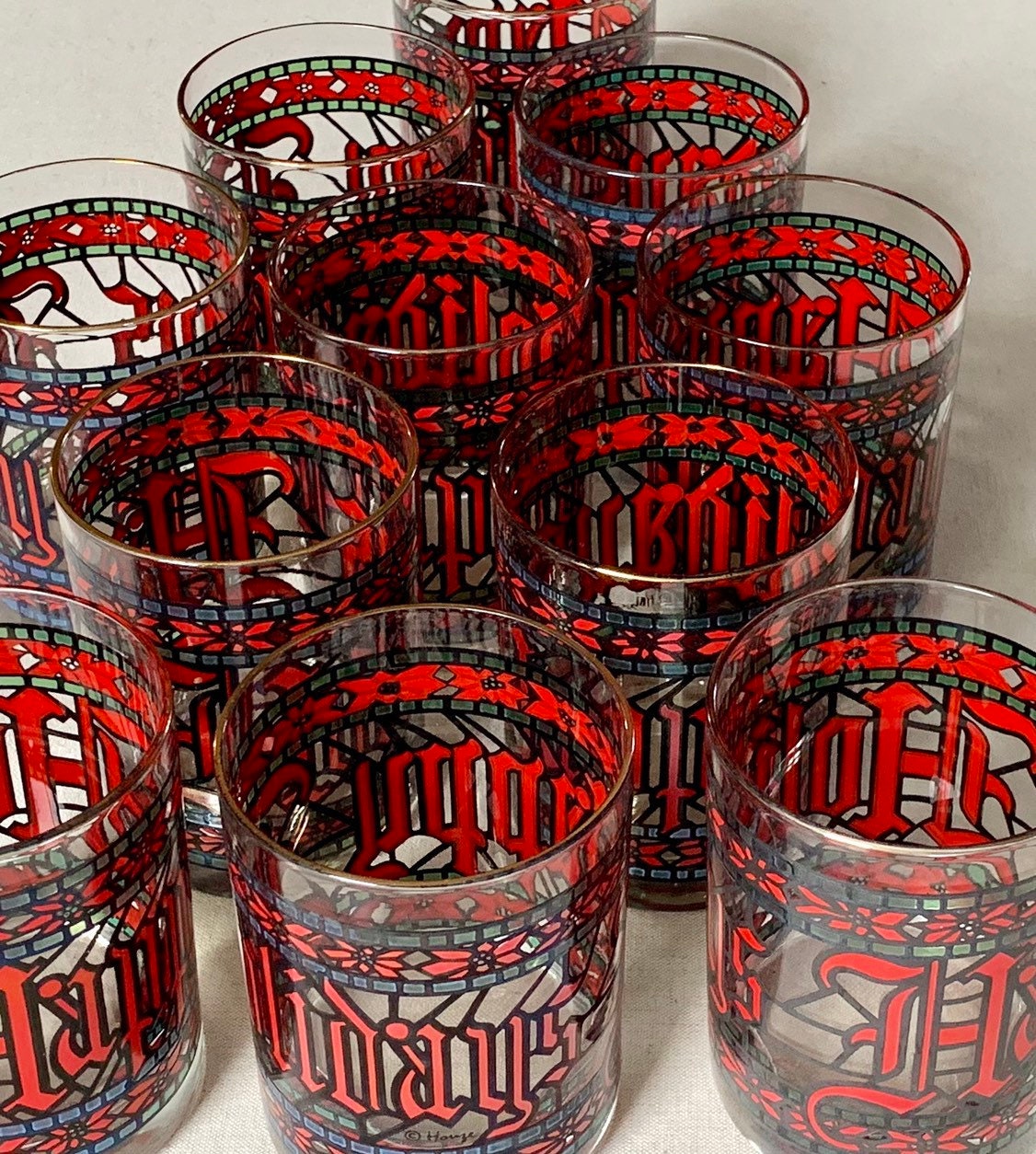 Vintage Mid Century Houze "Happy Holidays" rocks glasses with windowpane design and gold rims