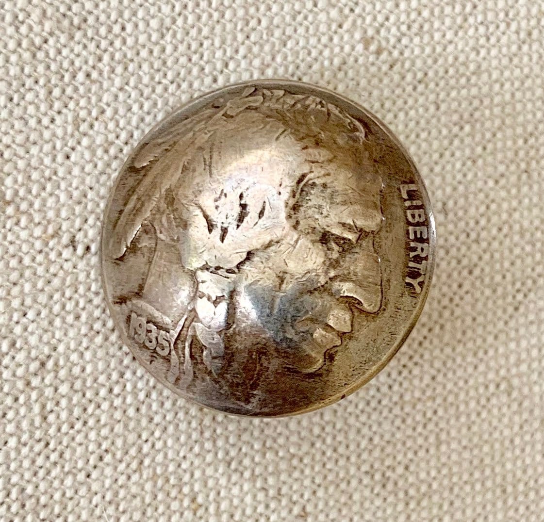 Handsome set of 9 handmade vintage buffalo nickel buttons most likely crafted in the New Mexico region. Came with the "Shalako Traders of Old Santa Fe" business card.