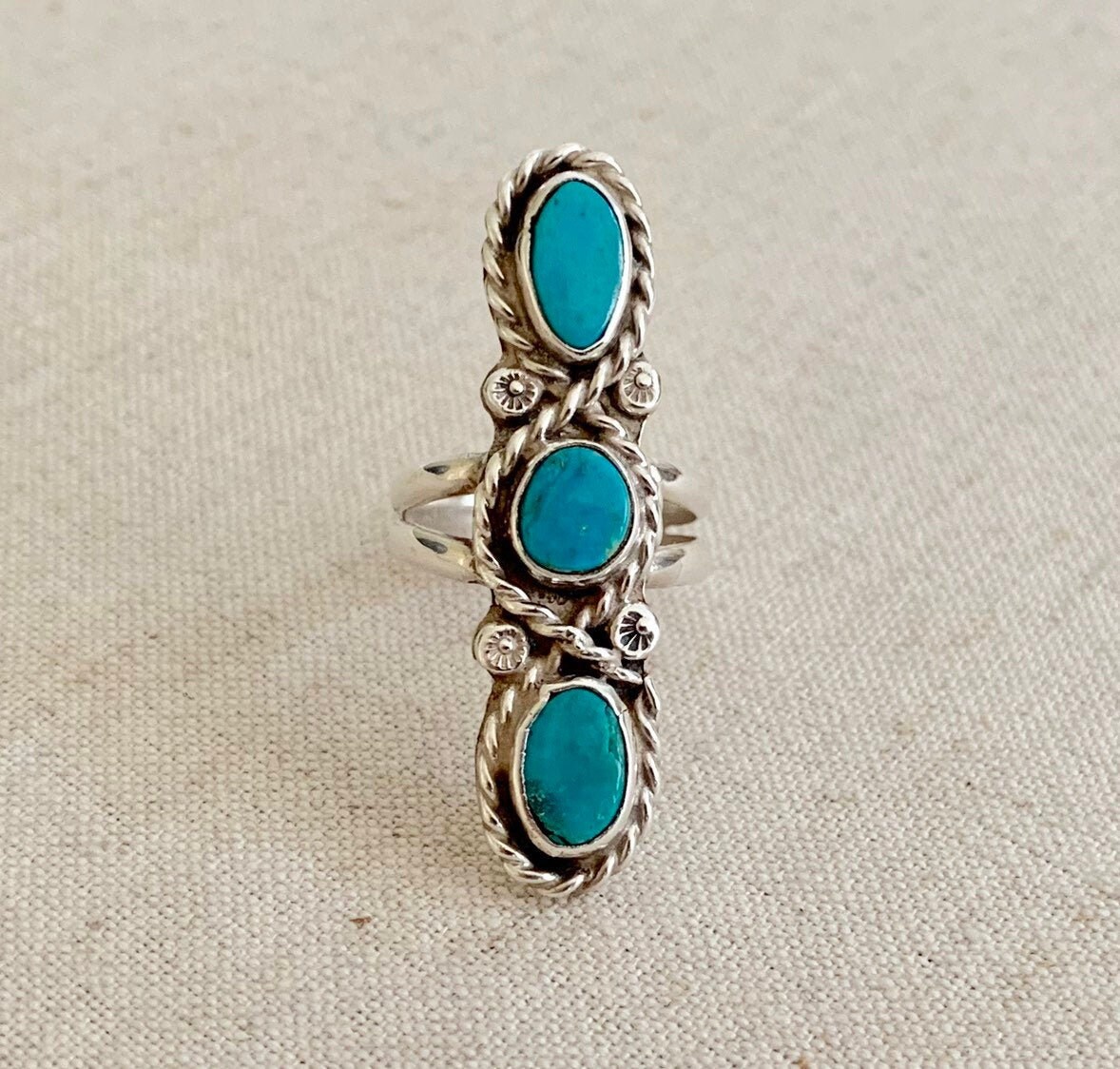 Vintage elongated Native American Navajo sterling silver ring with three turquoise stones
